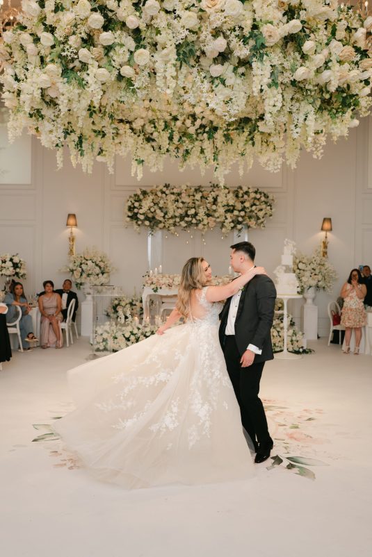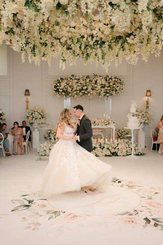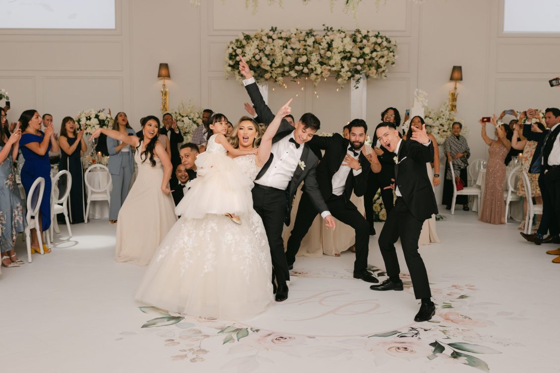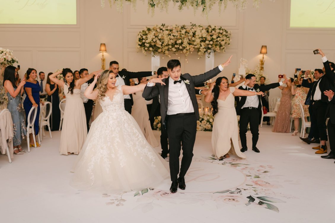From the plein-air wedding ceremony to the dance floor complete with a floral canopy — where the entire wedding party had their dancing entrance into the reception, choreographed by the groom! —we’re in love!