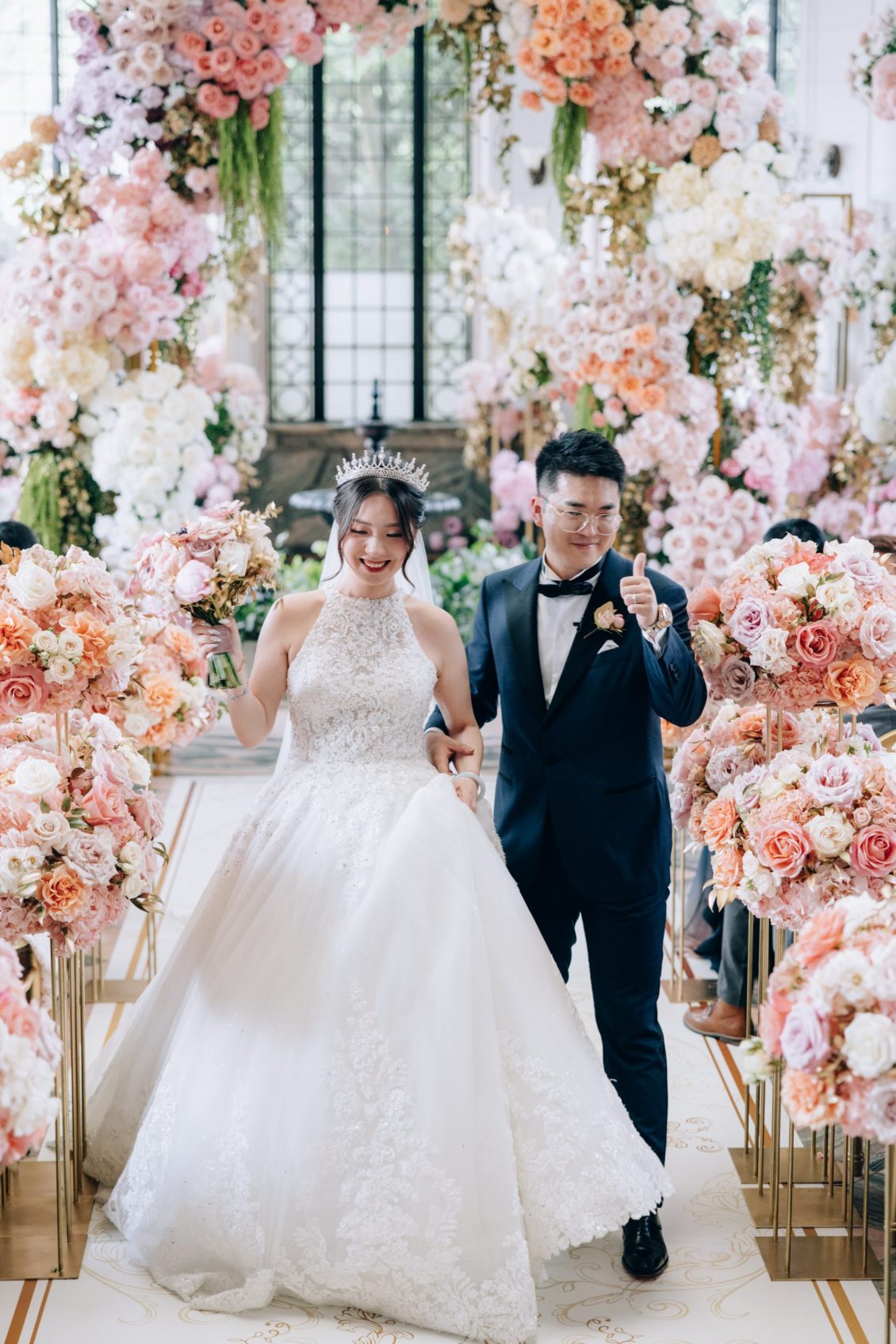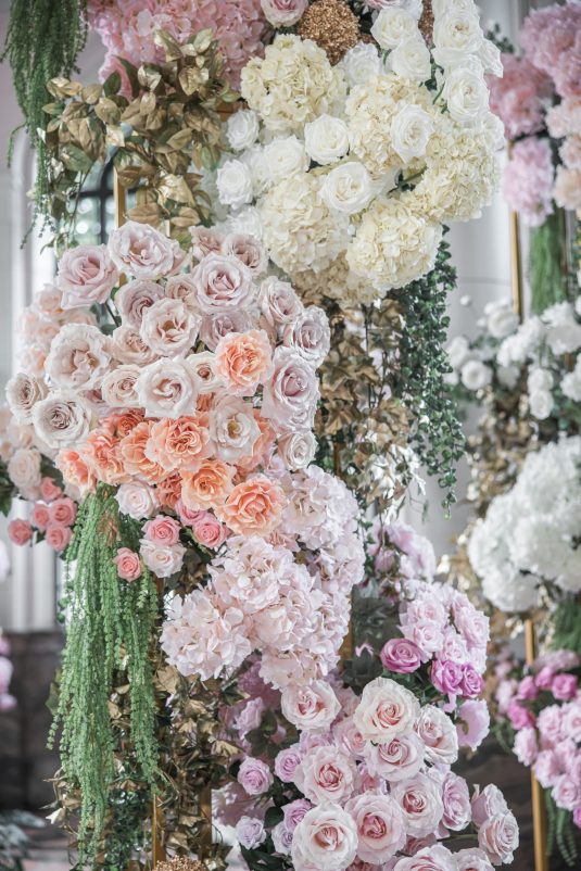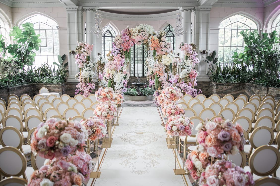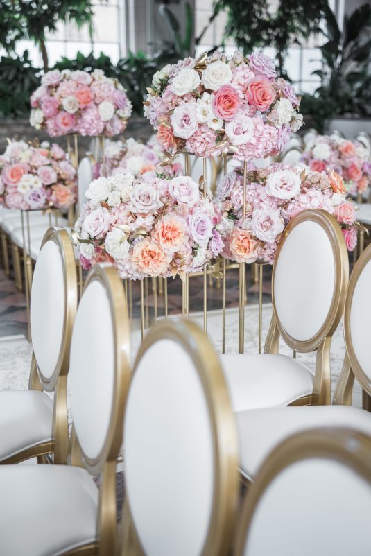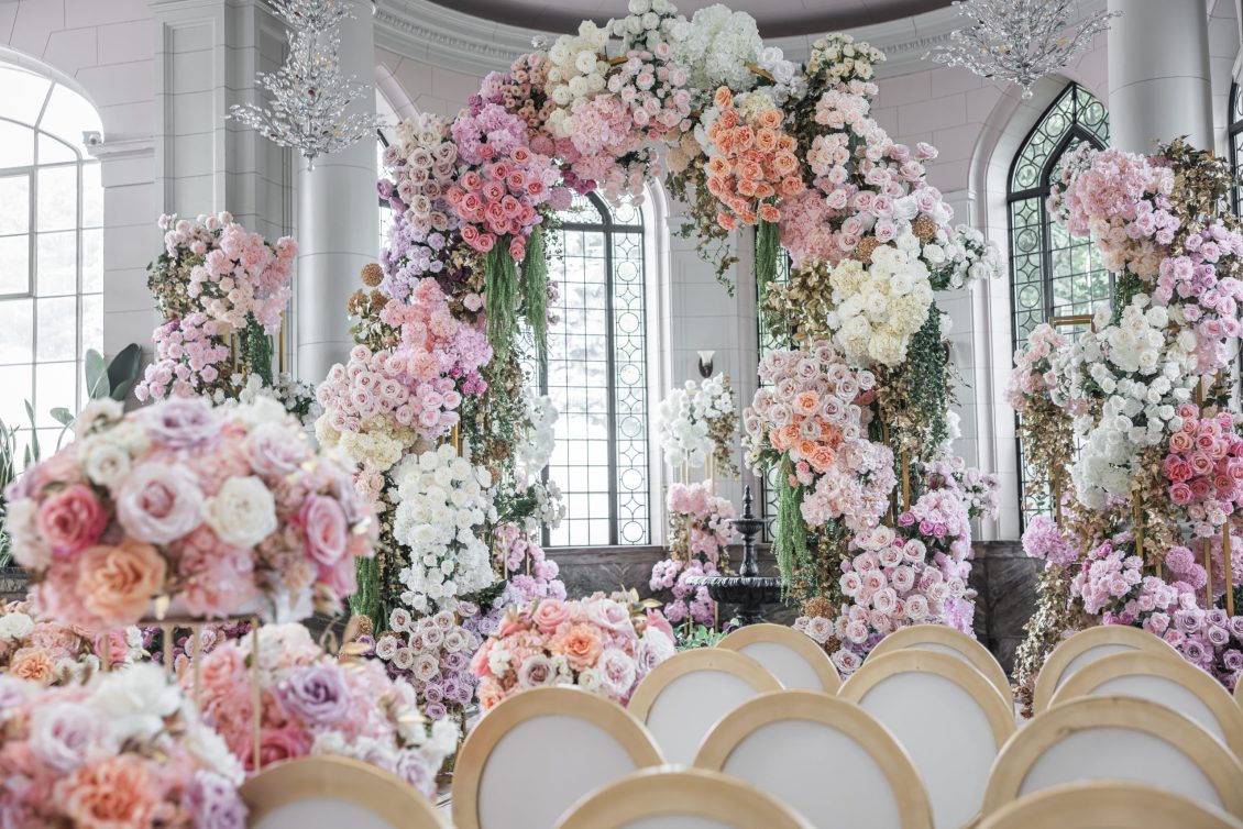 in Toronto, Canada. Happy tears were shed during the couple’s “first-look” as the bride walked down the ceremony aisle amongst pastel-hued flowers before saying their “I Dos” beneath a 12-foot floral arch. We’re in love with this wedding ceremony’s stylish garden vibes!