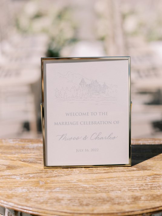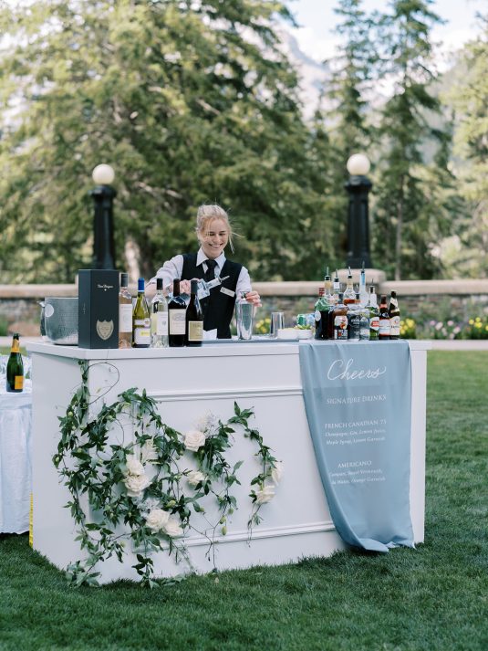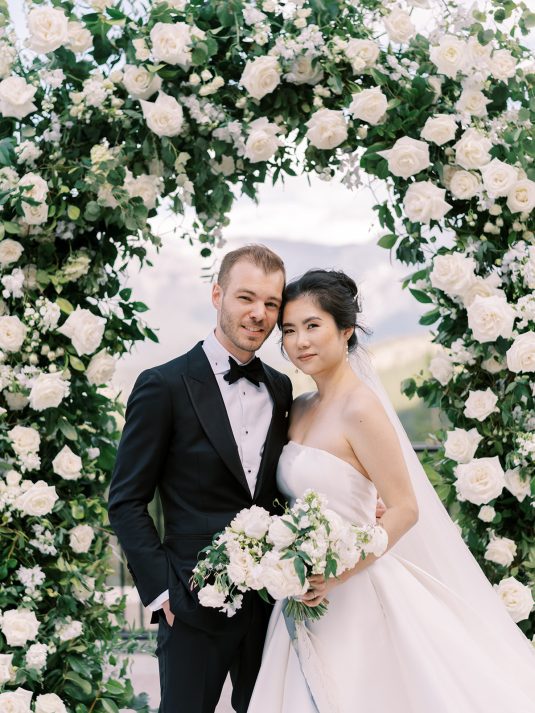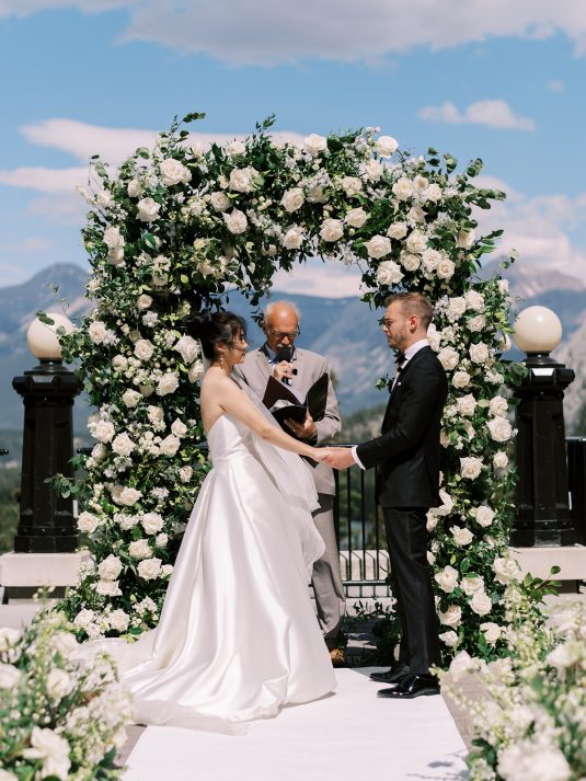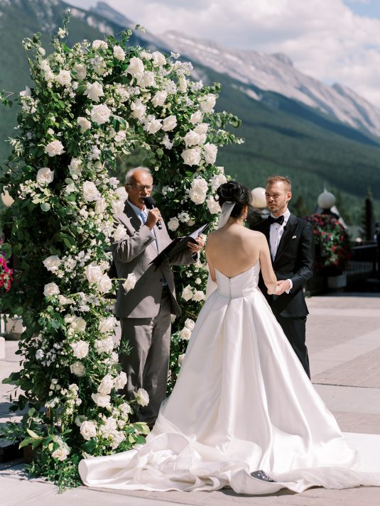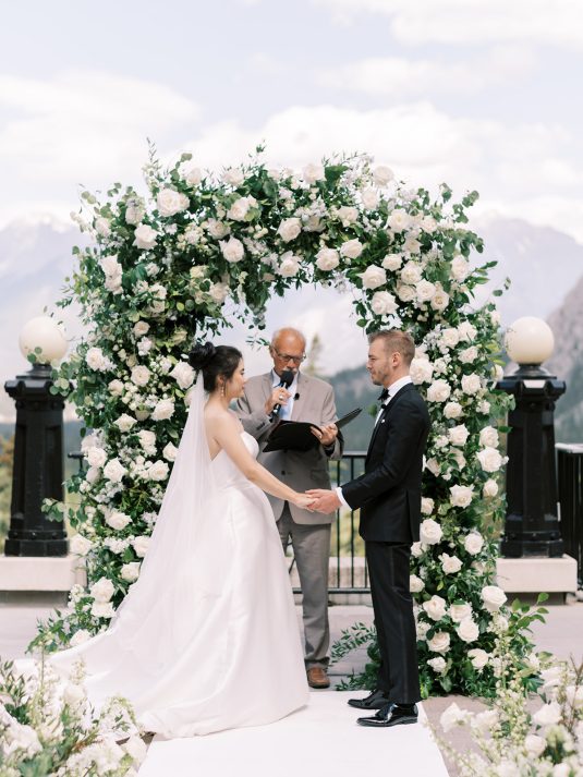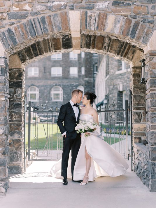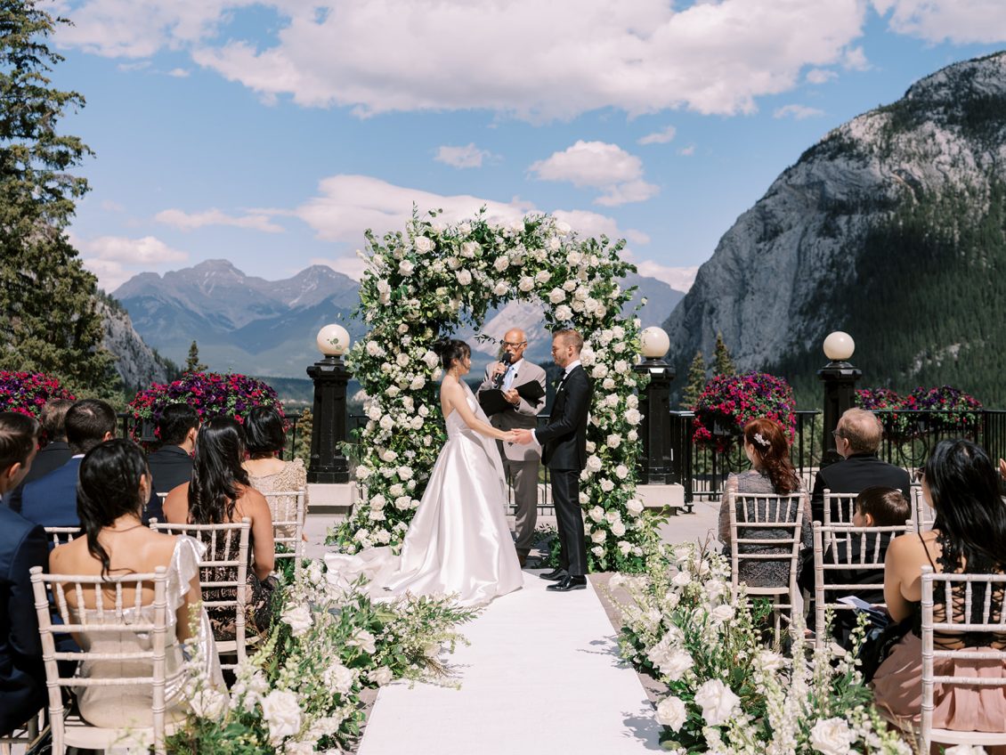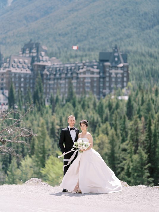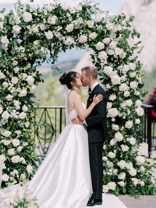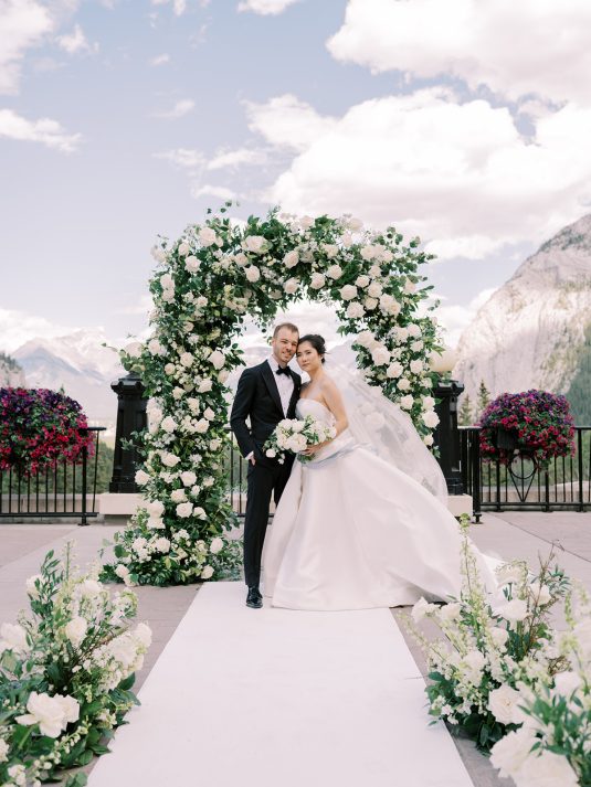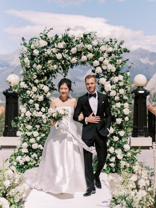 When San Francisco-based Misoo and Charles postponed their wedding in 2021, they eloped on their would-be honeymoon in Positano, Italy. They brought back elements to tie into their eventual destination wedding celebrations at the iconic Fairmont Banff Spring in Alberta, Canada. With the magnificent Canadian Rocky Mountains as the backdrop, a plein air cocktail hour serving “French Canadian 75” cocktails was followed by an elegant reception at the hotel’s ballroom, where guests dined beneath giant arches of fresh greenery. Talk about bringing the outdoors in! Scroll to see the details of this stunning event!