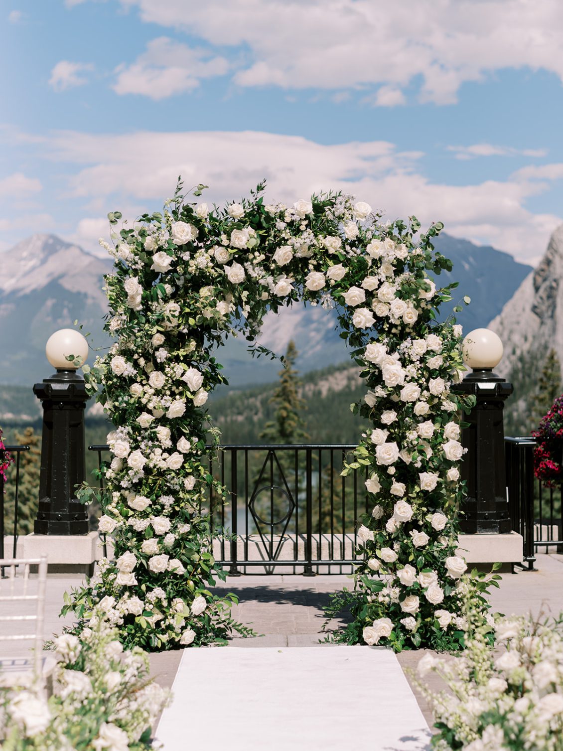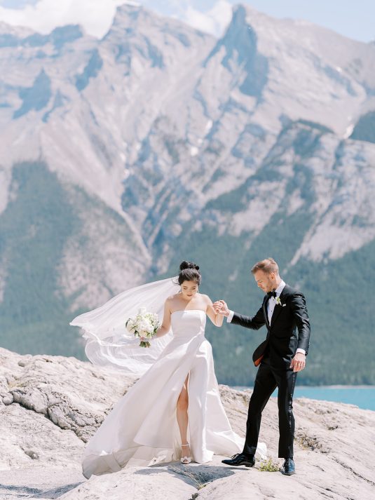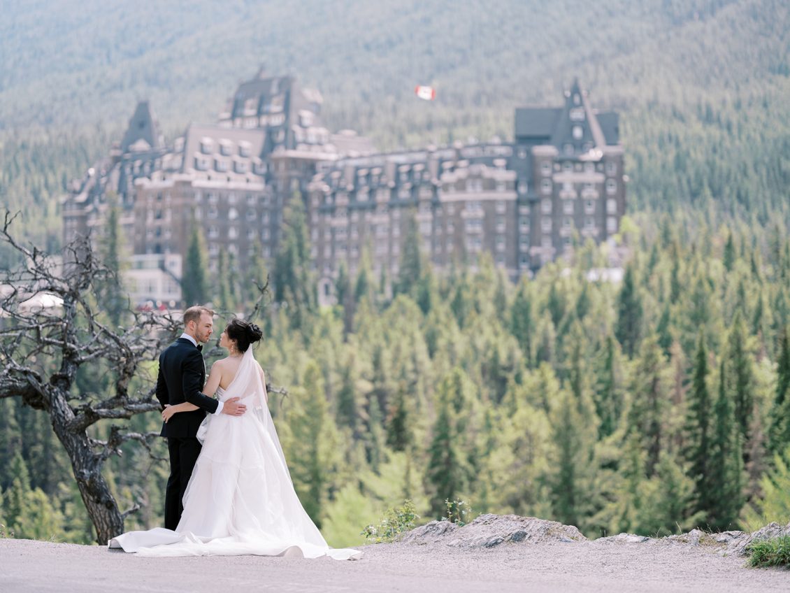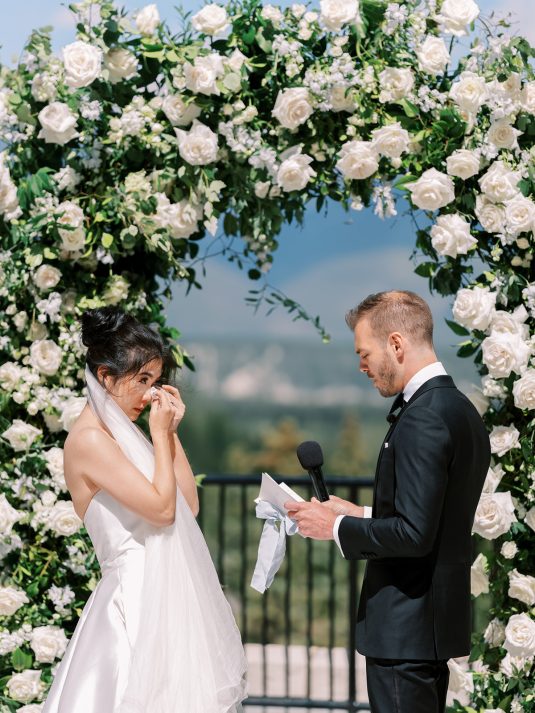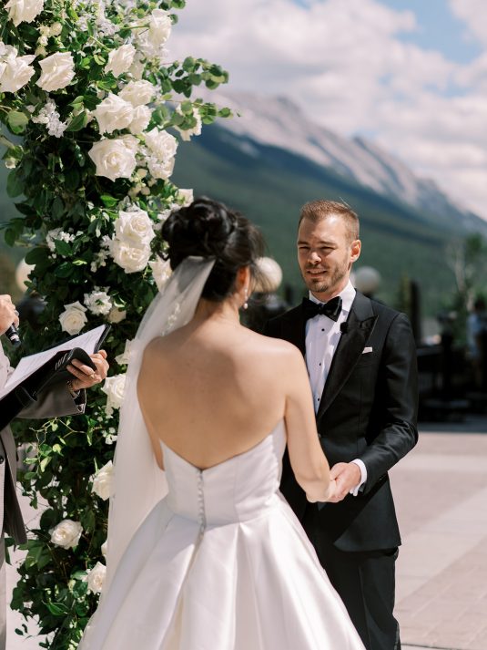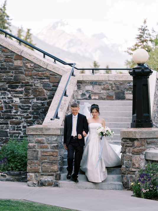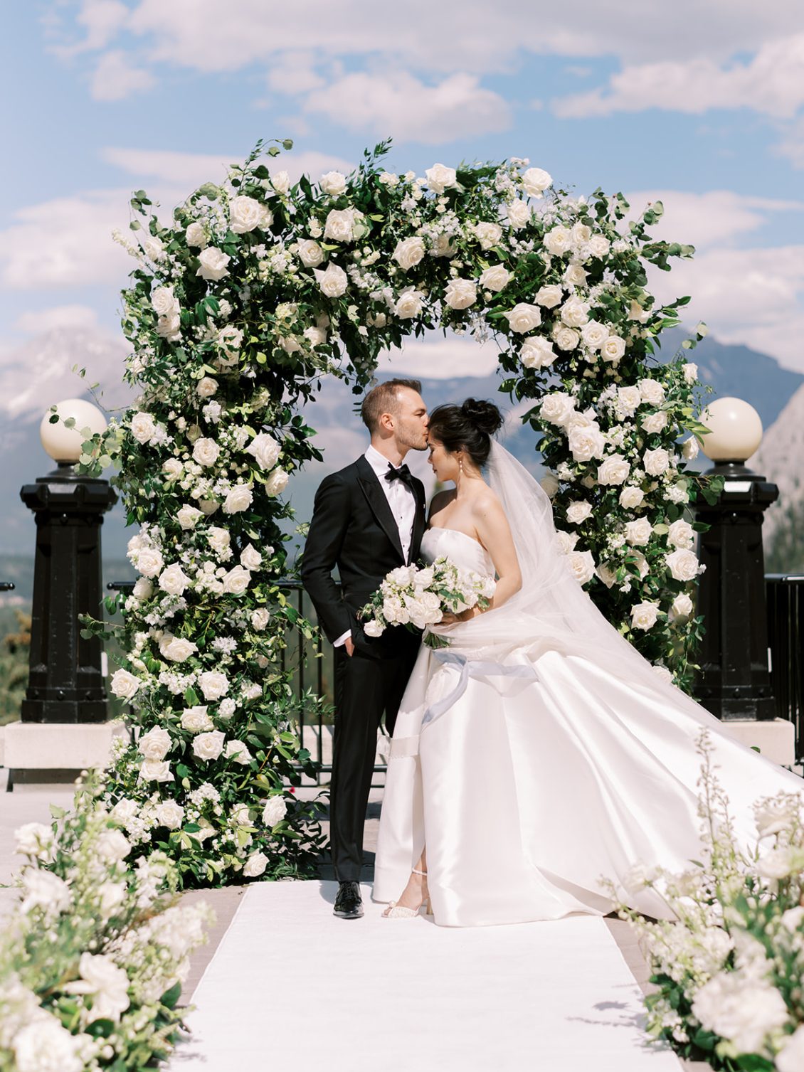 When San Francisco-based Misoo and Charles postponed their wedding in 2021, they eloped on their would-be honeymoon in Positano, Italy. They brought back elements to tie into their eventual destination wedding celebrations at the iconic Fairmont Banff Spring in Alberta, Canada. With the magnificent Canadian Rocky Mountains as the backdrop, a plein air cocktail hour serving “French Canadian 75” cocktails was followed by an elegant reception at the hotel’s ballroom, where guests dined beneath giant arches of fresh greenery. Talk about bringing the outdoors in! Scroll to see the details of this stunning event!