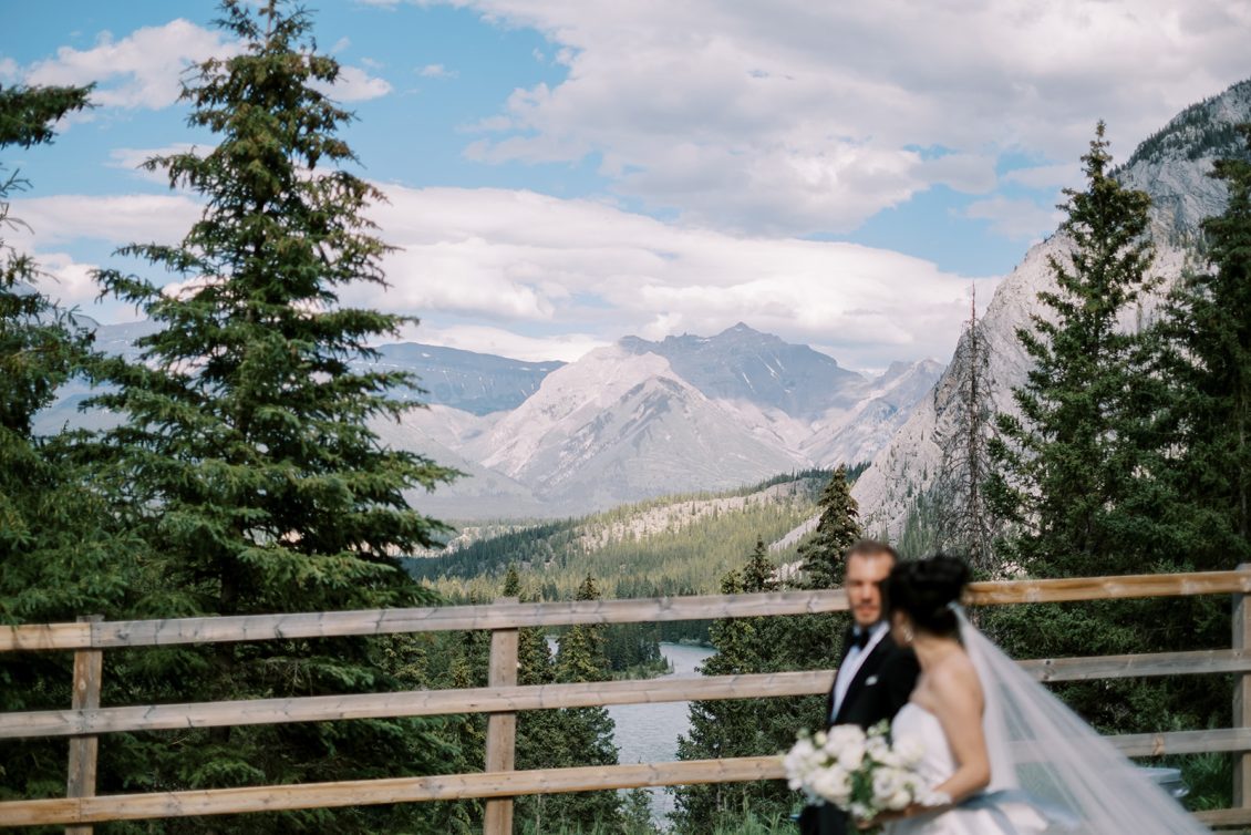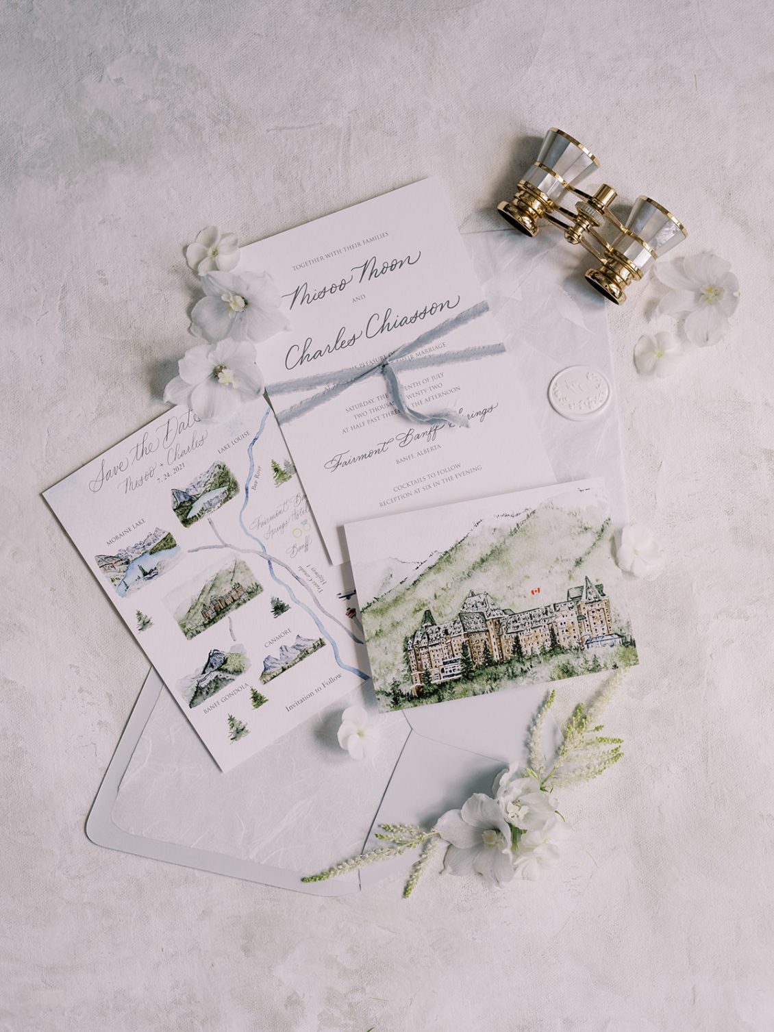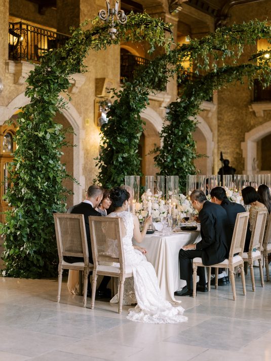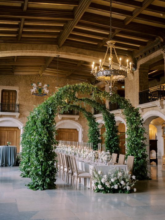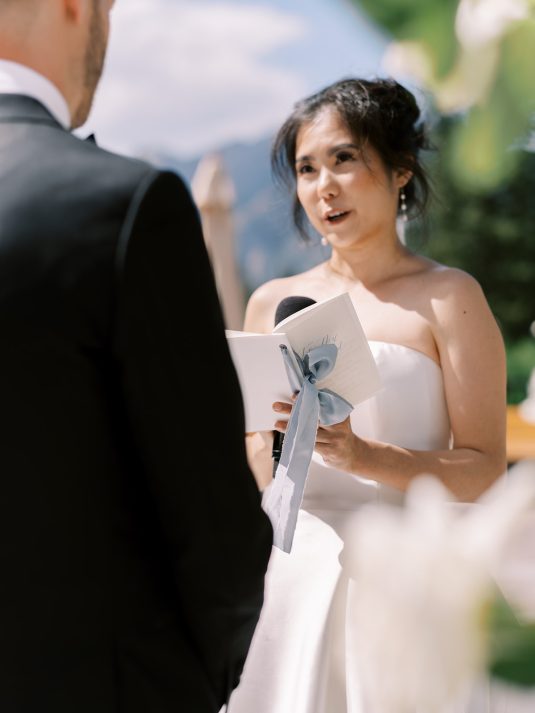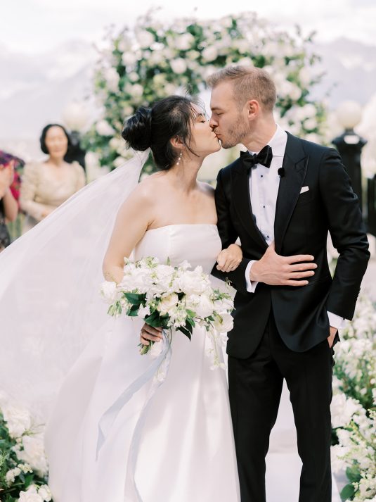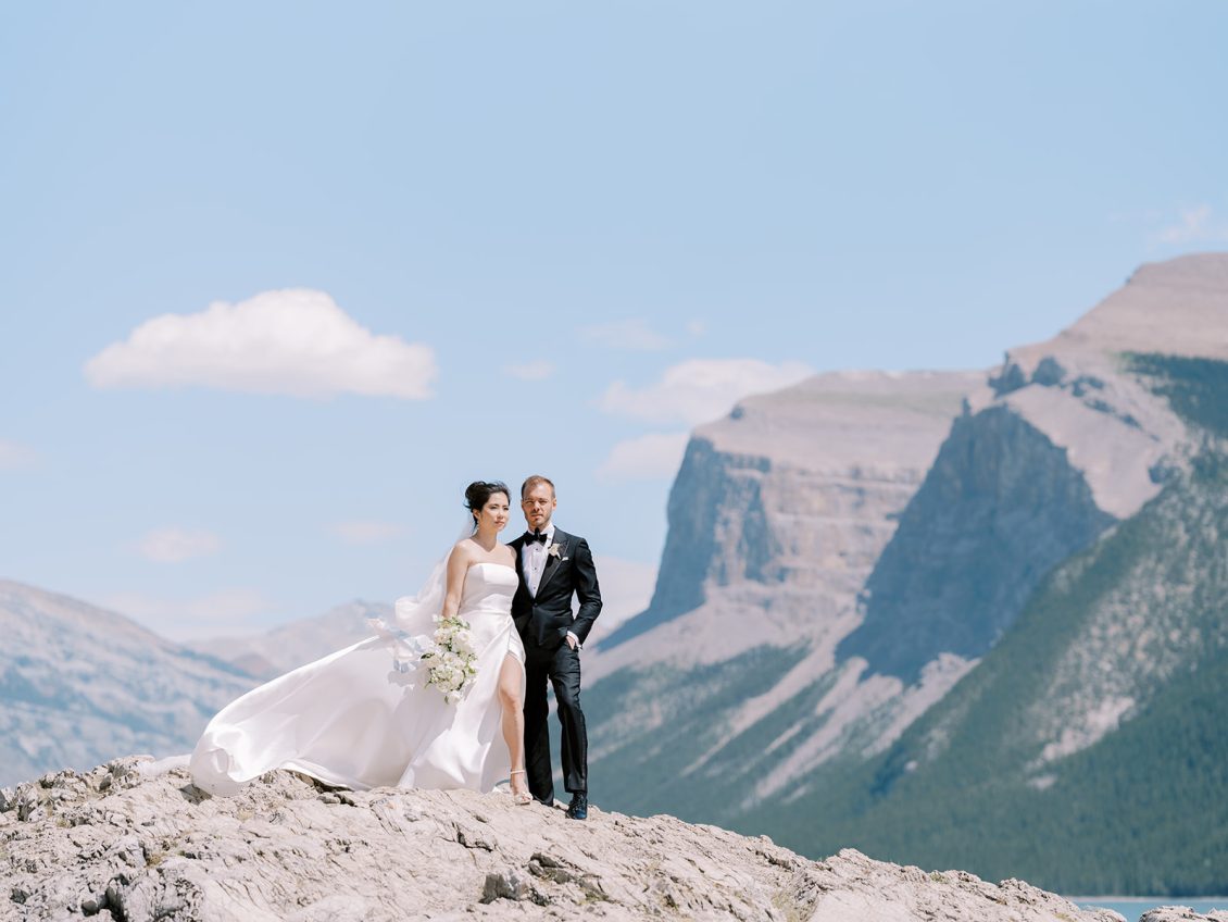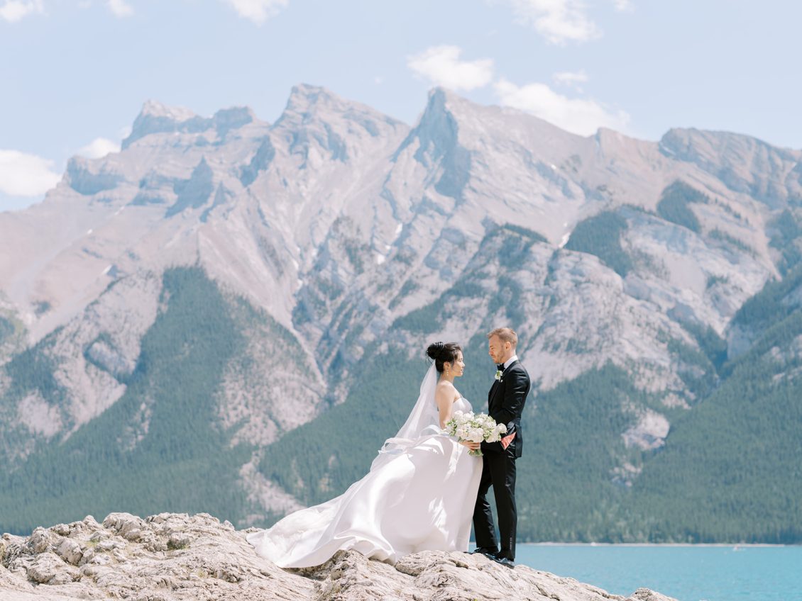 When San Francisco-based Misoo and Charles postponed their wedding in 2021, they eloped on their would-be honeymoon in Positano, Italy. They brought back elements to tie into their eventual destination wedding celebrations at the iconic Fairmont Banff Spring in Alberta, Canada. With the magnificent Canadian Rocky Mountains as the backdrop, a plein air cocktail hour serving “French Canadian 75” cocktails was followed by an elegant reception at the hotel’s ballroom, where guests dined beneath giant arches of fresh greenery. Talk about bringing the outdoors in! Scroll to see the details of this stunning event!