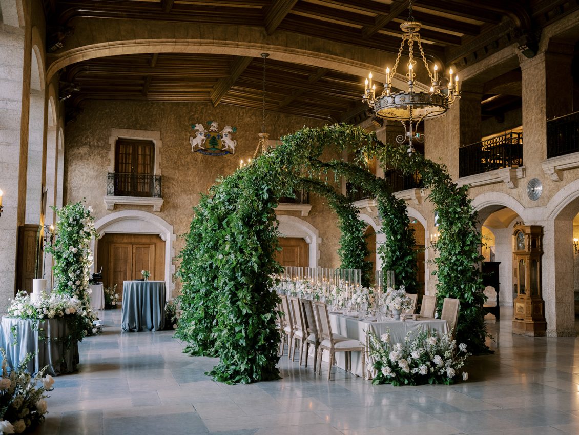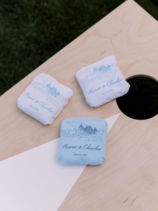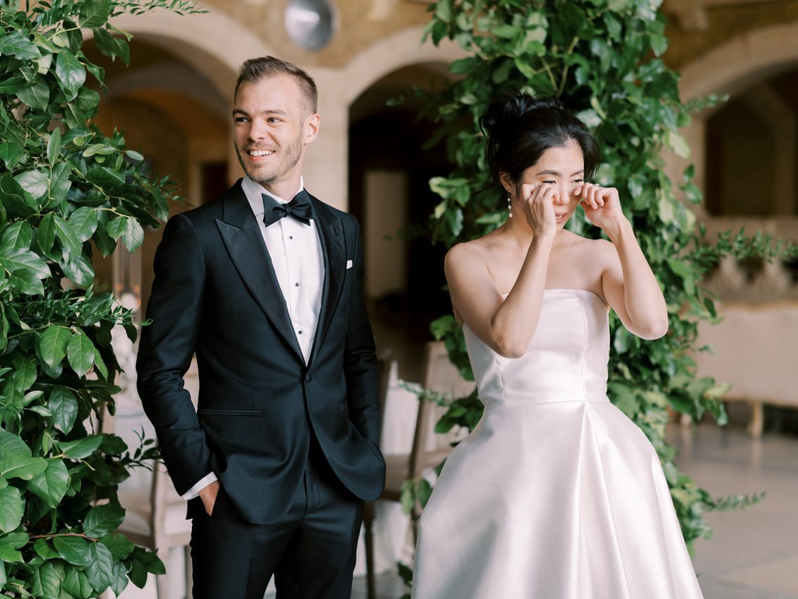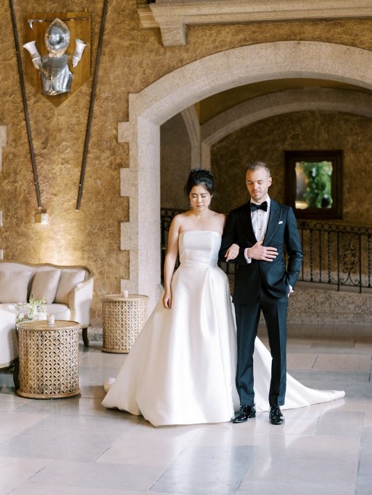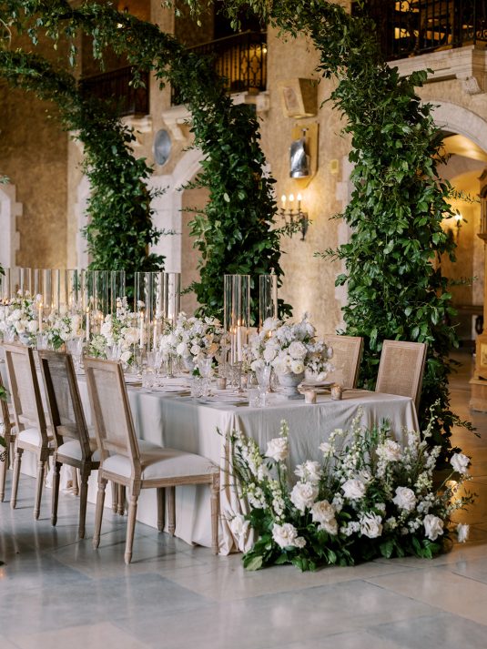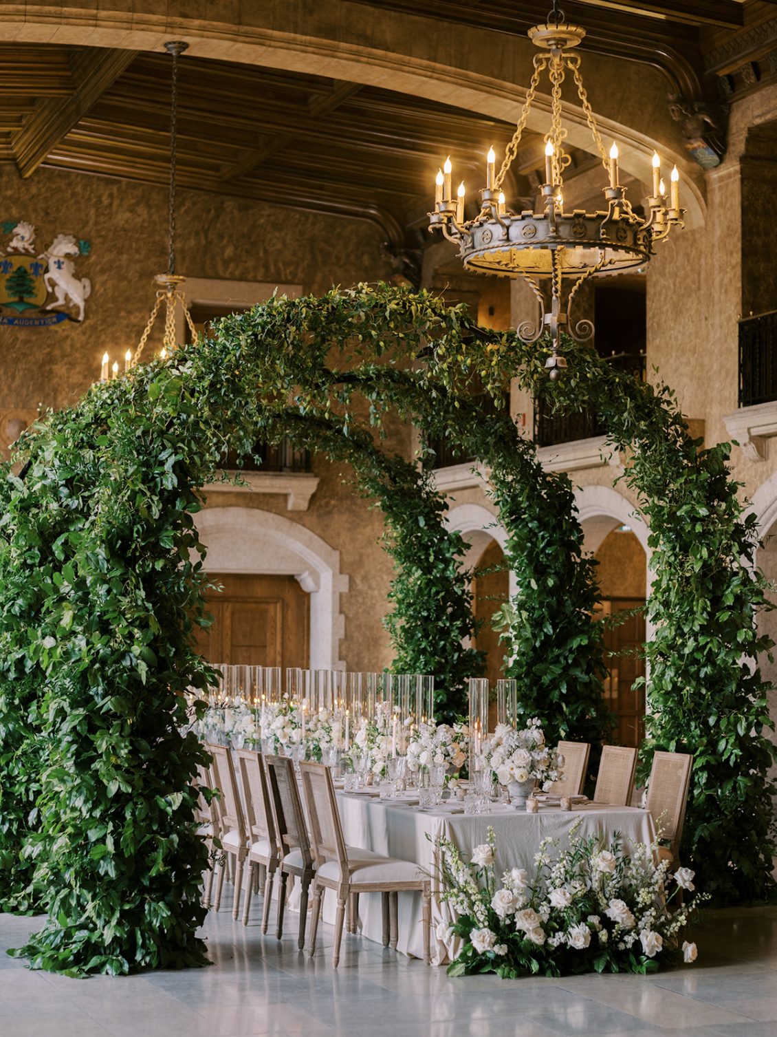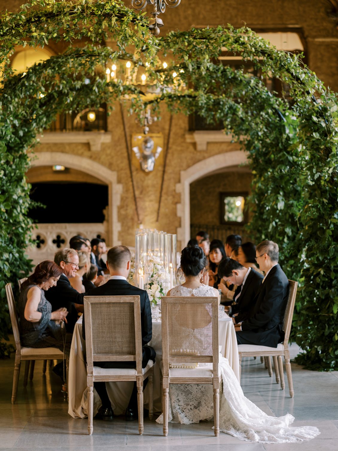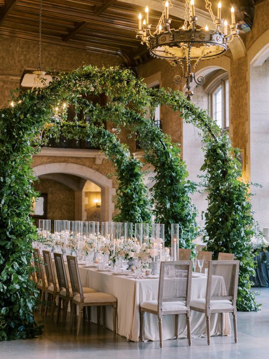 When San Francisco-based Misoo and Charles postponed their wedding in 2021, they eloped on their would-be honeymoon in Positano, Italy. They brought back elements to tie into their eventual destination wedding celebrations at the iconic Fairmont Banff Spring in Alberta, Canada. With the magnificent Canadian Rocky Mountains as the backdrop, a plein air cocktail hour serving “French Canadian 75” cocktails was followed by an elegant reception at the hotel’s ballroom, where guests dined beneath giant arches of fresh greenery. Talk about bringing the outdoors in! Scroll to see the details of this stunning event!