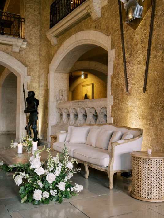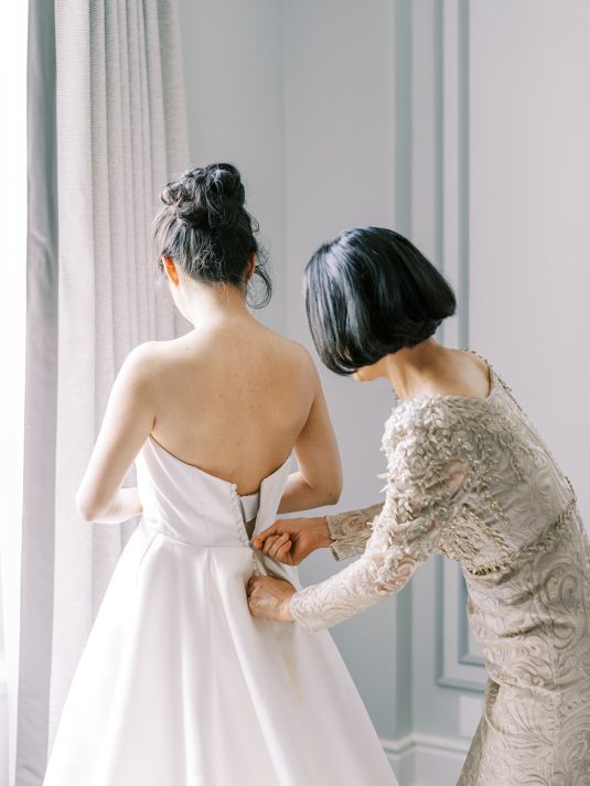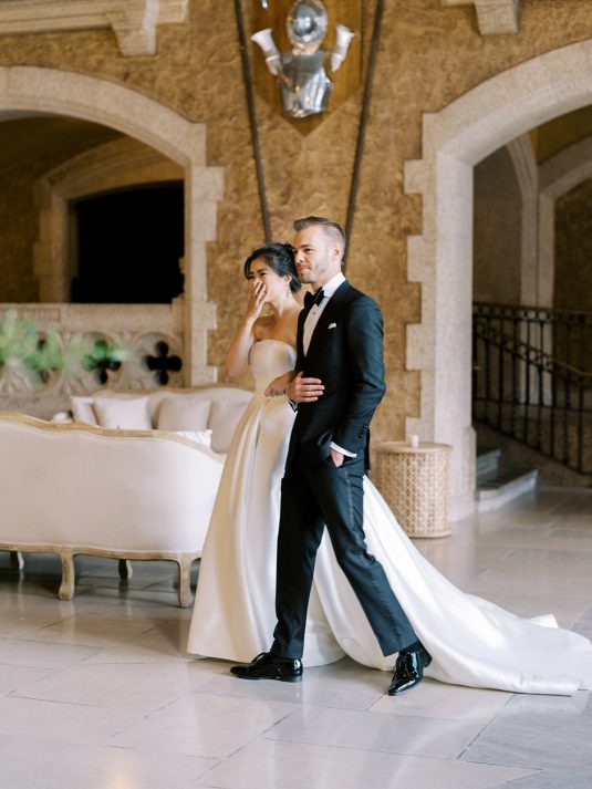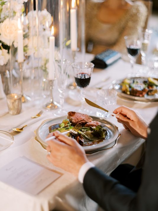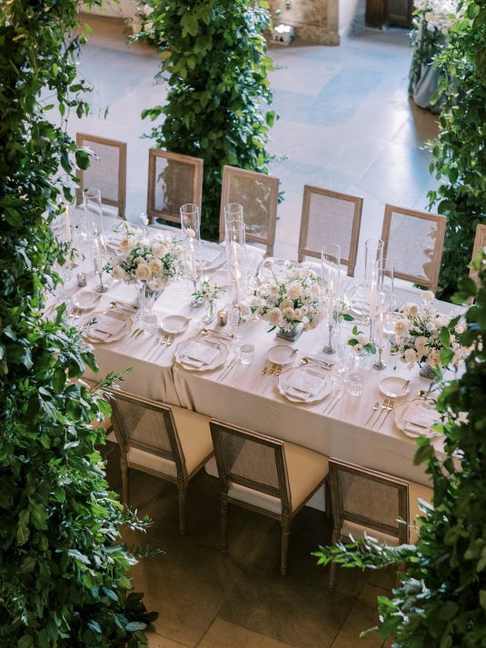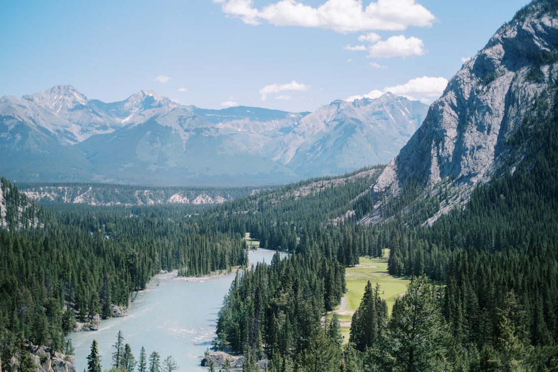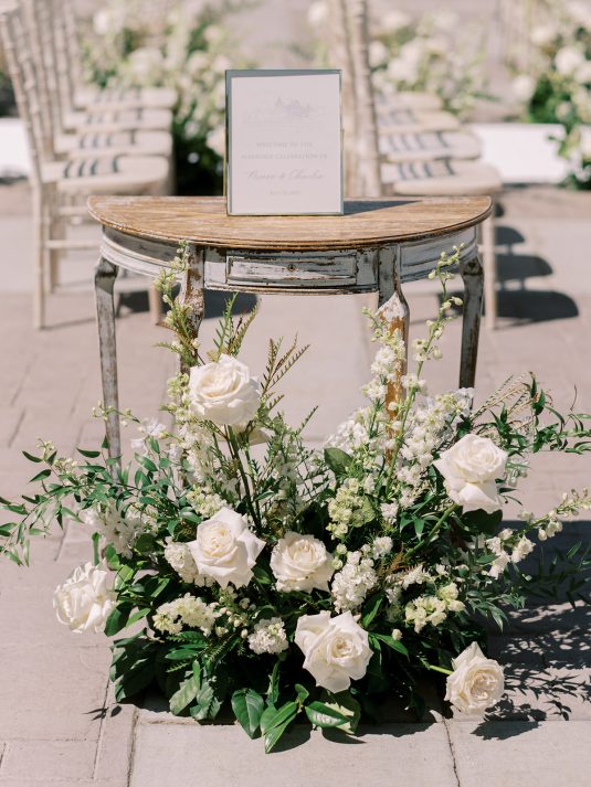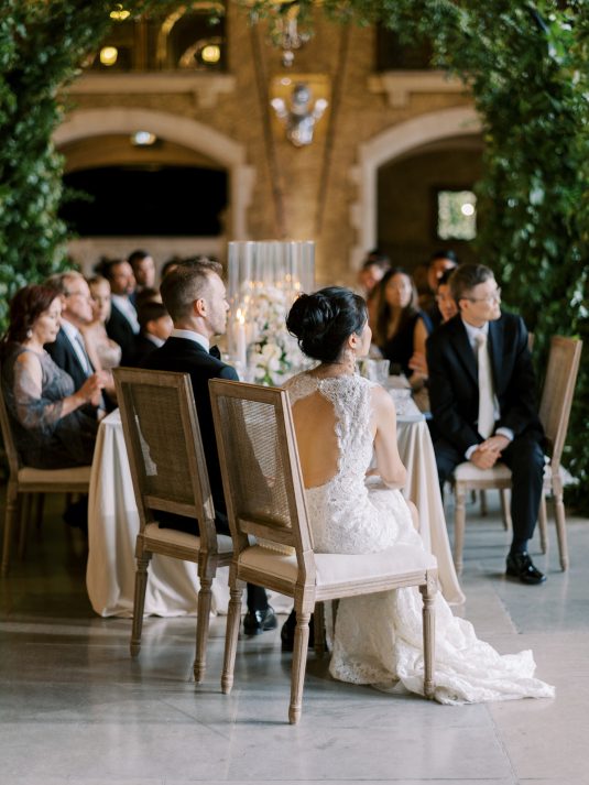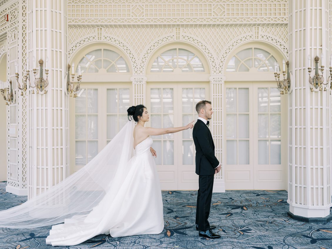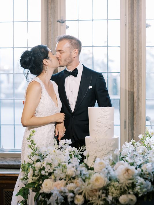 When San Francisco-based Misoo and Charles postponed their wedding in 2021, they eloped on their would-be honeymoon in Positano, Italy. They brought back elements to tie into their eventual destination wedding celebrations at the iconic Fairmont Banff Spring in Alberta, Canada. With the magnificent Canadian Rocky Mountains as the backdrop, a plein air cocktail hour serving “French Canadian 75” cocktails was followed by an elegant reception at the hotel’s ballroom, where guests dined beneath giant arches of fresh greenery. Talk about bringing the outdoors in! Scroll to see the details of this stunning event!