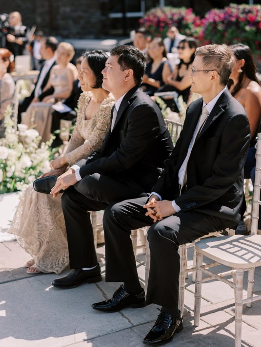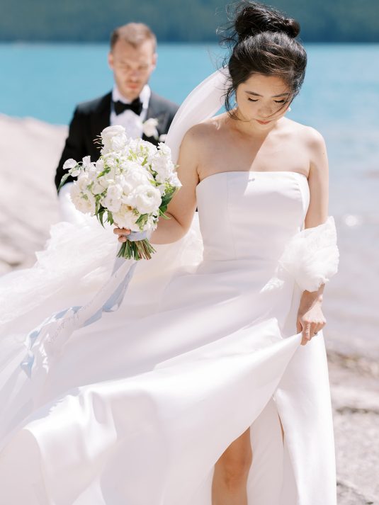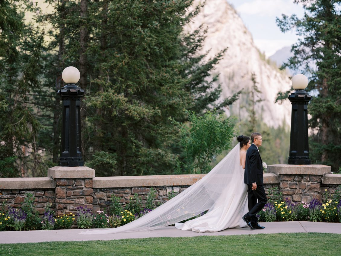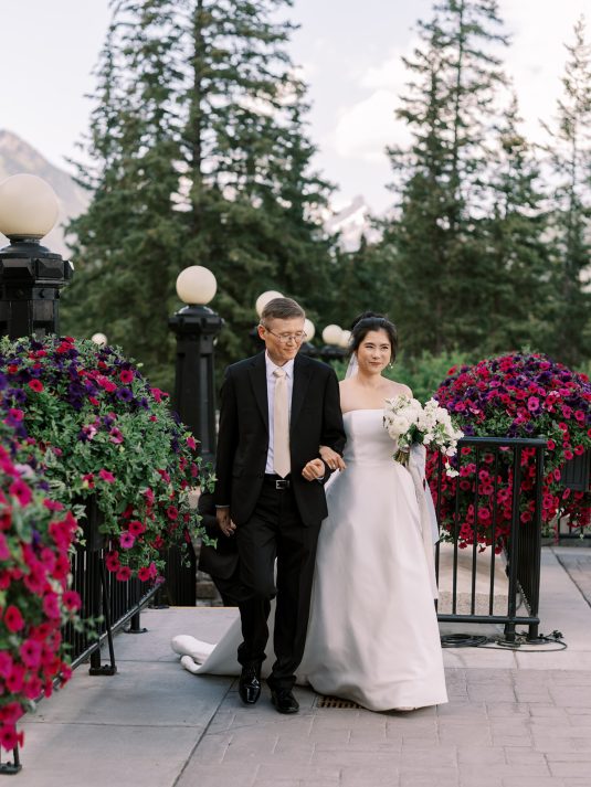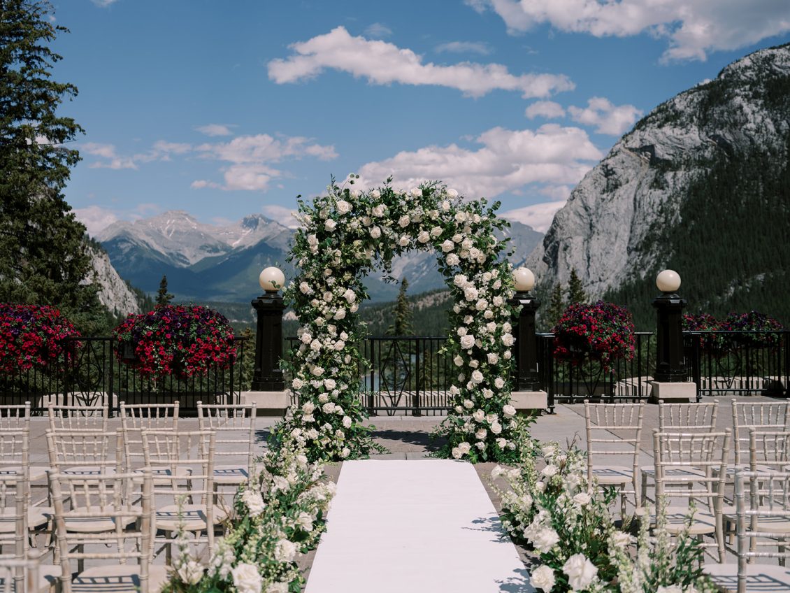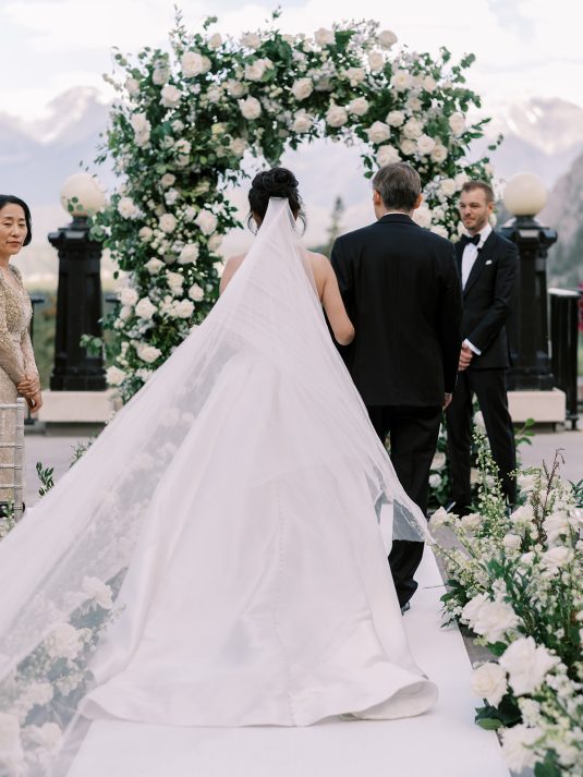 Photography @miltonphoto, Event Planning and Design @julianneyoungweddings, Venue @fairmontbanff, Calligraphy and Stationery @debbiewongdesign, Florals @flowerartistry, Hair and Makeup @blushandcoco, Wedding Dresses @moniquelhuillier, Veil @noononthemoon.bridal, Bridal Shoes and Clutch @jimmychoo, Officiated by Klaus Ohlhoff, Cake @kakebydarci, Rentals from Modern Luxe Rentals, Arches @coven.creative, Ceremony Musicians from Ensemble Cascade, DJ @pezproductions, Photo Booth @ourlavishguests, Transportation by Banff Sedan, Cinematography @parfaitproductions
