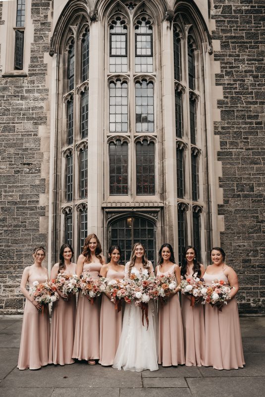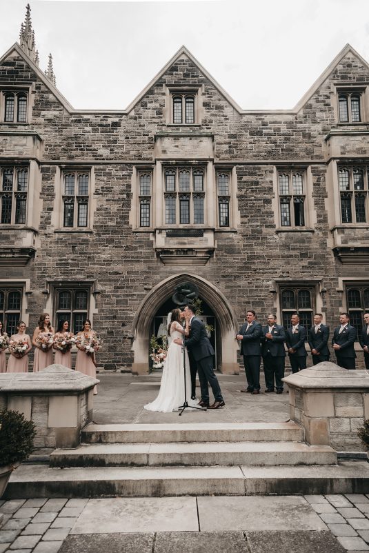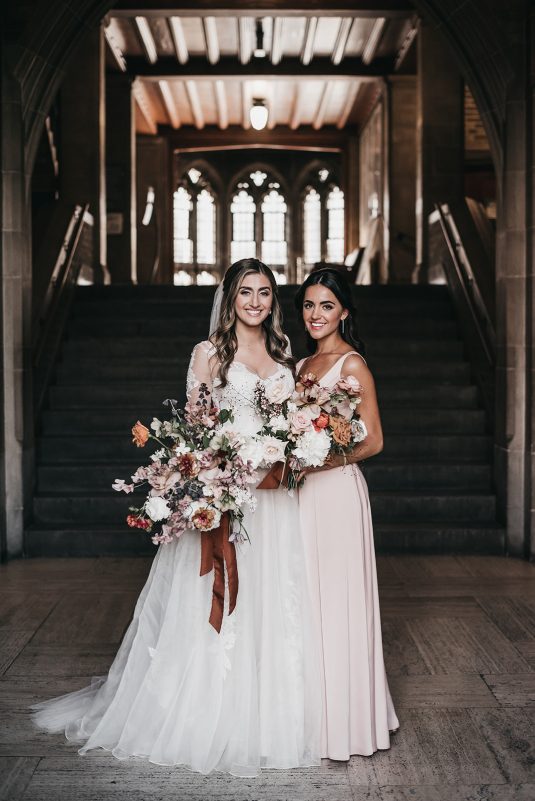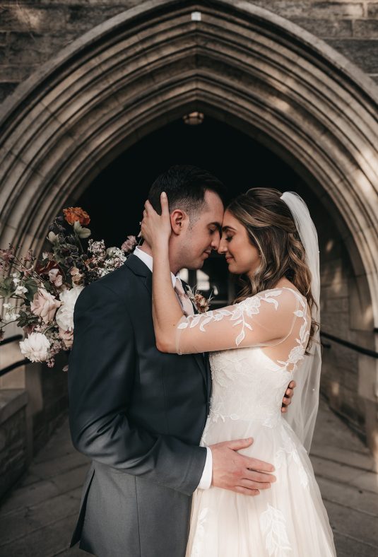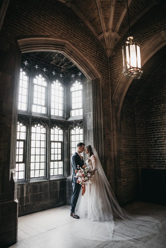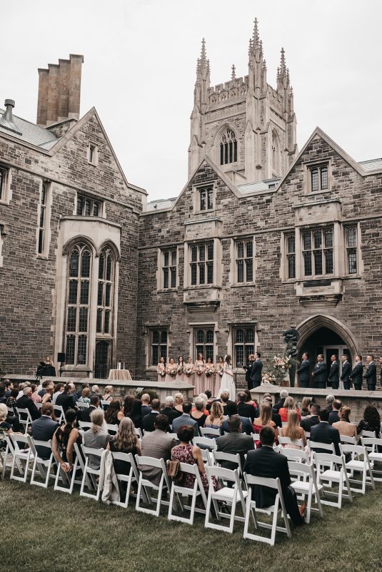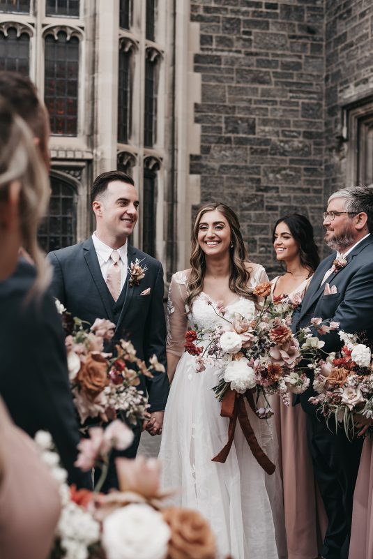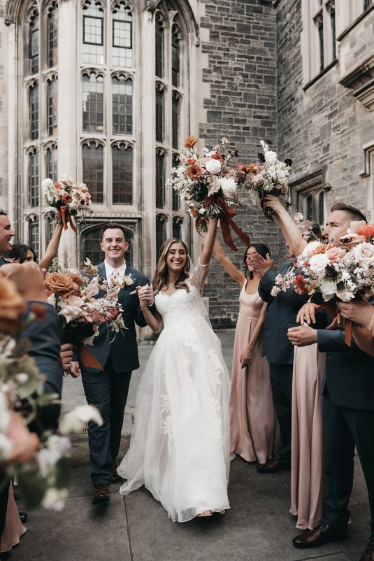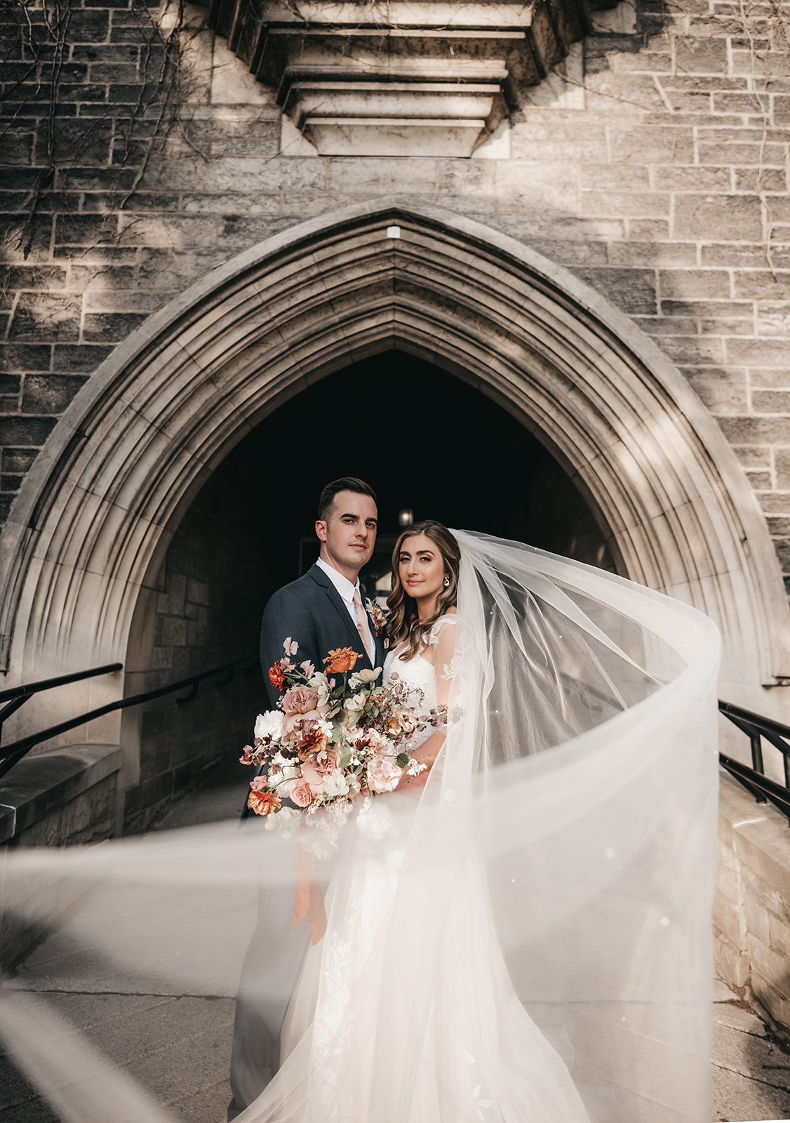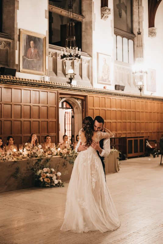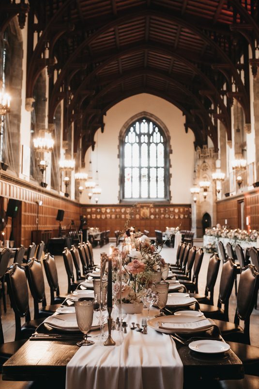 United States-based couple Hayden and Nate were married in Hayden’s hometown of Toronto, Canada. The caramel-hued wedding was designed to compliment the venue’s architecture, Hart House at the University of Toronto, with a moody-meets-ethereal vision and a carefully curated playlist to match — both lovers of great music, the bride and groom selected every song that played on their wedding day! We LOVE the old-world castle-like vibes of Hart House, channeling the feel of a castle banquet hall in the heart of a cosmopolitan city.