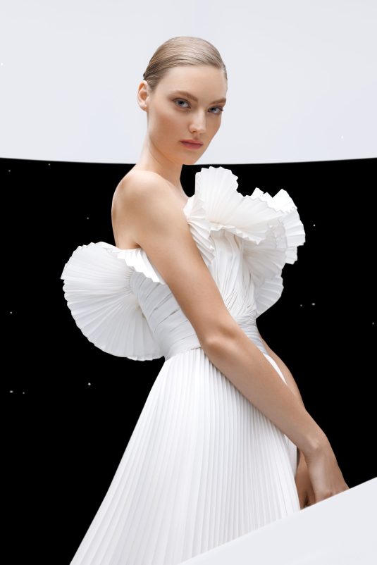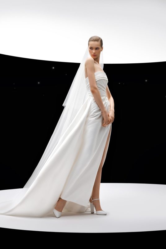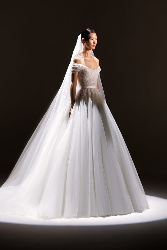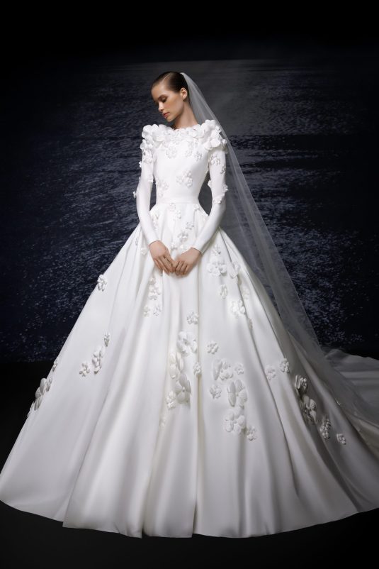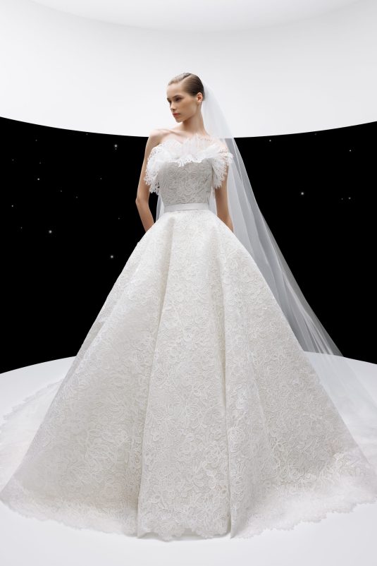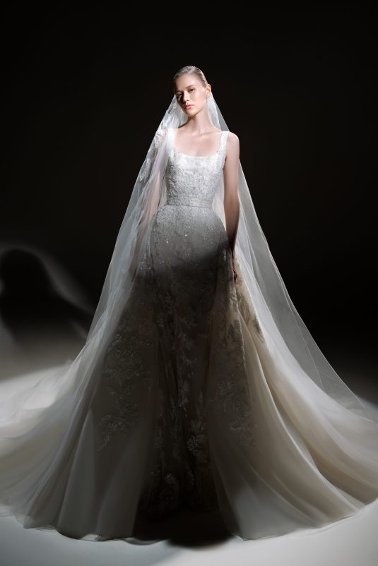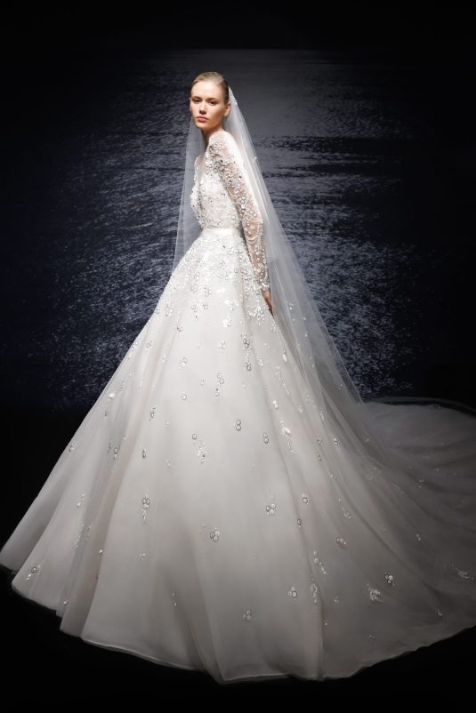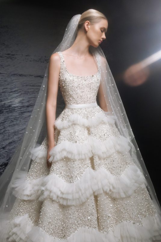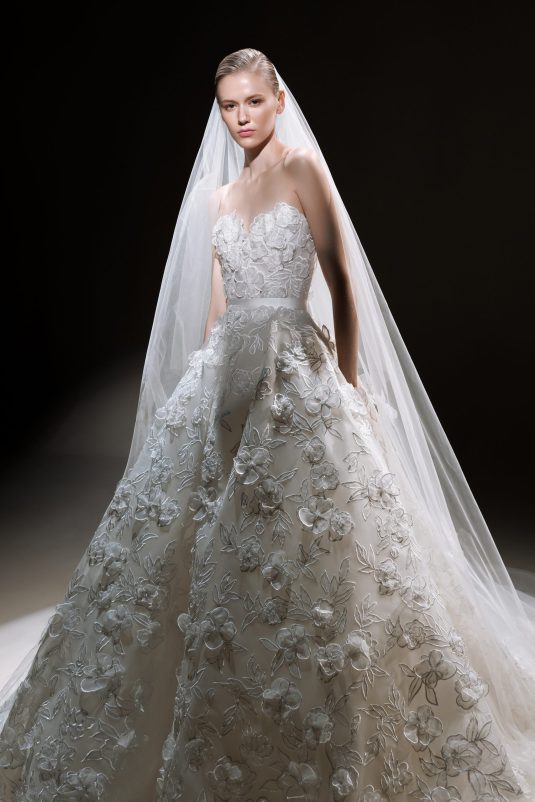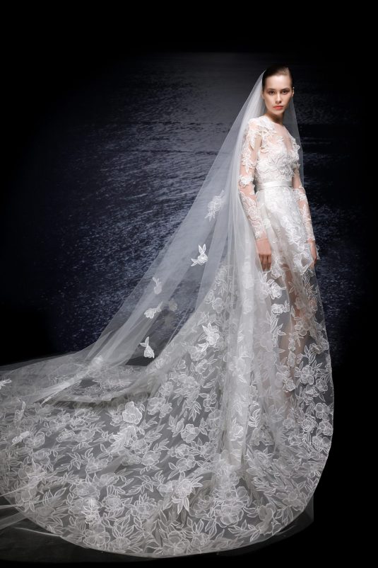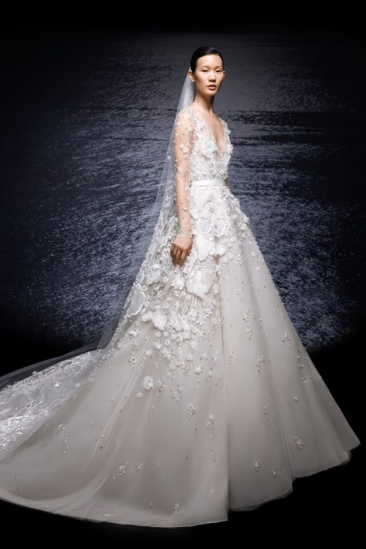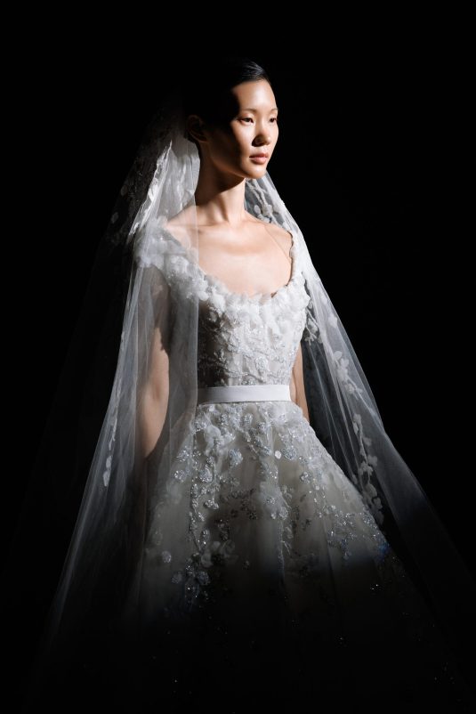 The ELIE SAAB Bridal Spring 2024 collection, “A Sense of Wonder” is a described as an imagined universe suspended between the heavens and earth. The delicate elements of these gowns — wisps of tulle, floral appliqués blossoming across silk, glistening crystal and pearl beading — are mesmerizing in their ethereal beauty.