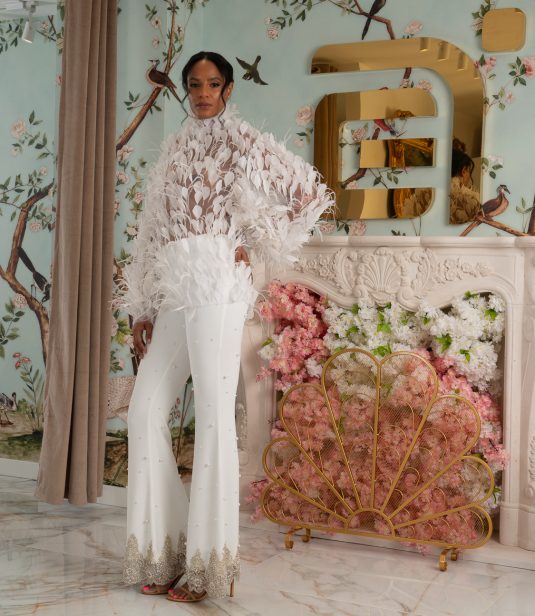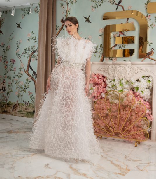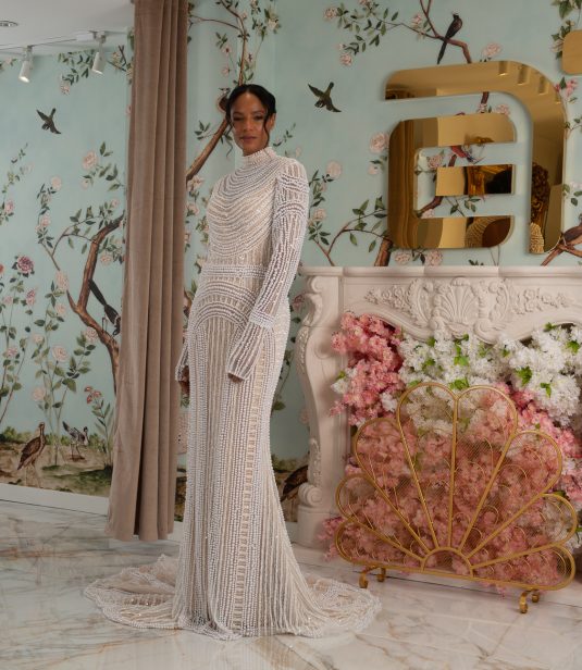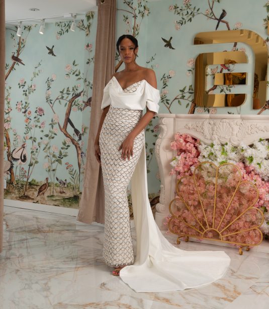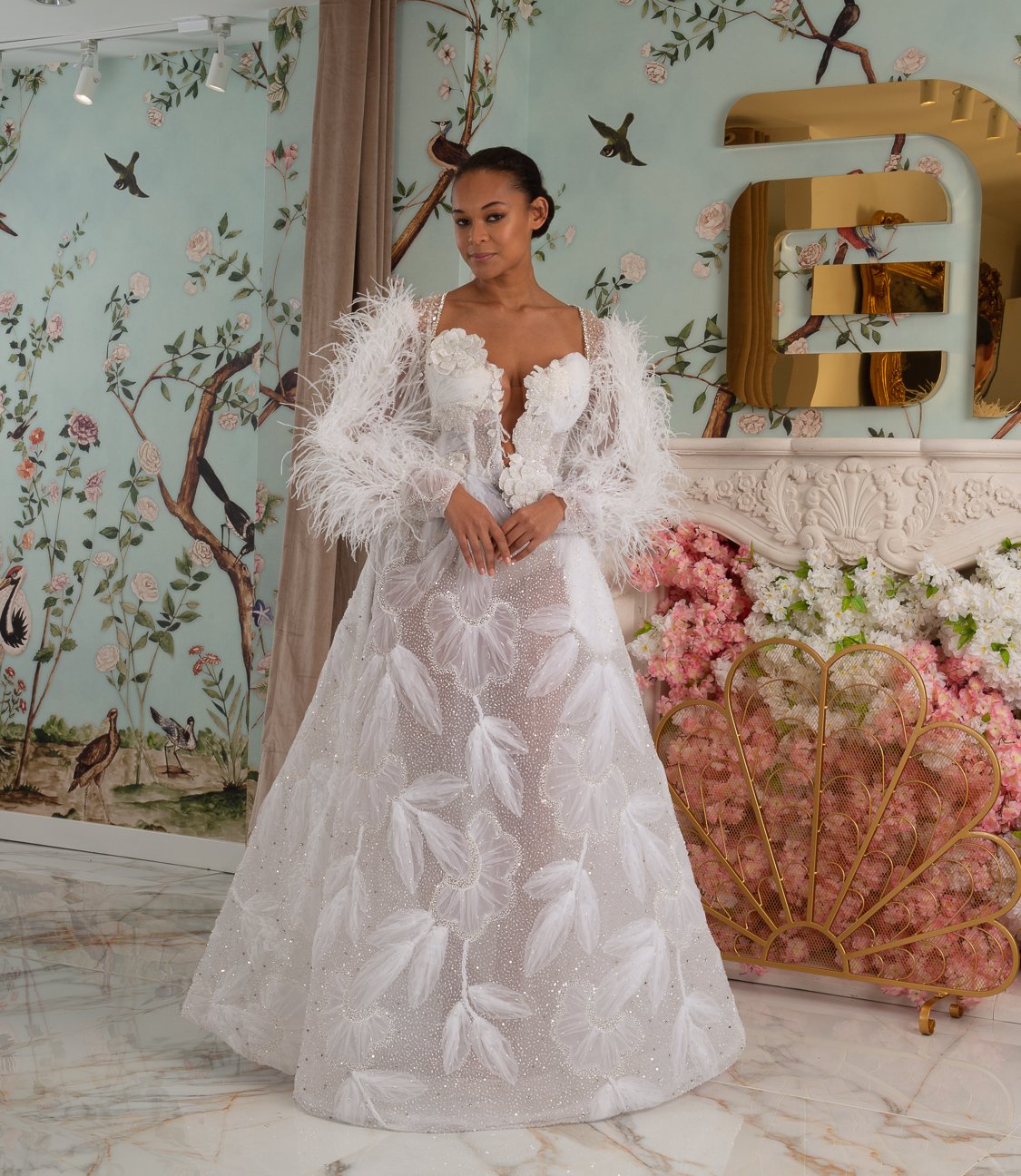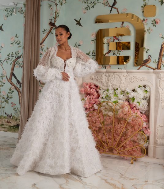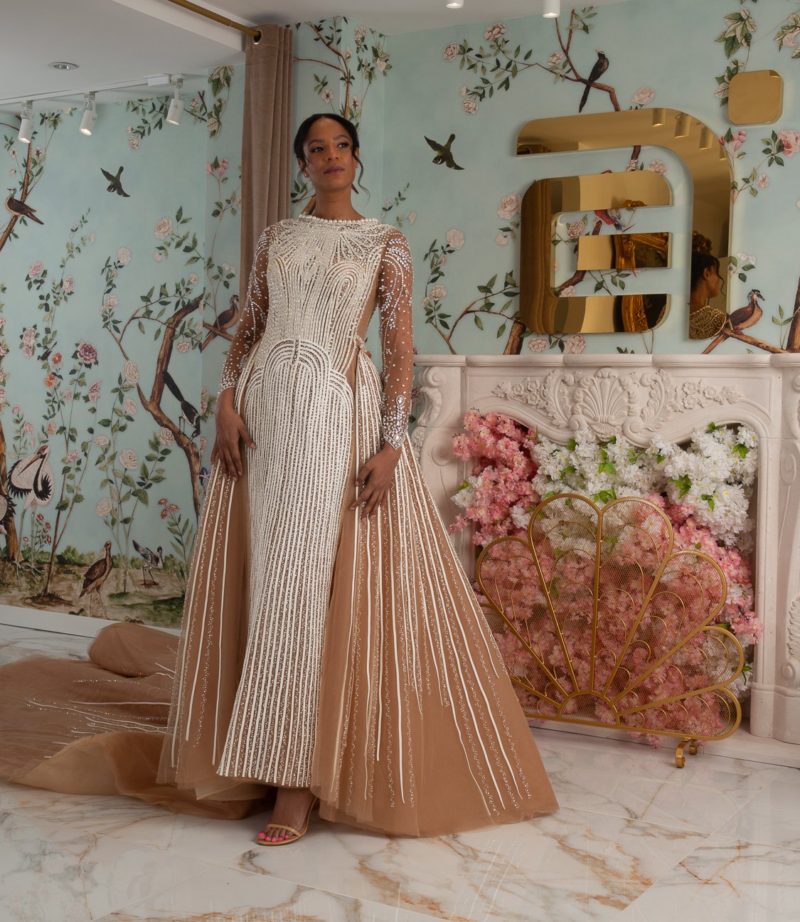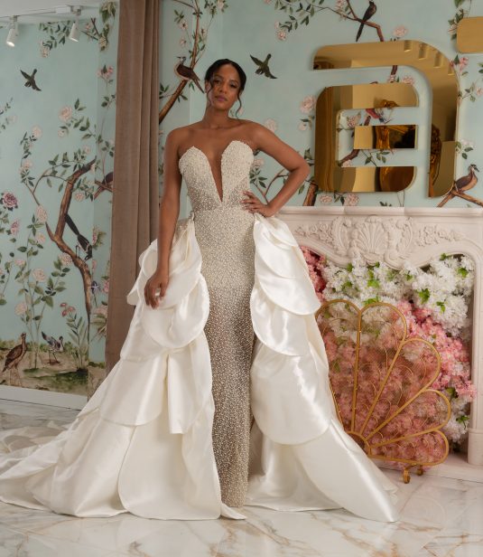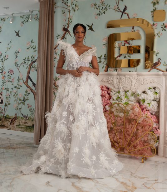 “We are excited to showcase in our first-ever Bridal Fashion Week, introducing our couture runway collection ‘Essence.’ I chose to create the Essence line to really show what inspired me to become a designer which is creating lots of texture. From fabric manipulation, Swarovski crystals, to Ostrich feathers and 3-D floral patterns. Creating real-life texture such as the countless hand-beaded pearls for our one-of-a-kind brides. This runway collection elevates a form of uniqueness and innovation that we can not wait to bring to our brides.” —Esé Azénabor