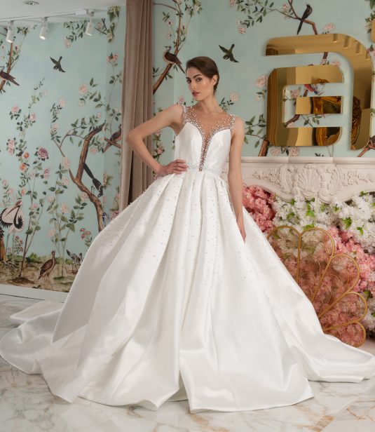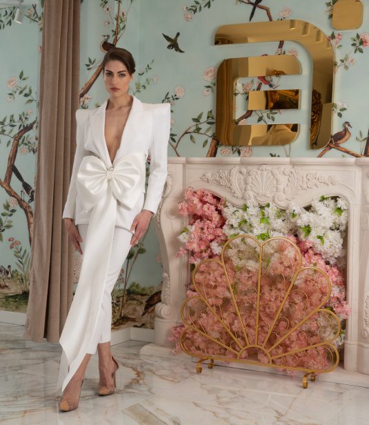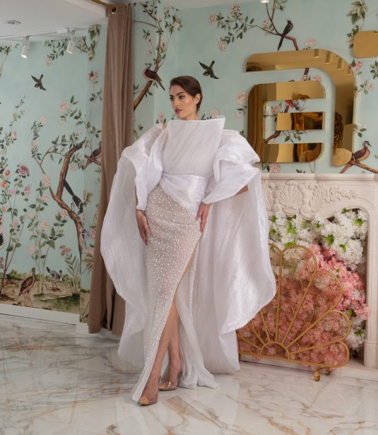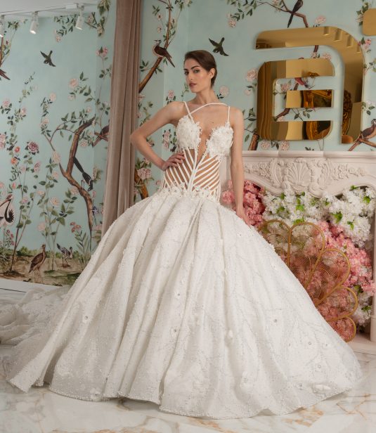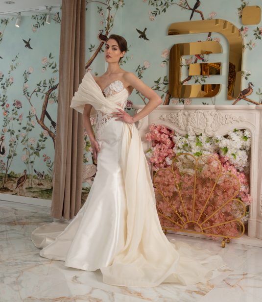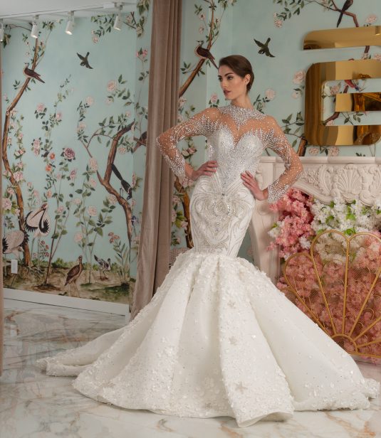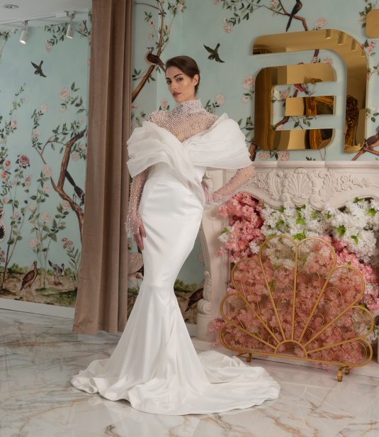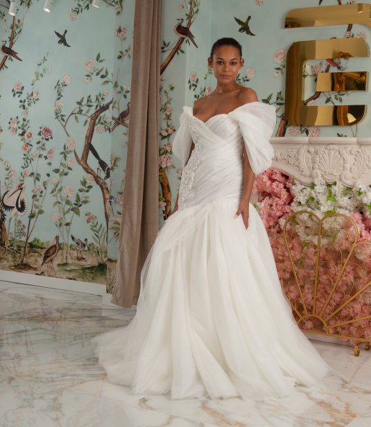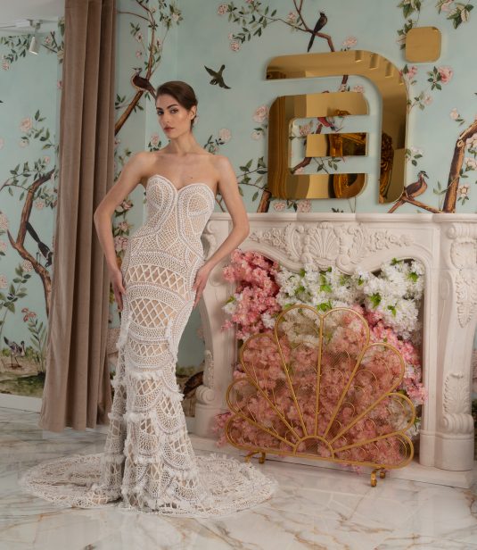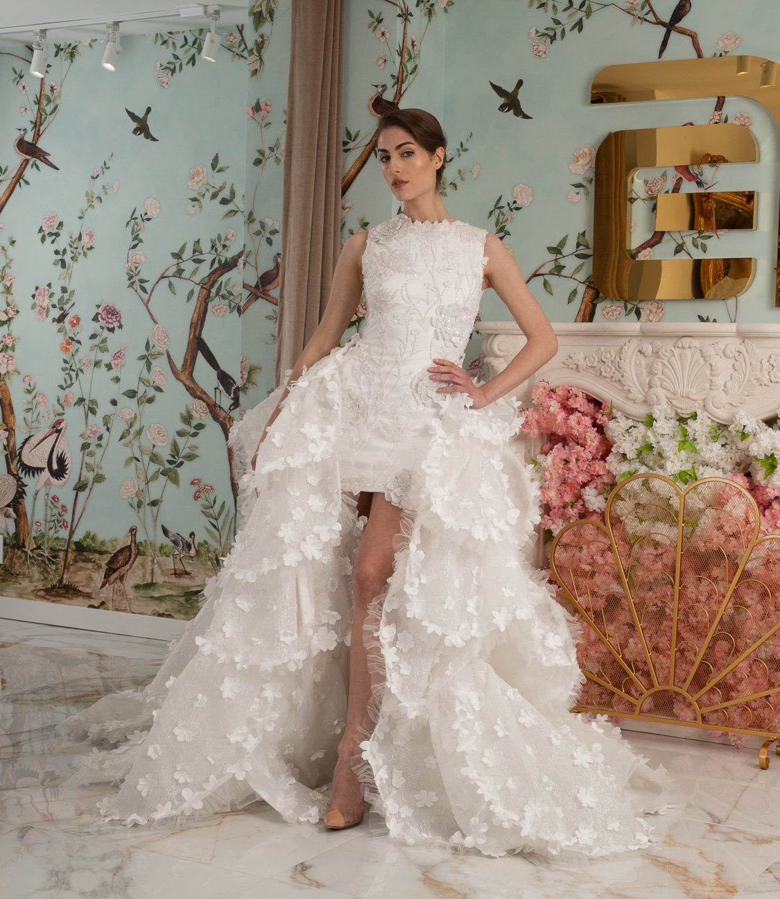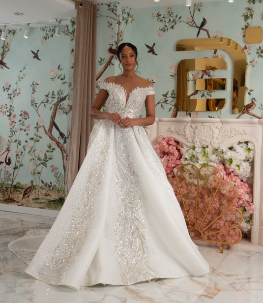 “We are excited to showcase in our first-ever Bridal Fashion Week, introducing our couture runway collection ‘Essence.’ I chose to create the Essence line to really show what inspired me to become a designer which is creating lots of texture. From fabric manipulation, Swarovski crystals, to Ostrich feathers and 3-D floral patterns. Creating real-life texture such as the countless hand-beaded pearls for our one-of-a-kind brides. This runway collection elevates a form of uniqueness and innovation that we can not wait to bring to our brides.” —Esé Azénabor