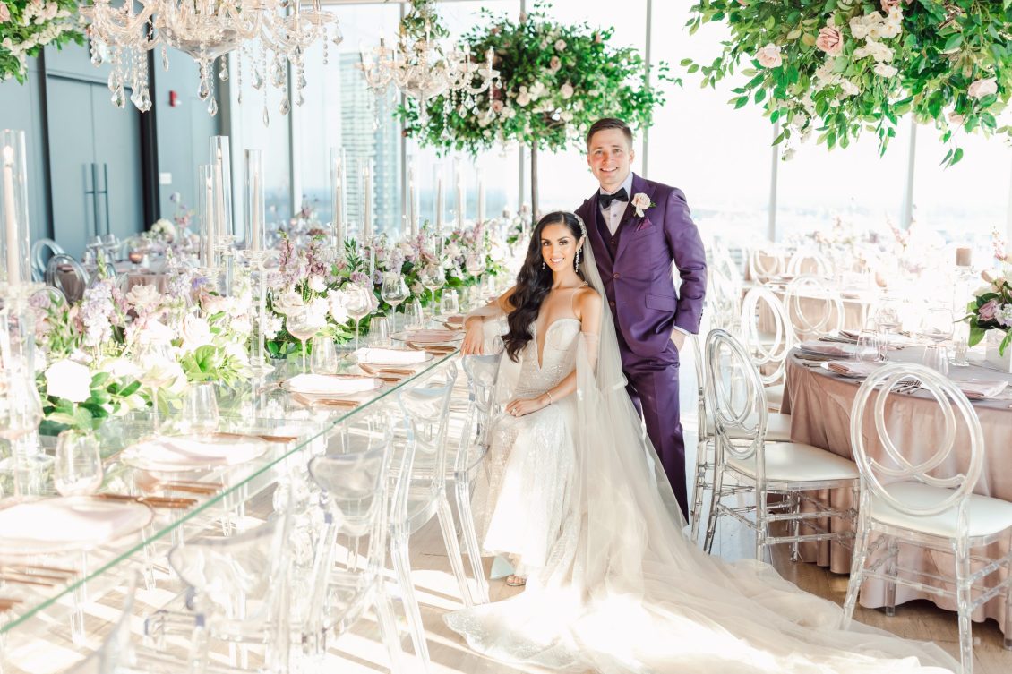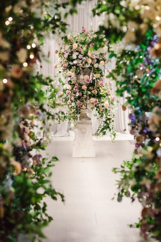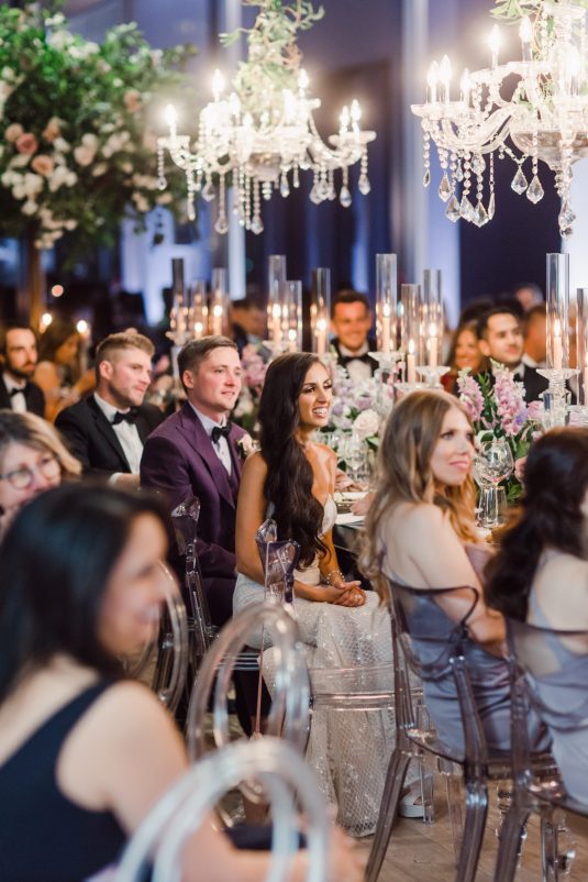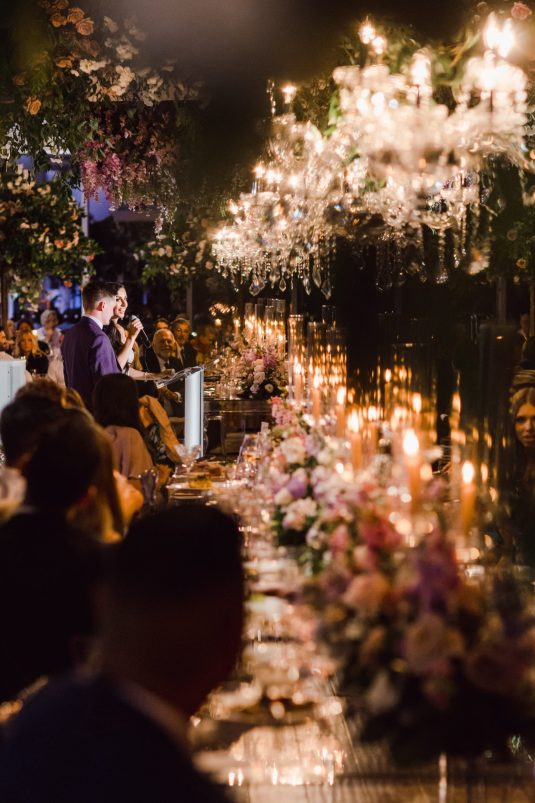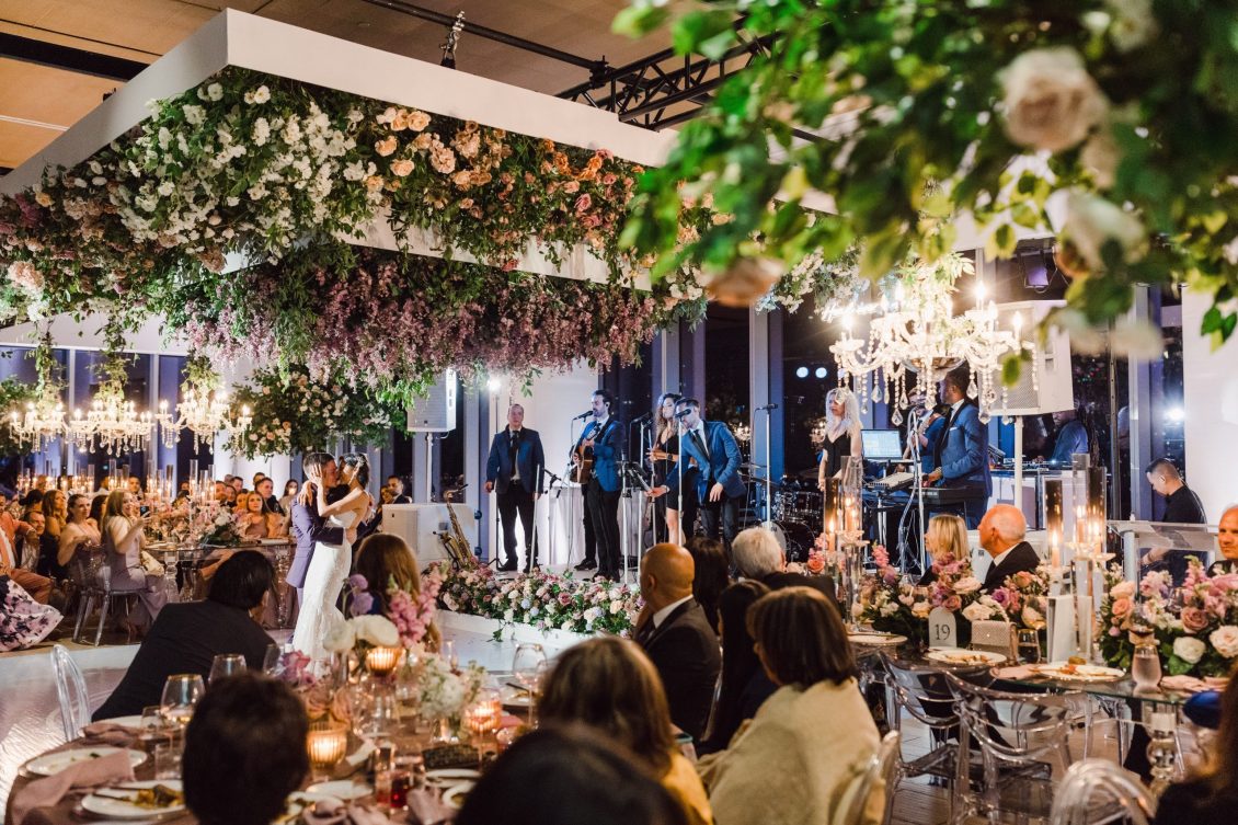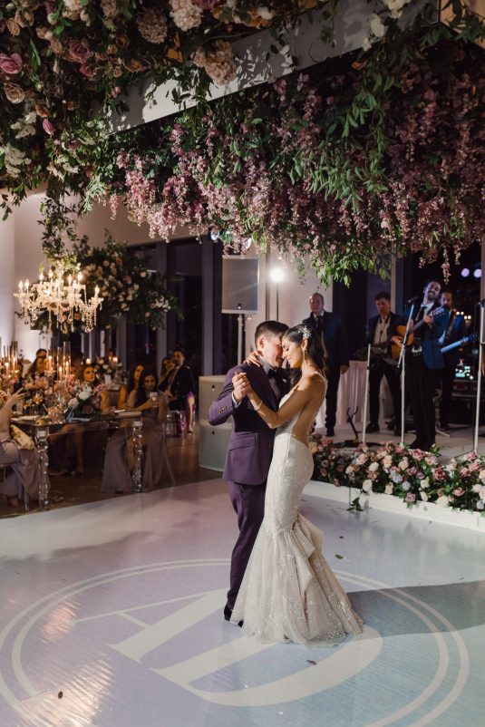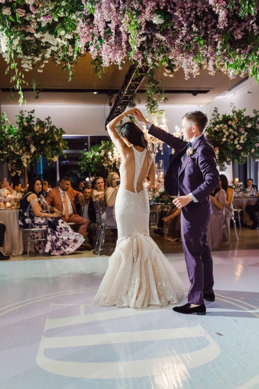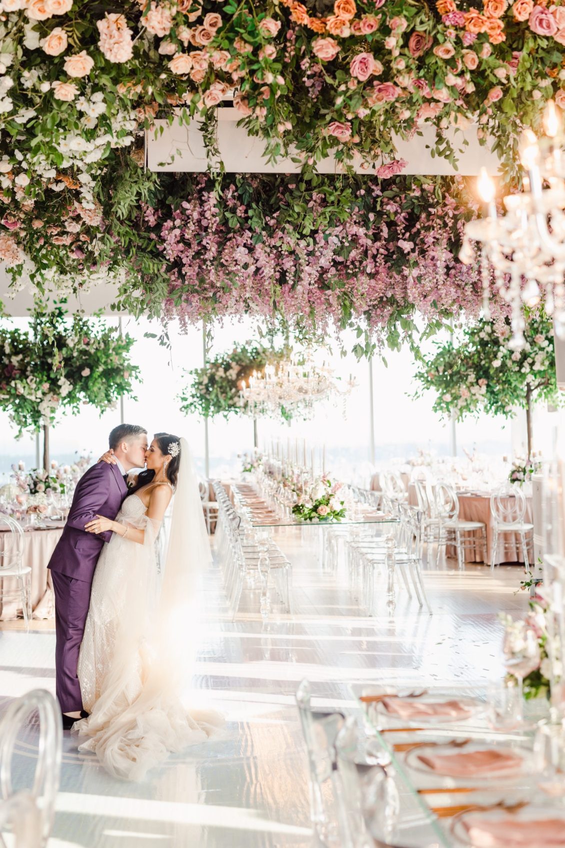 At the reception room reveal, the bride was left speechless (and in tears!). “The vision I had was blown out of the water,” says Amanda, referencing the reception’s design, including the two-tiered floral canopy with crystal chandeliers dangled overhead with floral garlands.