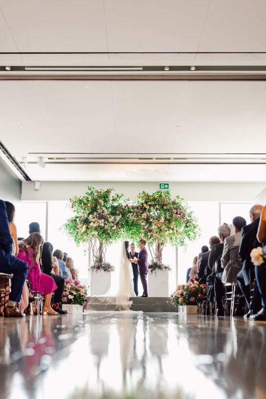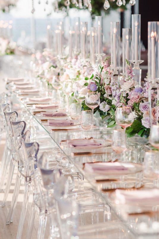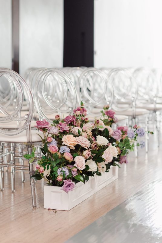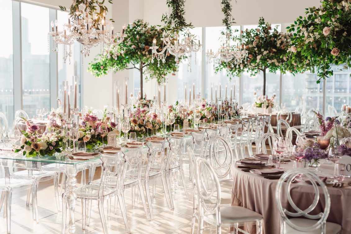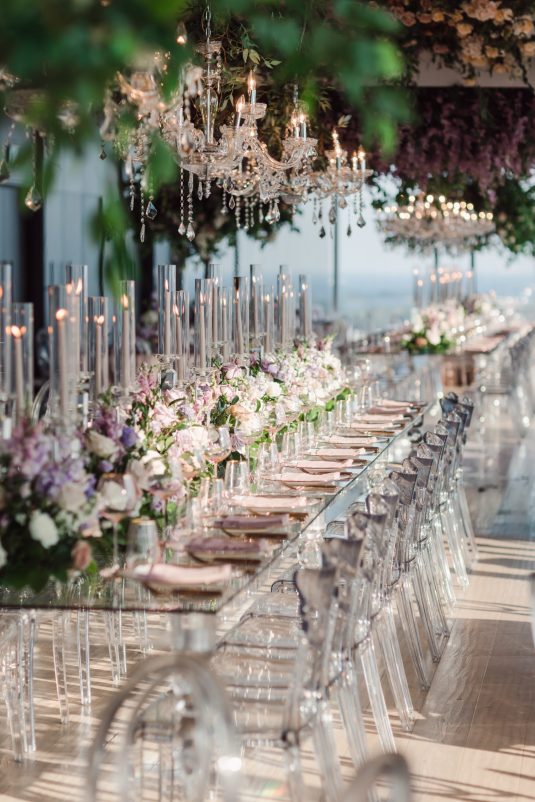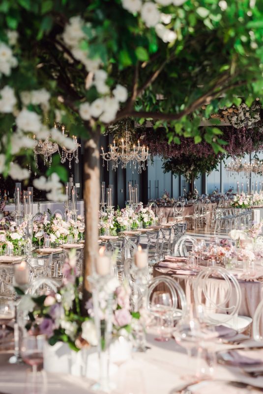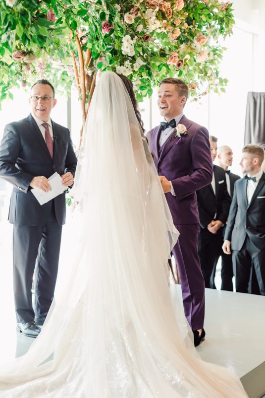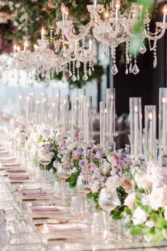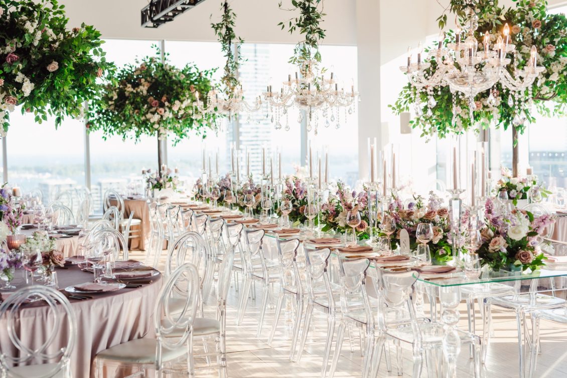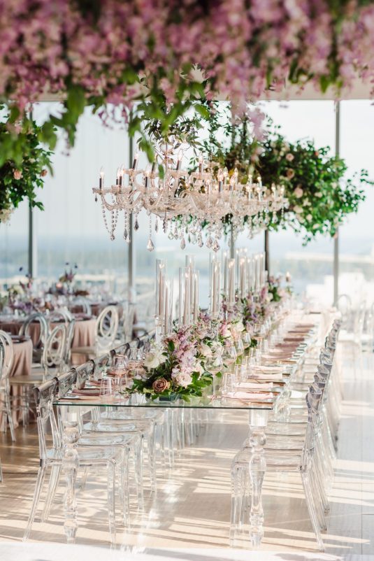 At the reception room reveal, the bride was left speechless (and in tears!). “The vision I had was blown out of the water,” says Amanda, referencing the reception’s design, including the two-tiered floral canopy with crystal chandeliers dangled overhead with floral garlands.