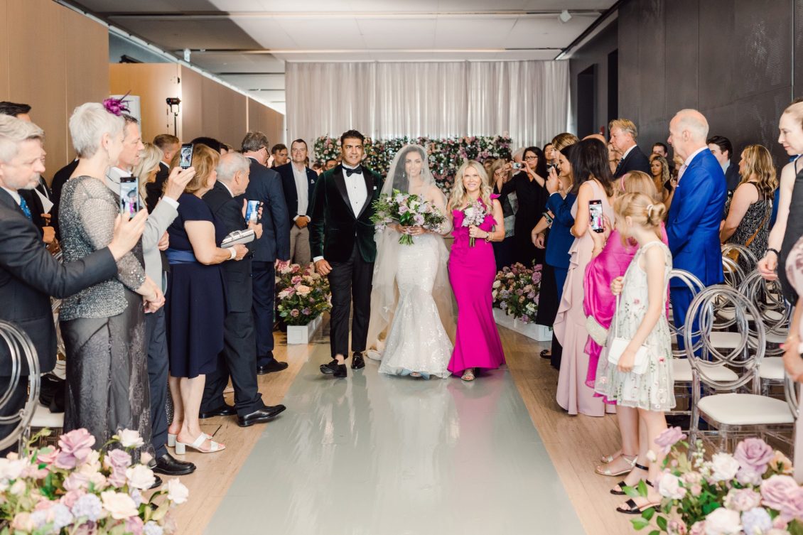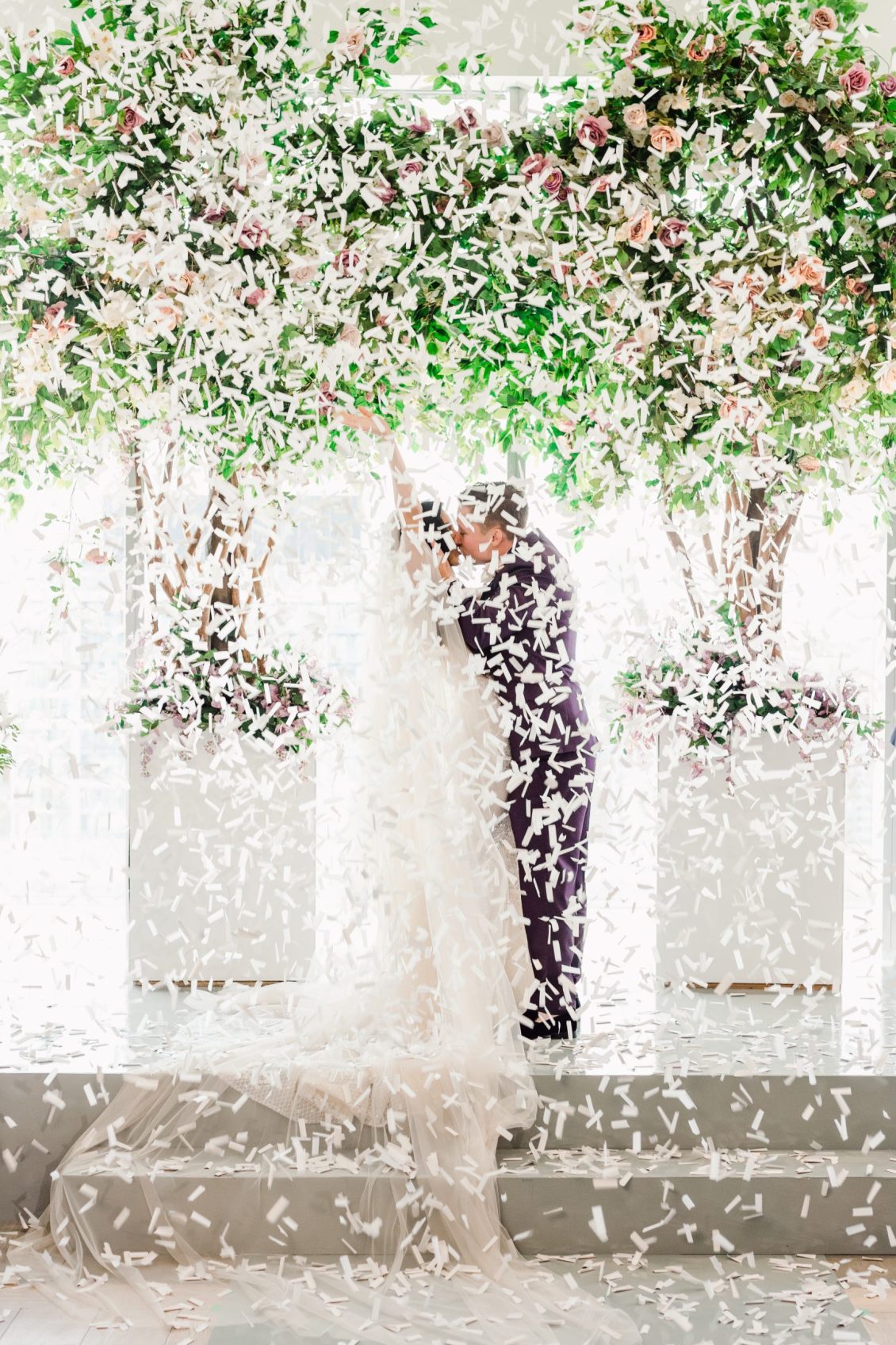After exchanging personalized vows, the couple closed the ceremony with a kiss and a confetti toss beneath the trees, stopping for a kiss and a dip halfway down the aisle.