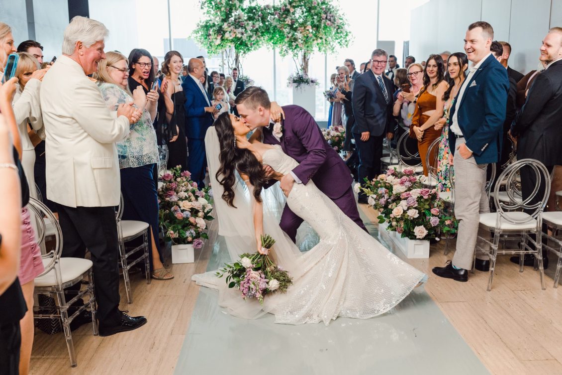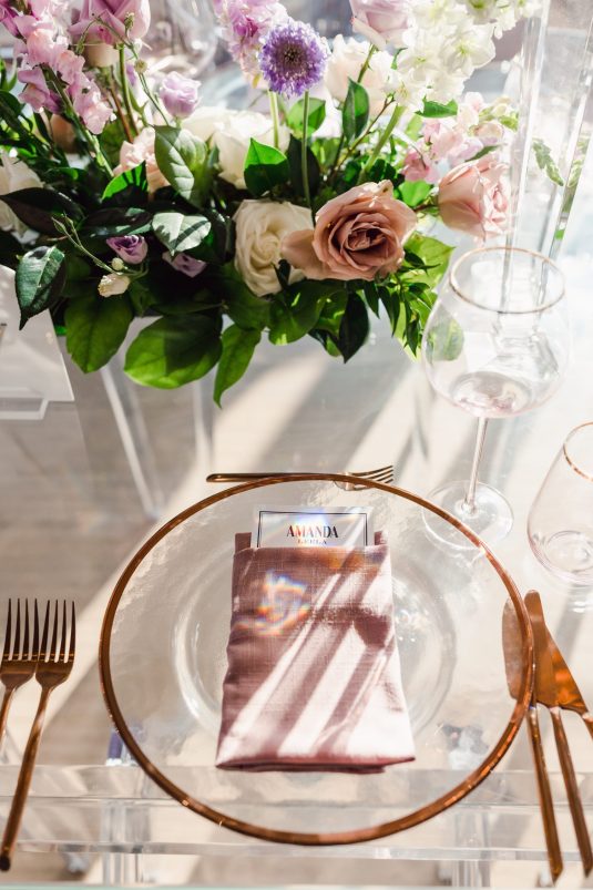 “I underwent three life-saving surgeries at seventeen years old and never thought I would make it to see my wedding day. I had always dreamed that I would either get married or have something related to my marriage in this magical place,” she explains. With this in mind, Devin orchestrated a surprise proposal to coincide with a fashion event hosted there by Amanda’s best friend. That day, Amanda had modeled for the event when her friend invited her to a wine tasting at the in-house restaurant BLUEBLOOD STEAKHOUSE. “She listed all my favourite wines, and I was sold,” explains Amanda. When they entered the wine cellar, Amanda first spotted a blonde ponytail belonging to Devin’s sister (a photographer), then Devin himself. She was speechless as he got down on one knee to ask her to marry him — so silent that he had to repeat himself before Amanda answered, “A MILLION TIMES, YES!”