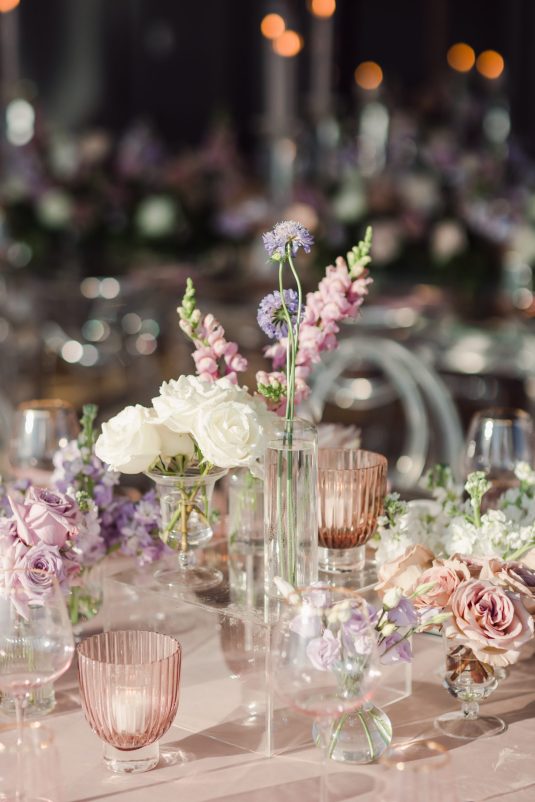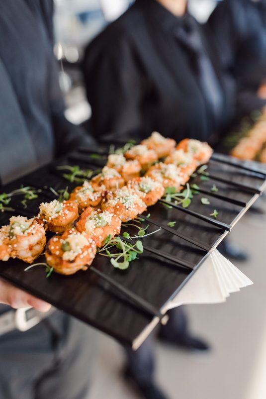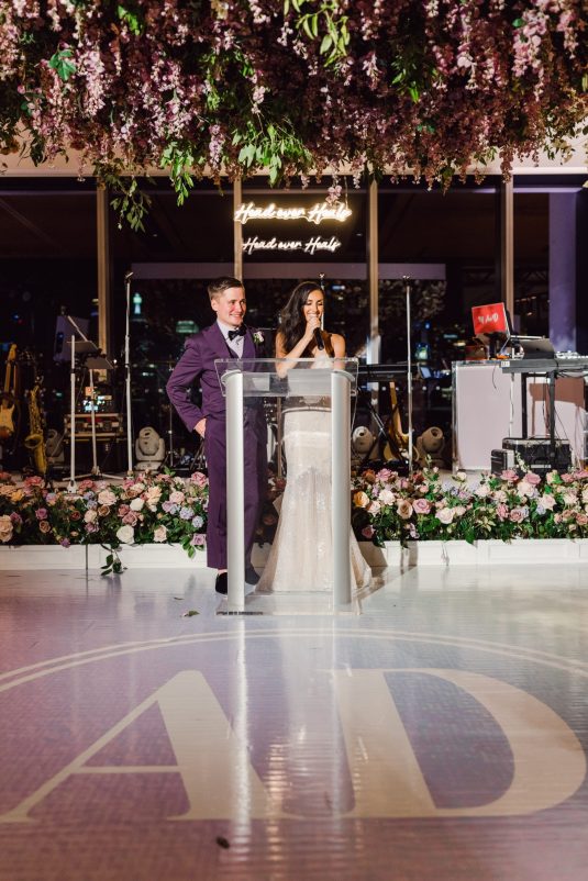 Along with passed appetizers, the food stations included dumplings and sushi (a nod to meals the couple would “order in” on Friday nights during Covid lockdowns). Signature cocktails included a TequiLeela Cosmo and a Devspresso Martini — wordplays on the couple’s names and favourite cocktails.