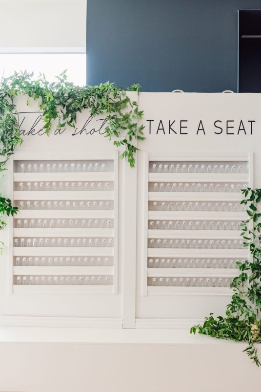 An interactive “Take a Shot, Take a Seat” tequila shot wall (inspired by Amanda’s bachelorette in Cabo) also doubled as a seating chart.