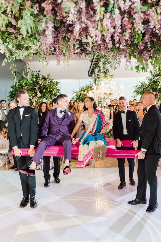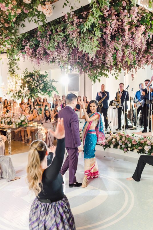 Amanda’s background is Ismaili and French, and Devin’s is Irish and British. For their grand entrance into the reception, Amanda changed into a sari and the couple danced to a choreographed routine that combined Indian and Irish styles, backed by four professional dancers.
