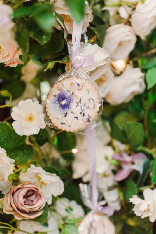 Bringing the magical garden theme full circle, guests picked their custom shortbread cookie takeaways from a floral-covered gazebo highlighted with twinkling lights. A photo booth and a liquid nitrogen ice cream station were also enjoyed during the late-night fun.