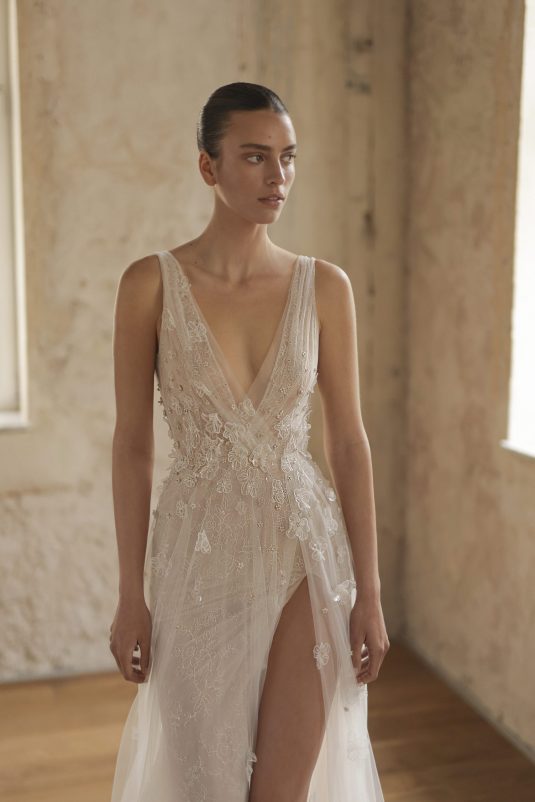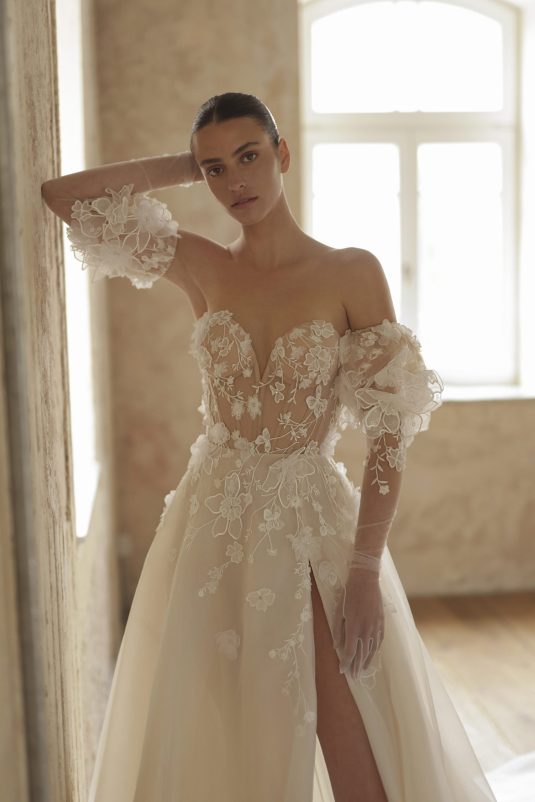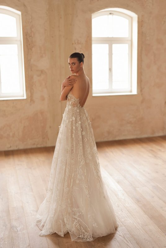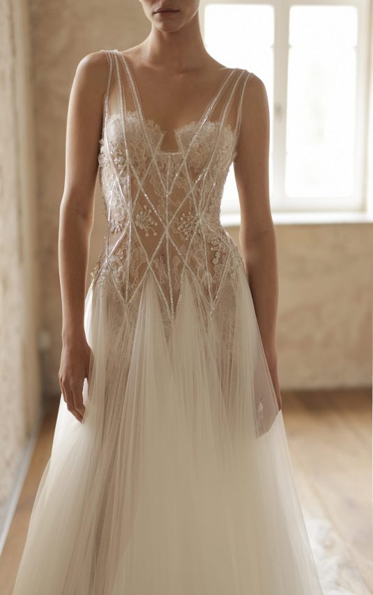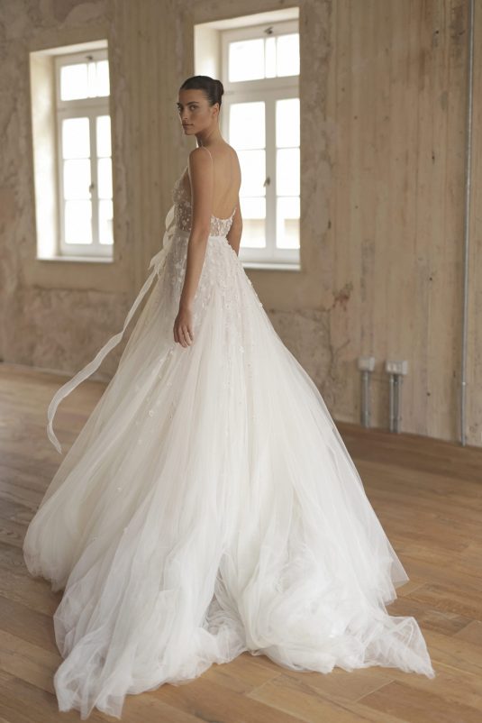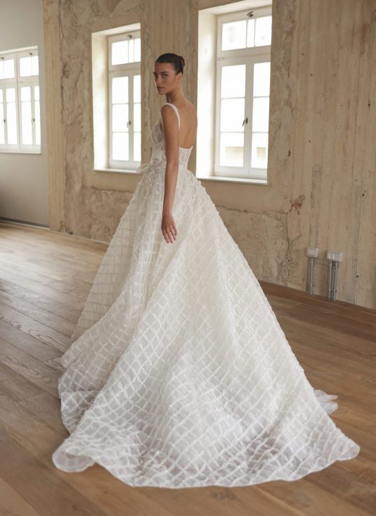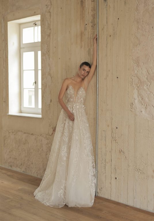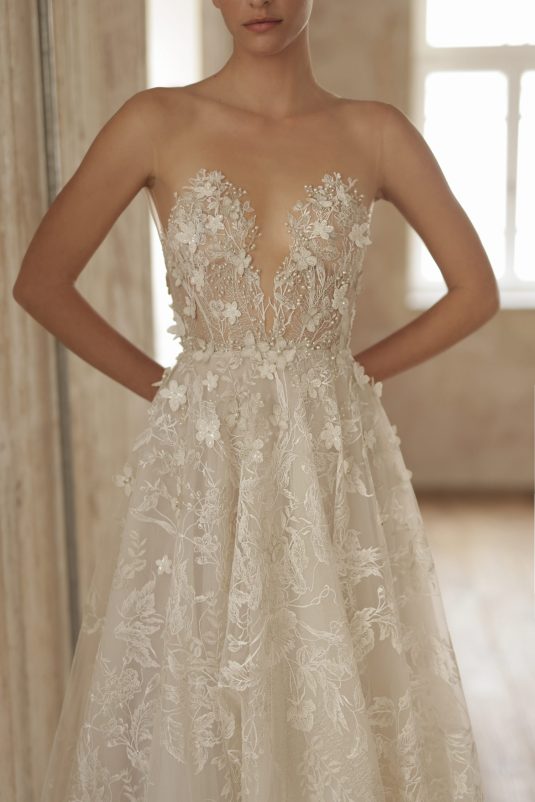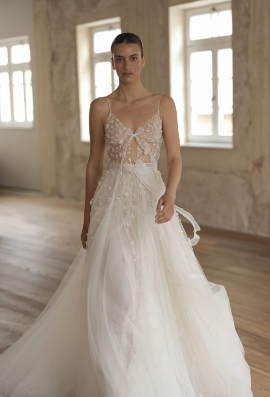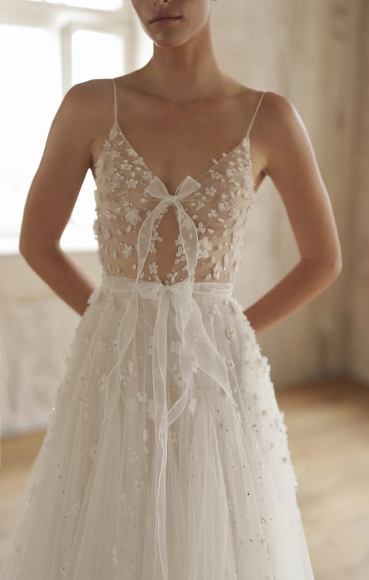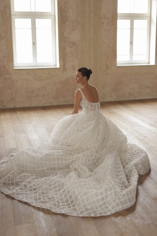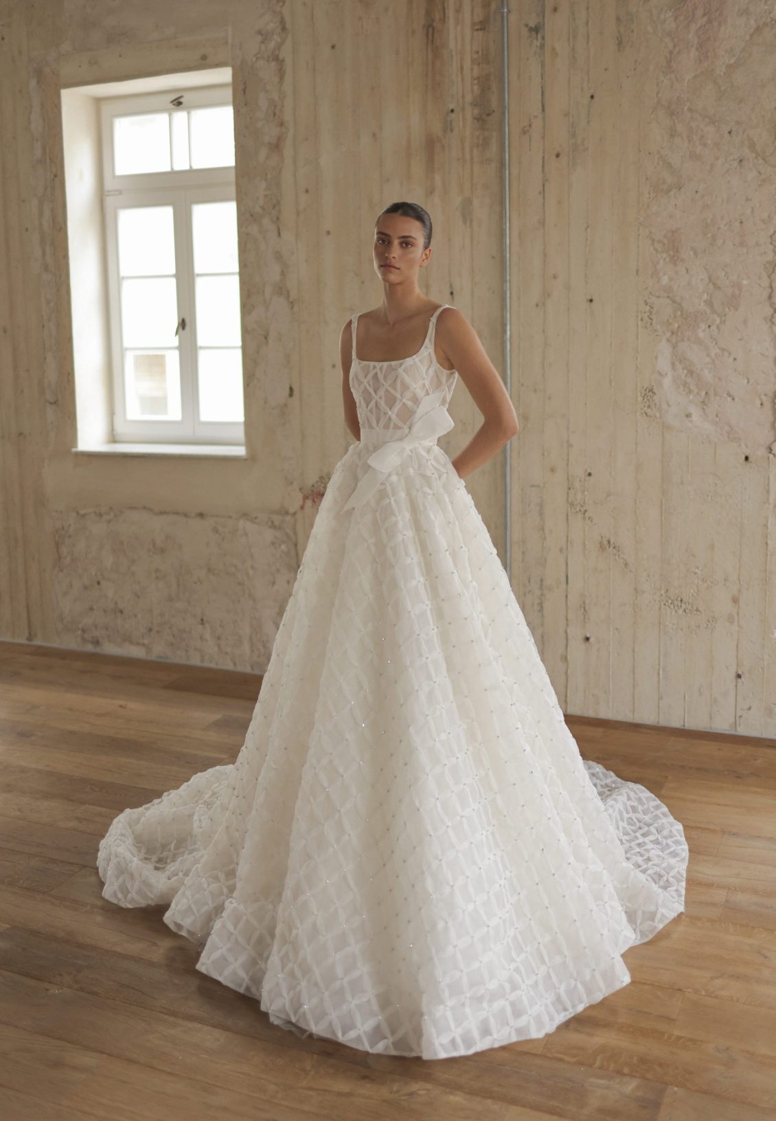 The Liz Martinez Spring/Summer 2024 Collection, “La Dimora,” was made for the bride who loves the sheer gown trend! We’re obsessed with the beautiful Swarovski-studded lattice pattern of sheer ribbons on the Dahlia gown. Find your favourite below!