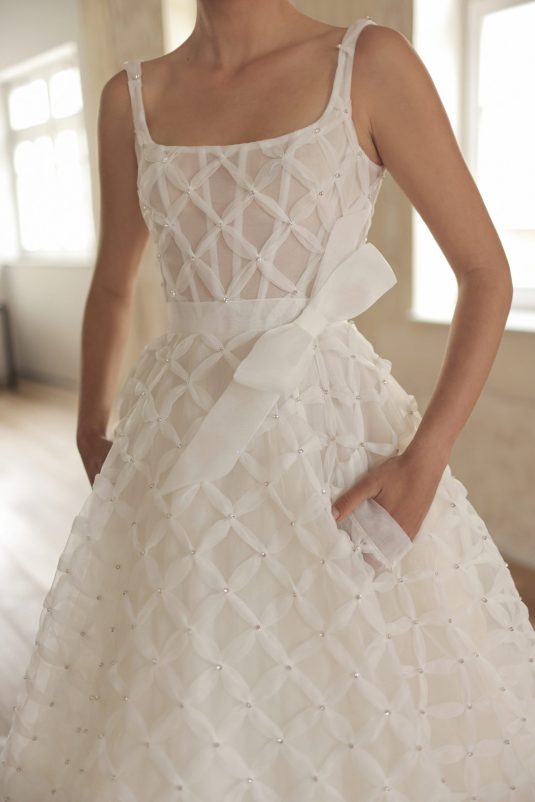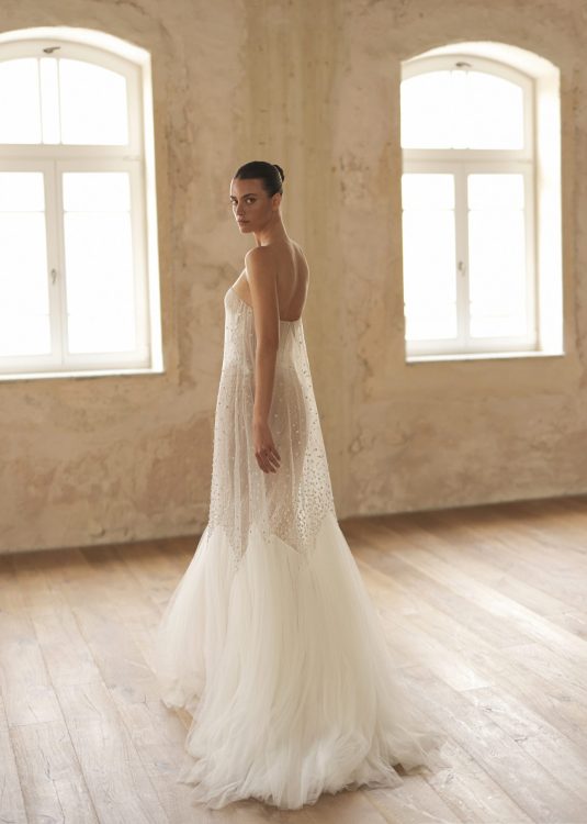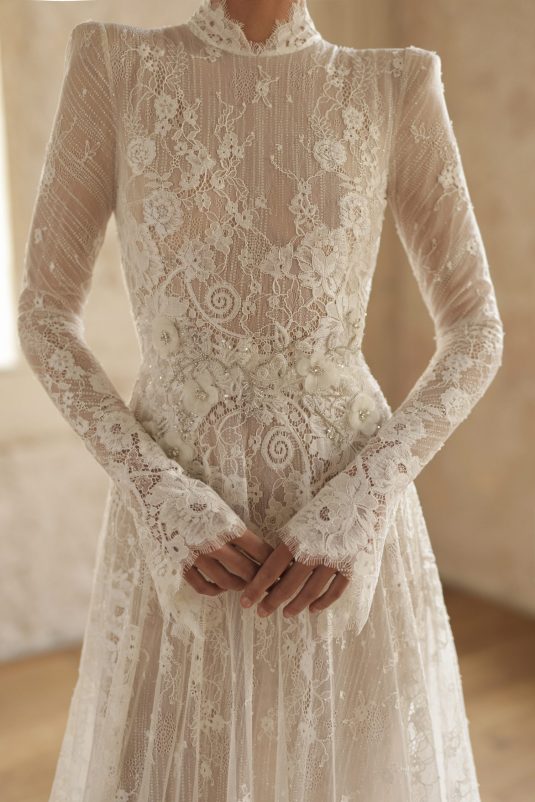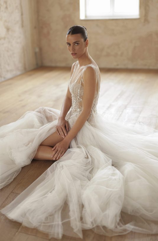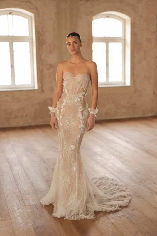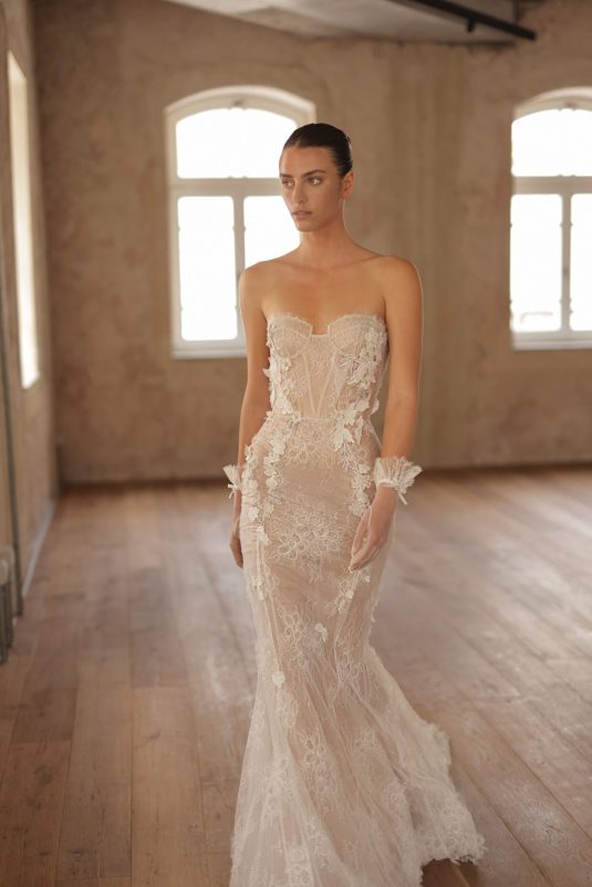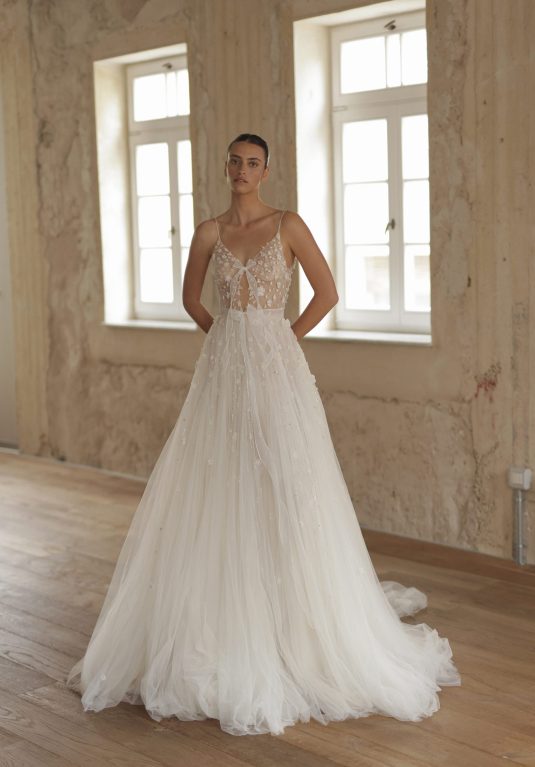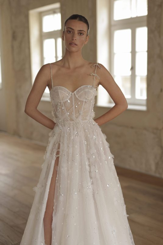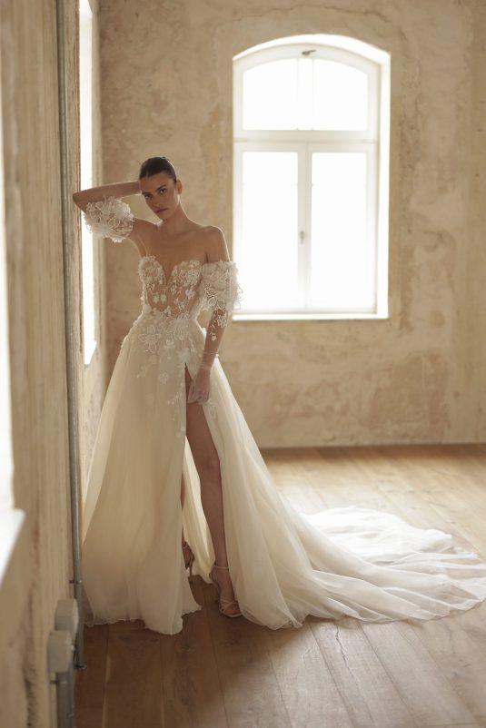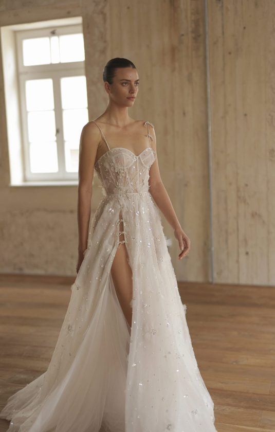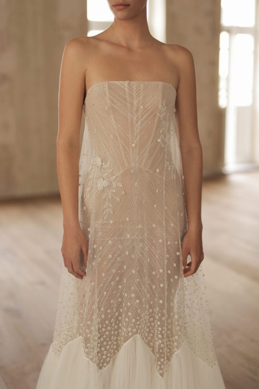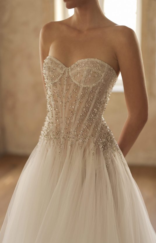 The Liz Martinez Spring/Summer 2024 Collection, “La Dimora,” was made for the bride who loves the sheer gown trend! We’re obsessed with the beautiful Swarovski-studded lattice pattern of sheer ribbons on the Dahlia gown. Find your favourite below!