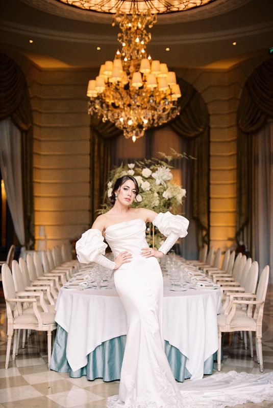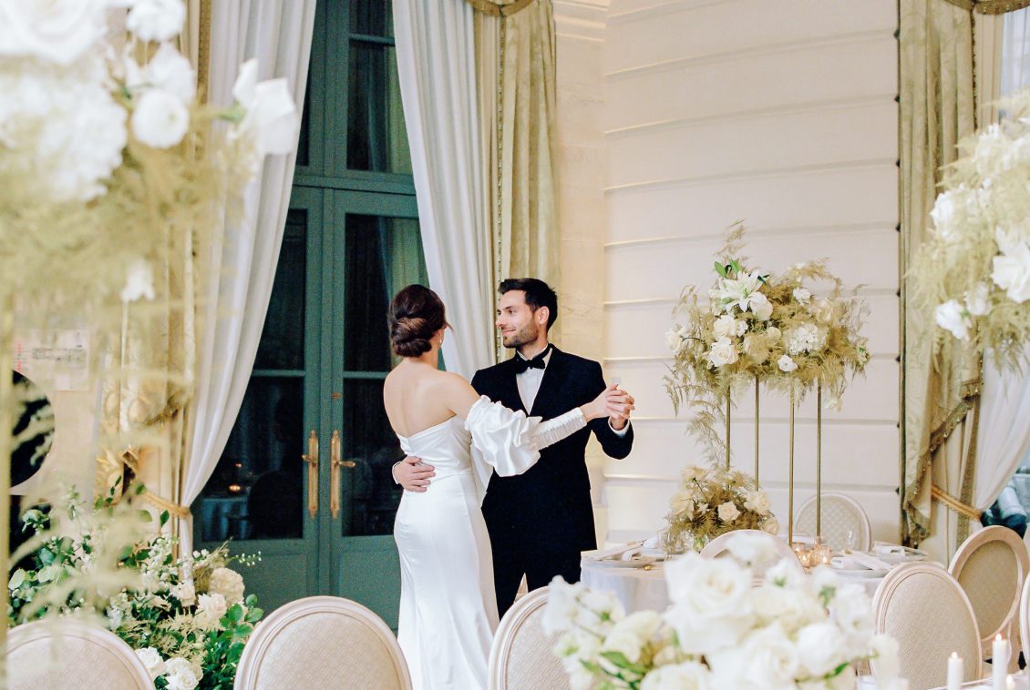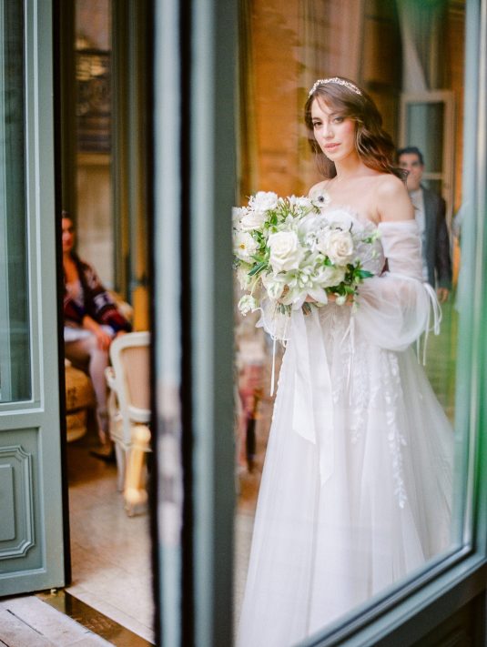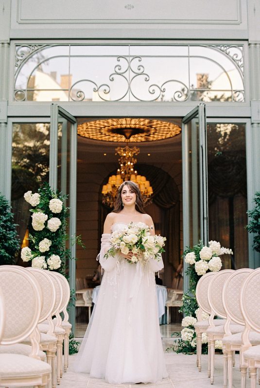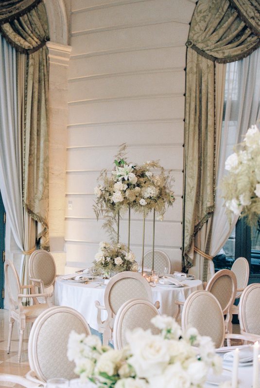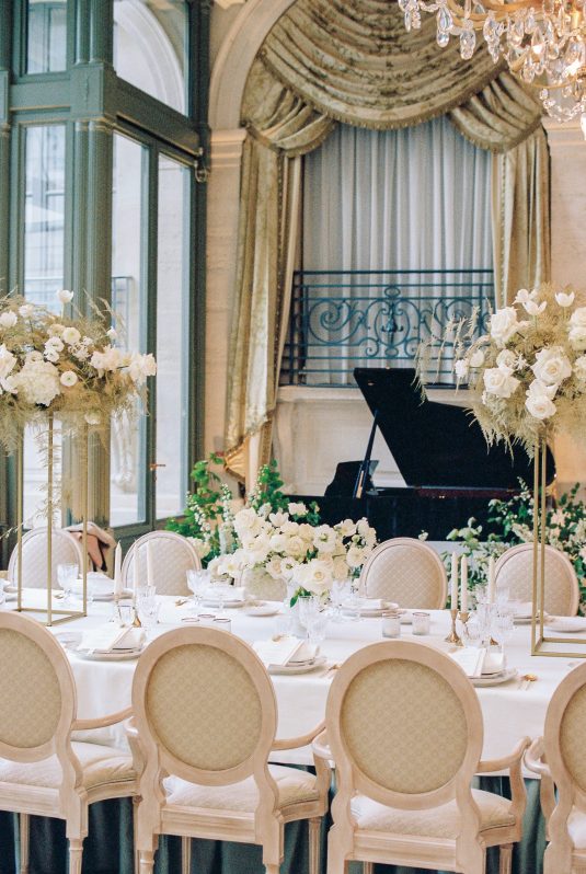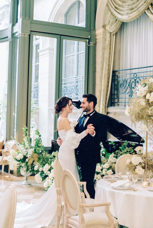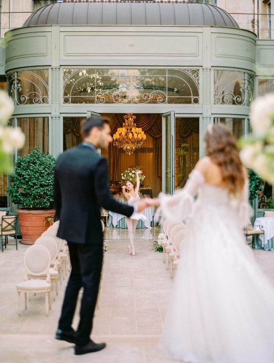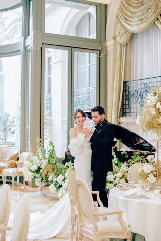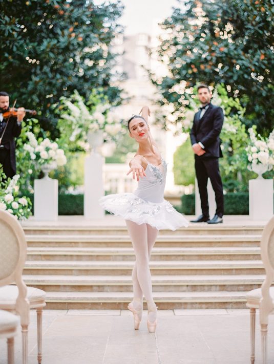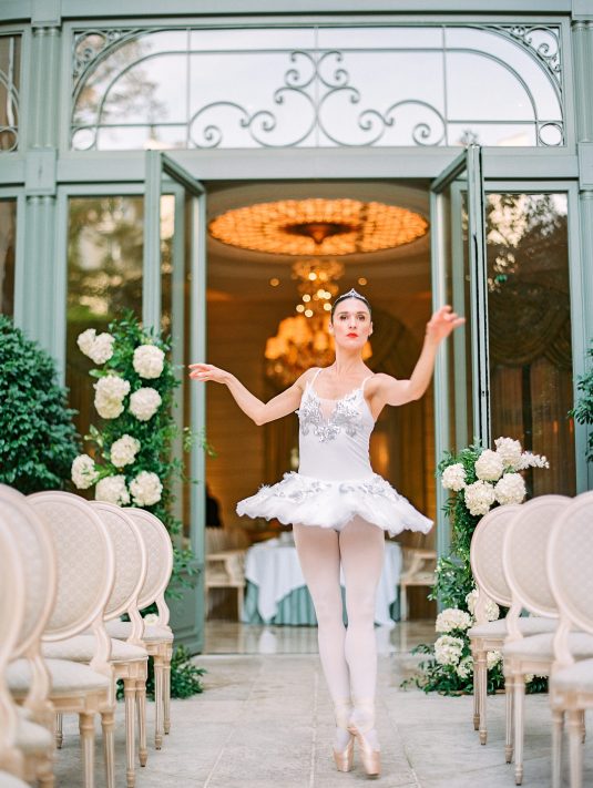 Bonjour, Paris! This styled shoot at The Ritz Paris takes design cues from Chanel, incorporating plentiful white florals and candles that smell just like Chanel #5 for a signature scent. The intimate wedding celebration is complete with live entertainment, including a violinist, a pianist, and a ballerina, as well as a several stunning fashion moments — because why settle for one look on the big day?