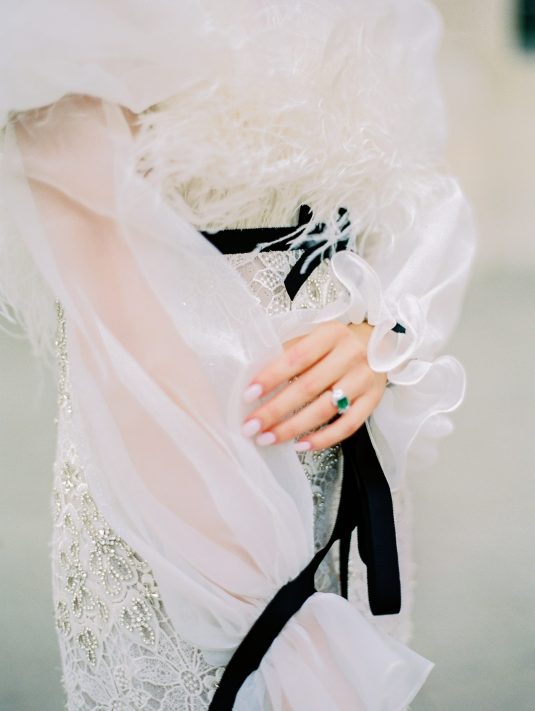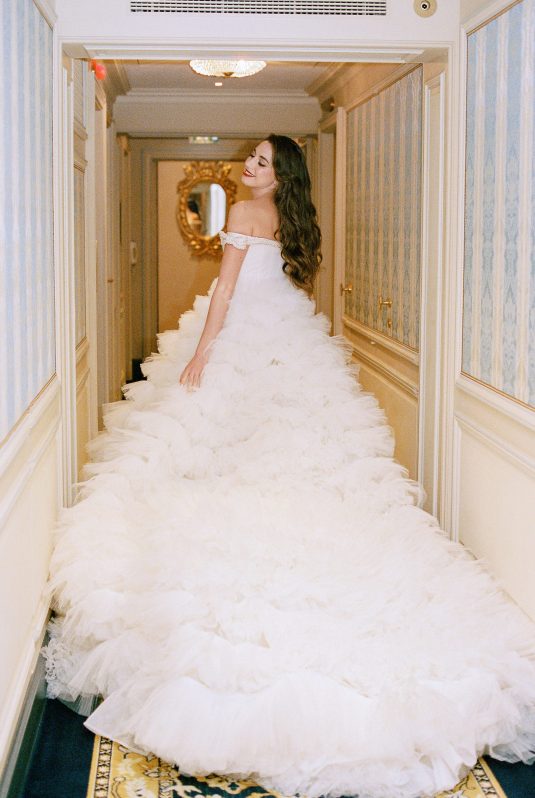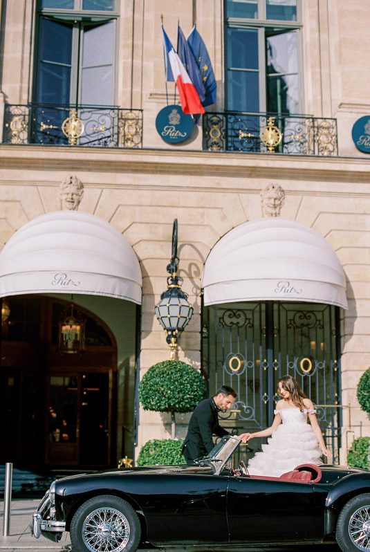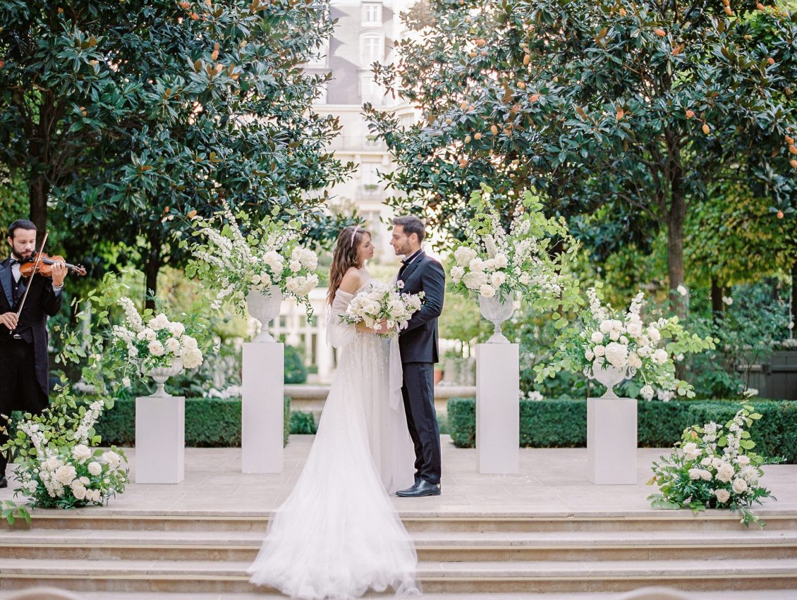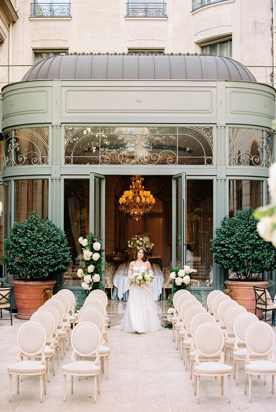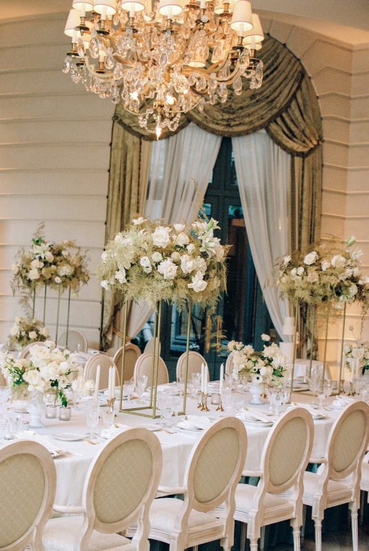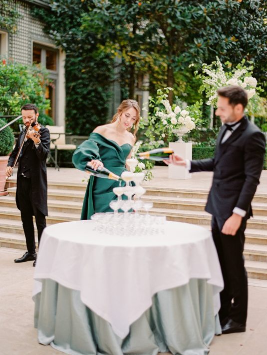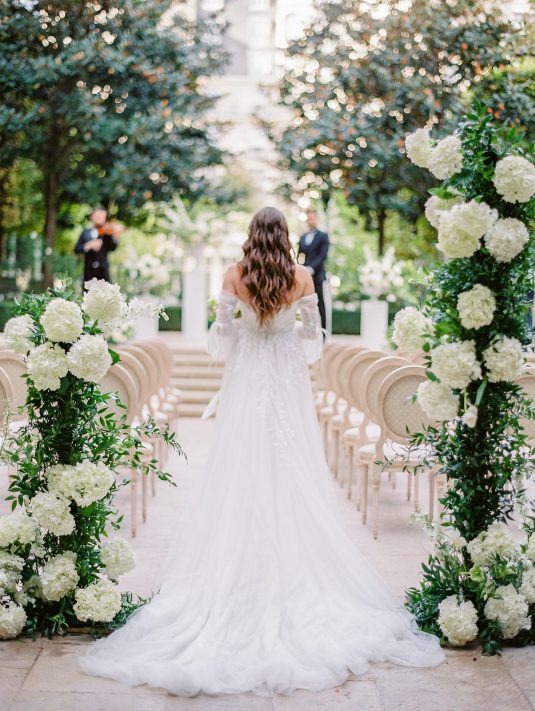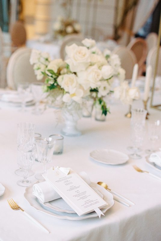 Bonjour, Paris! This styled shoot at The Ritz Paris takes design cues from Chanel, incorporating plentiful white florals and candles that smell just like Chanel #5 for a signature scent. The intimate wedding celebration is complete with live entertainment, including a violinist, a pianist, and a ballerina, as well as a several stunning fashion moments — because why settle for one look on the big day?