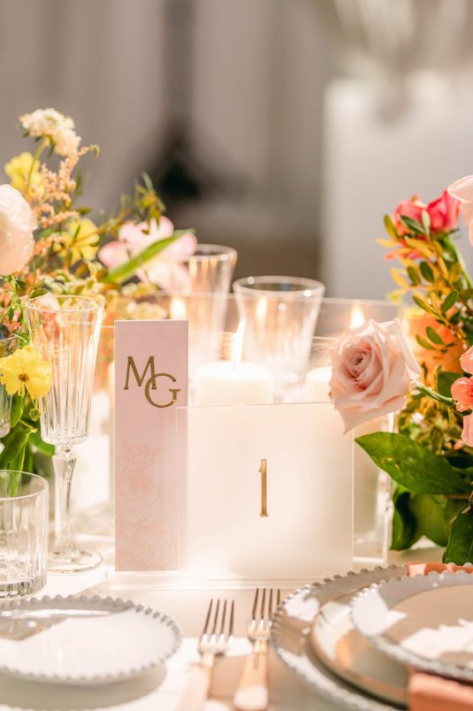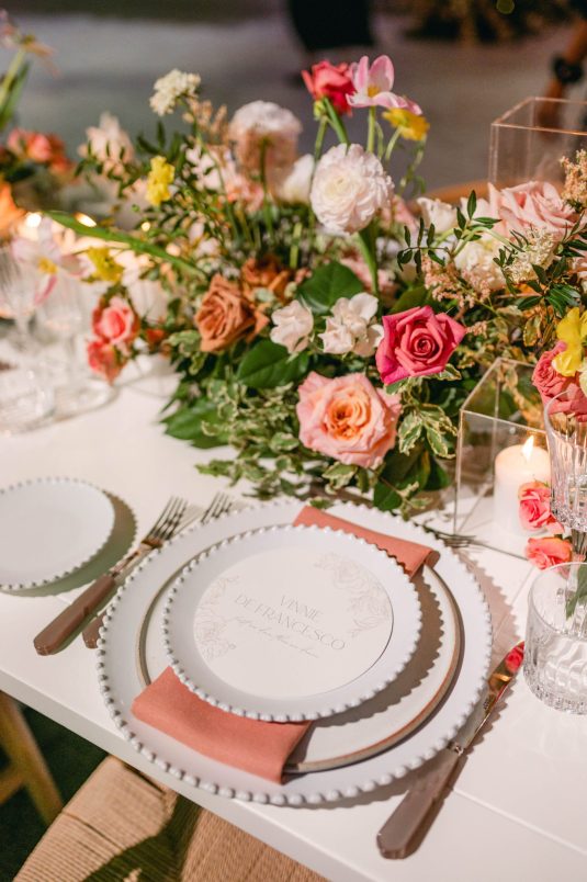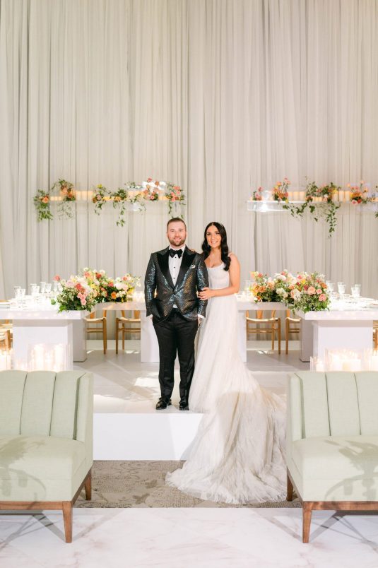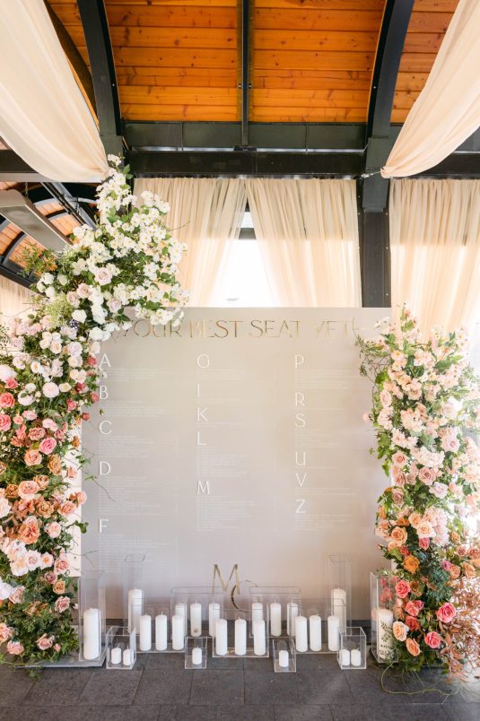 “Melissa and Gianfranco’s wedding was one-of-a kind in design. It is unlike anything we have ever put into motion,” says event planner Michelle Cundari of Sincerely Yours Events . “We wanted people to enter the reception and feel as though they were in a space unlike any they had dined in before that evening. Hence, why the seating chart said ‘your best seat yet’!”