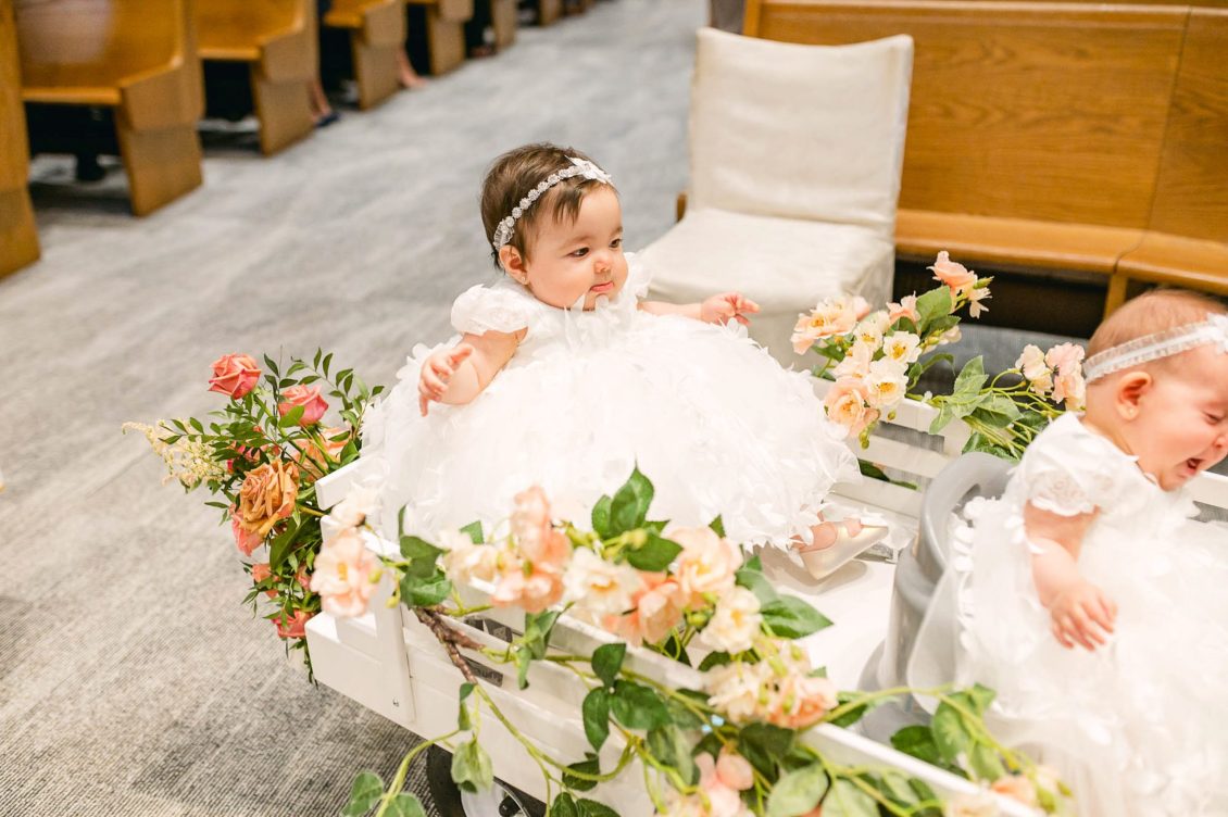 Melissa’s little nieces, the flower girls, were pulled down the aisle in a custom wagon (covered in flowers) built especially for the ceremony. “They were the cutest addition!” she remembers.