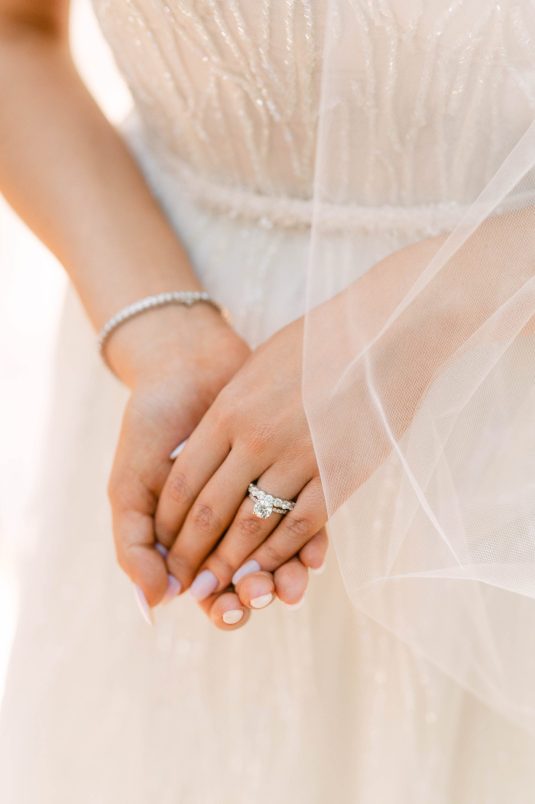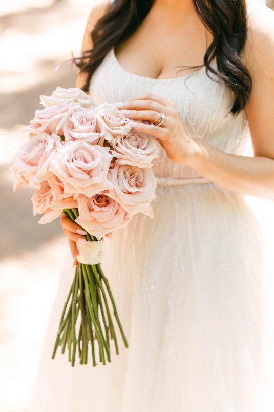 Gianfranco carried a picnic basket with him, leading Melissa to a beautiful location in the grass amongst the trees. Thinking they would be enjoying a breakfast picnic together, she was surprised when he laid out a blanket and unpacked the only remaining content of the basket – a ring box! A “socially-distanced” photographer was hired by Gianfranco to secretly capture the moment. He had also invited their parents and siblings to wait nearby to celebrate afterward.