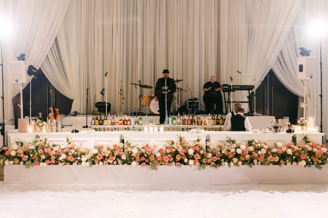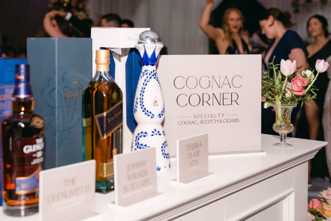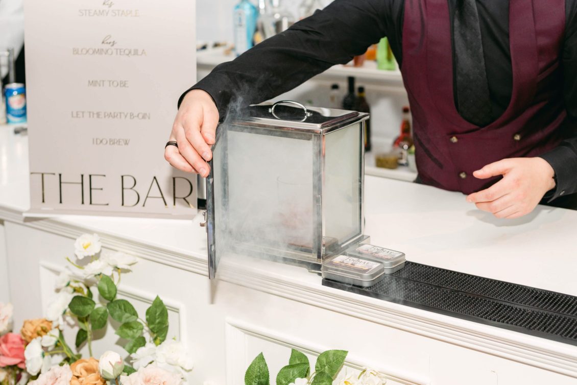 The couple worked closely with MIXOLOGY MATT who crafted a menu of four specialty cocktails. A Tequila sour with elderflower (“The Bride’s Blooming Tequila”), a smoky old fashioned (“The Groom’s Steamy Staple”), a raspberry mojito (the “Mint to Be”), and a chocolate espresso martini (the “I Do Brew”), were served all night long.