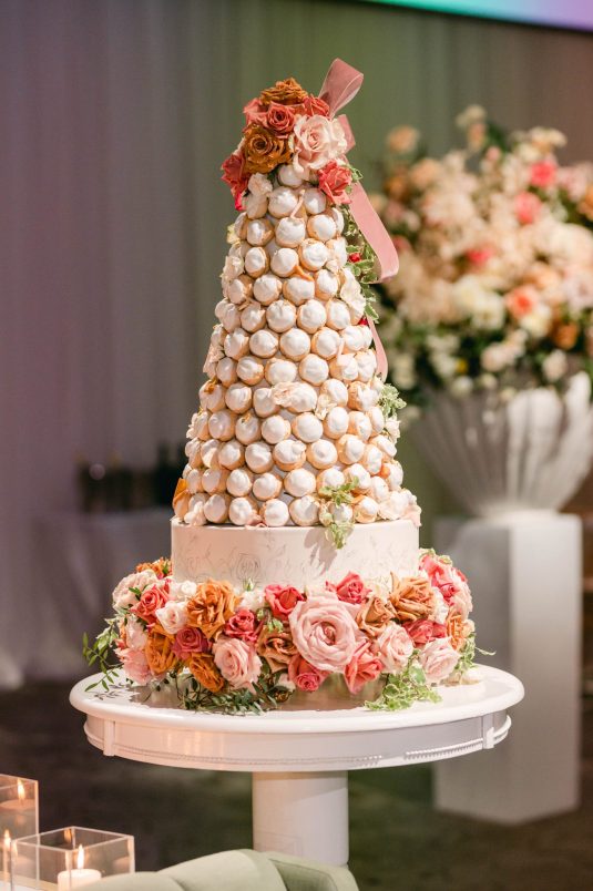 In lieu of a traditional wedding cake, a croquembouche made from 250 vanilla cream puffs sat atop a hand-painted cake tier, decorated with fresh flowers and a pink ribbon.
