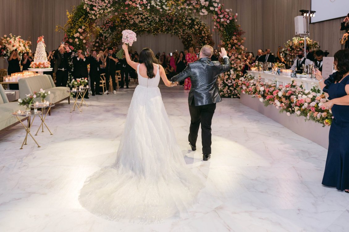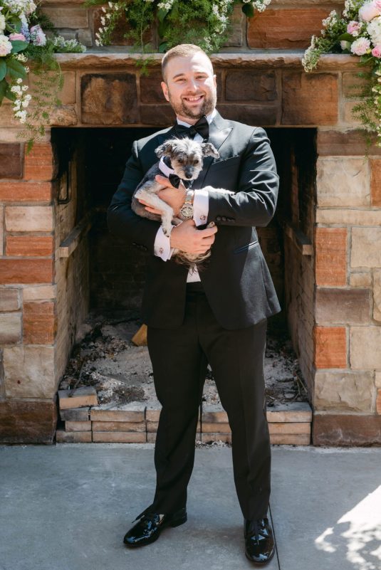 For the reception, Gianfranco changed into a second custom suit from KING & BAY. The metallic Jacquard smoking jacket and white dress shirt with black Swarovski crystal closures allowed Gianfranco to make a bold fashion statement for the party, and matched his bright personality. The bride and groom each sparkled all night long!