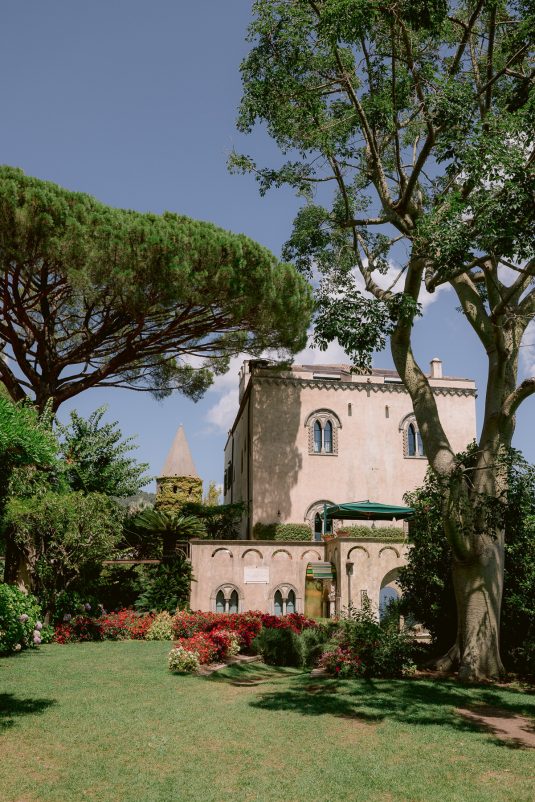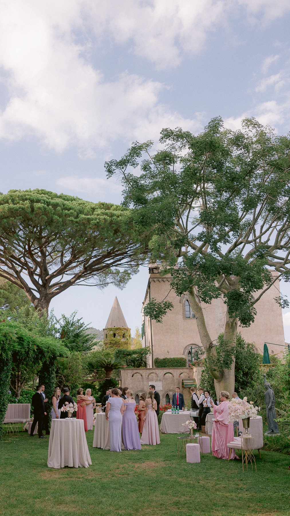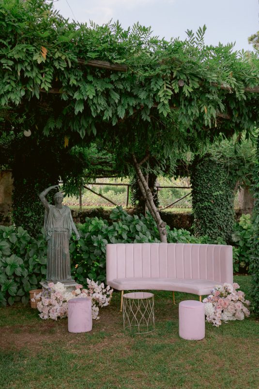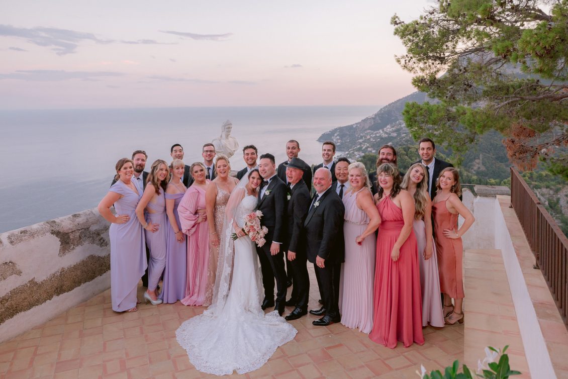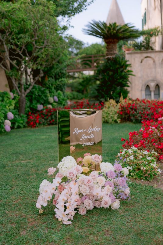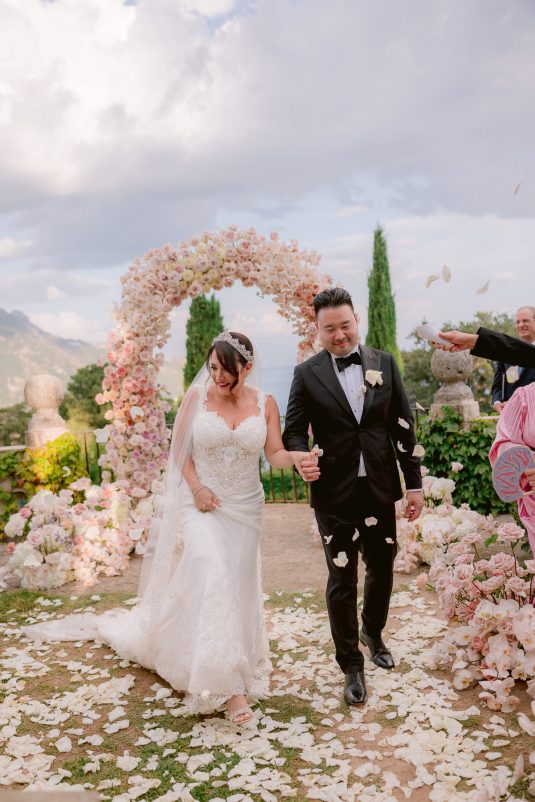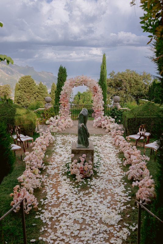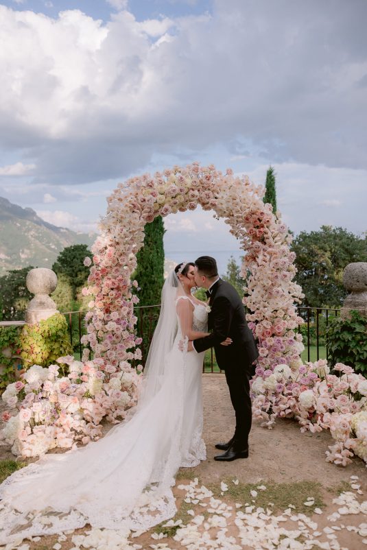Together with 22 of their loved ones, bride and groom Lyndsey and Ryan celebrated their wedding with a five-day-long coastal holiday in Italy, selecting the beautiful VILLA CIMBRONE for their wedding day venue. The al fresco ceremony featured an aisle of flower petals leading to a dreamy pink floral arch for the couple’s “I Dos” and was followed by a garden cocktail hour where guests could show off their stylish looks — the dress code was a color palette to match the wedding decor!