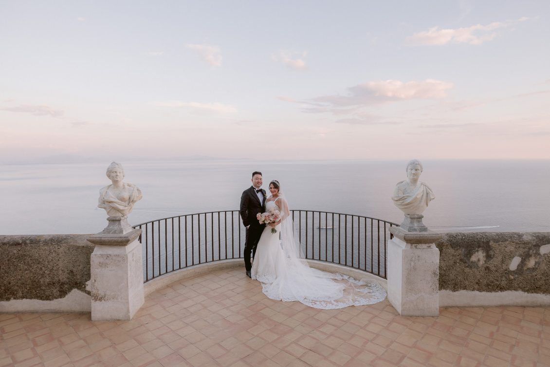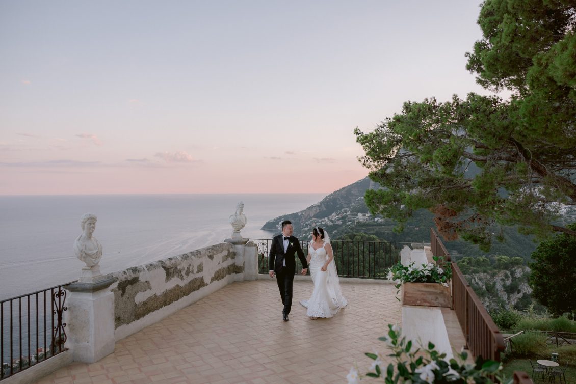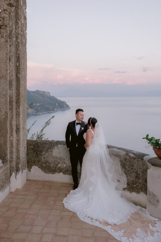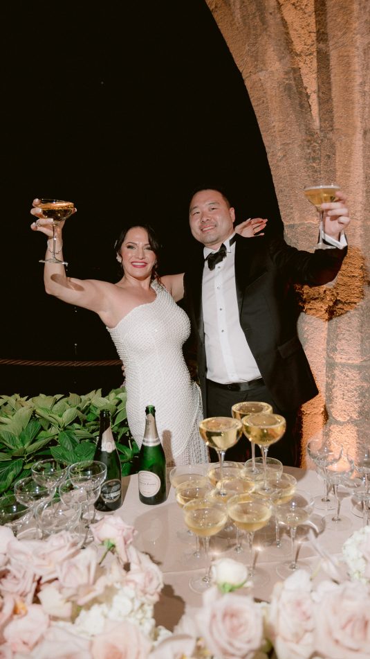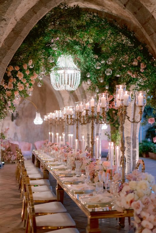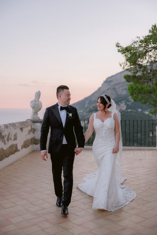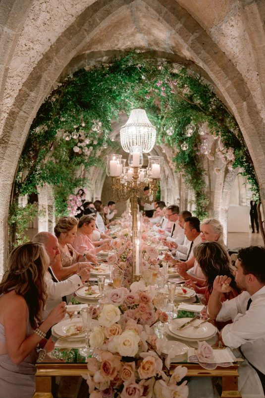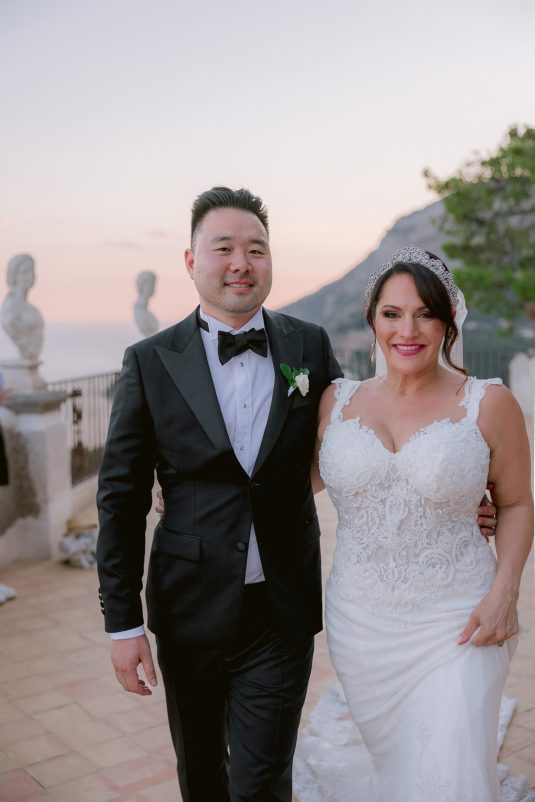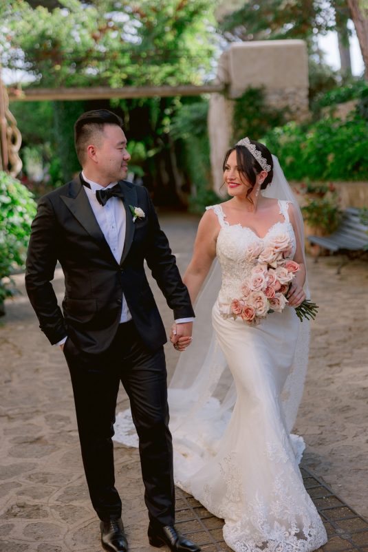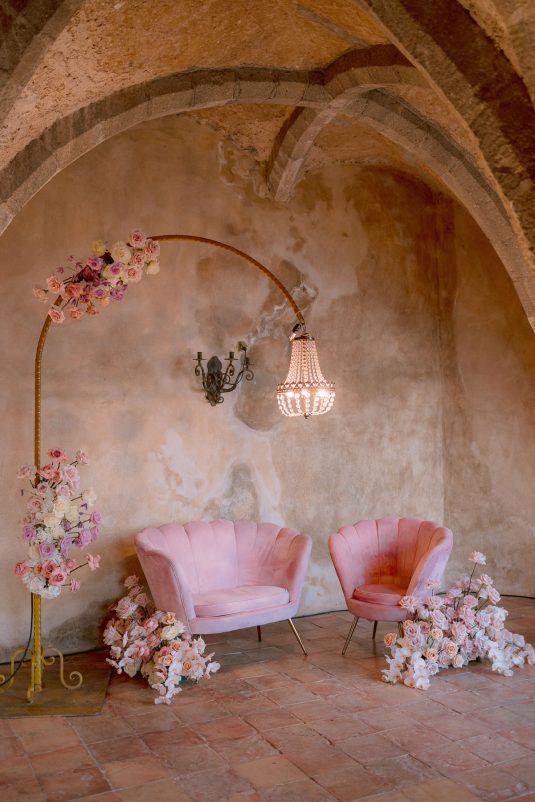 Together with 22 of their loved ones, bride and groom Lyndsey and Ryan celebrated their wedding with a five-day-long coastal holiday in Italy, selecting the beautiful VILLA CIMBRONE for their wedding day venue. The al fresco ceremony featured an aisle of flower petals leading to a dreamy pink floral arch for the couple’s “I Dos” and was followed by a garden cocktail hour where guests could show off their stylish looks — the dress code was a color palette to match the wedding decor!