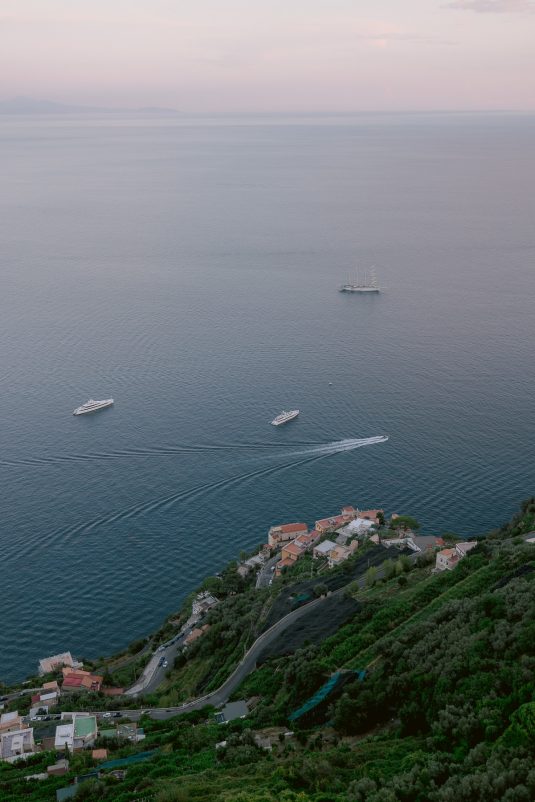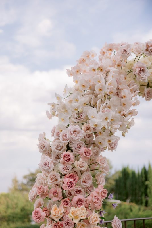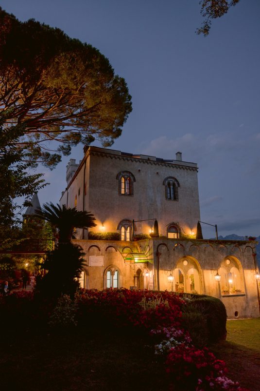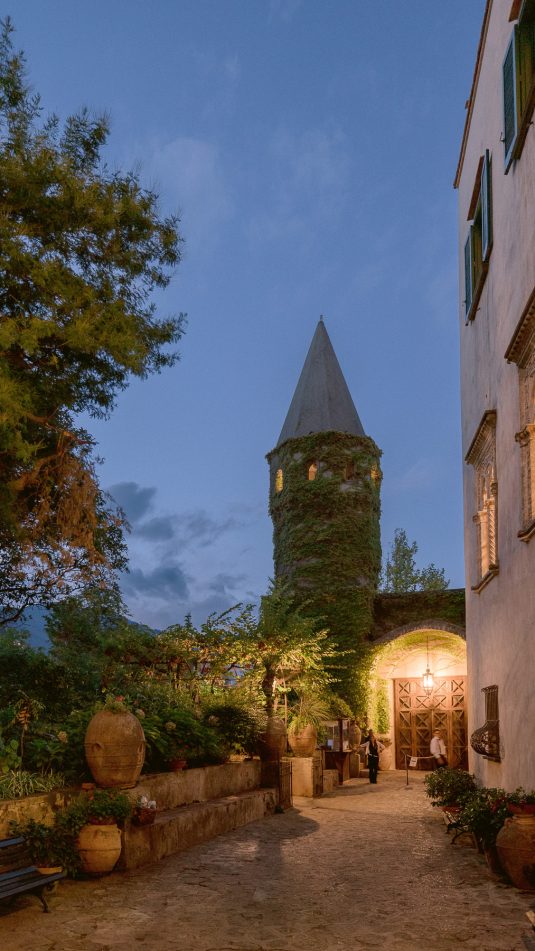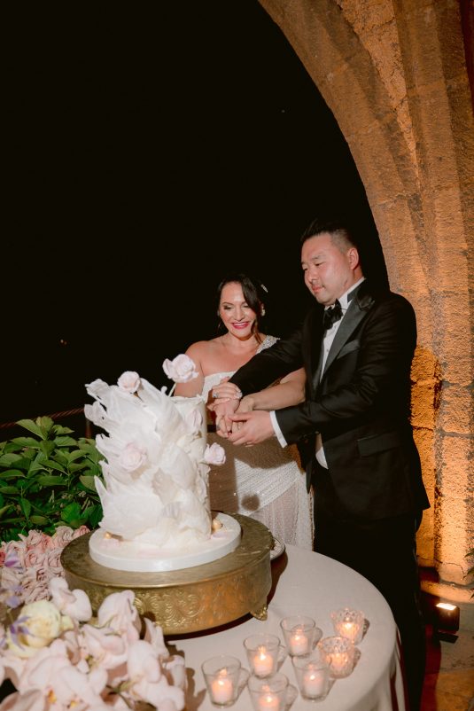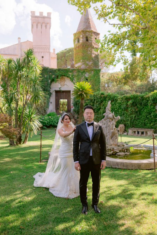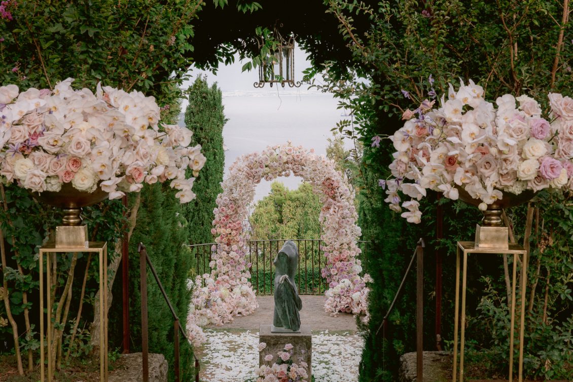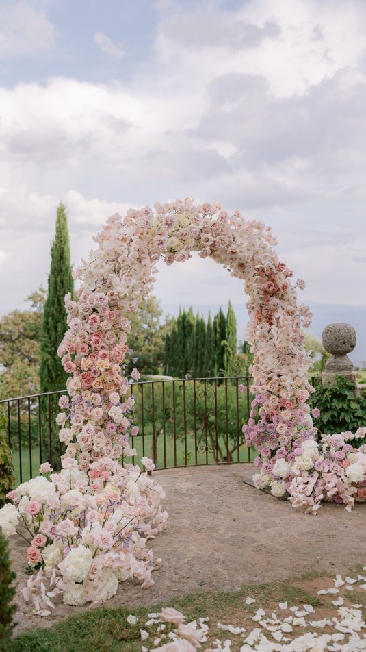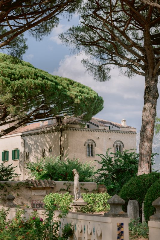 Together with 22 of their loved ones, bride and groom Lyndsey and Ryan celebrated their wedding with a five-day-long coastal holiday in Italy, selecting the beautiful VILLA CIMBRONE for their wedding day venue. The al fresco ceremony featured an aisle of flower petals leading to a dreamy pink floral arch for the couple’s “I Dos” and was followed by a garden cocktail hour where guests could show off their stylish looks — the dress code was a color palette to match the wedding decor!