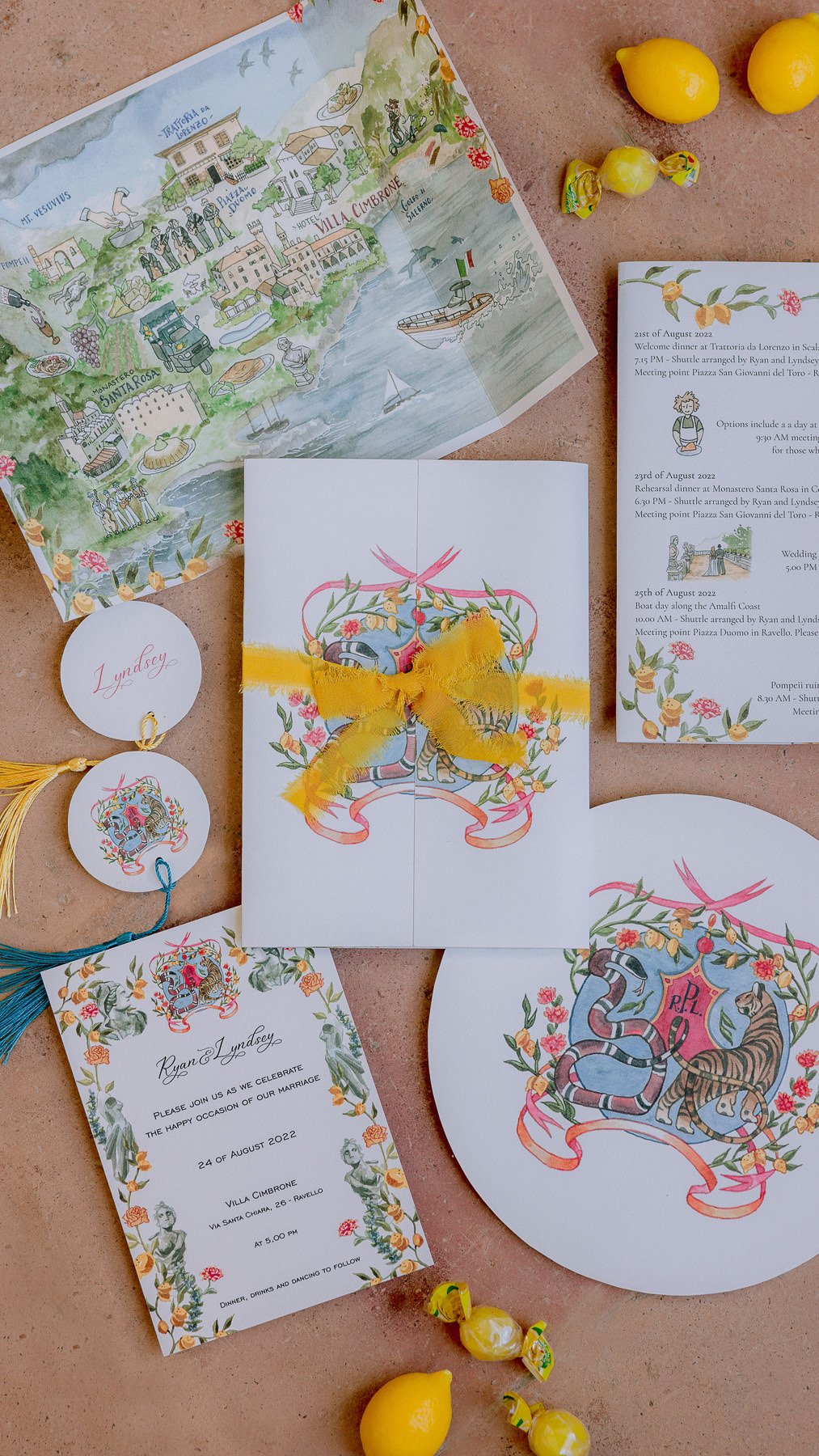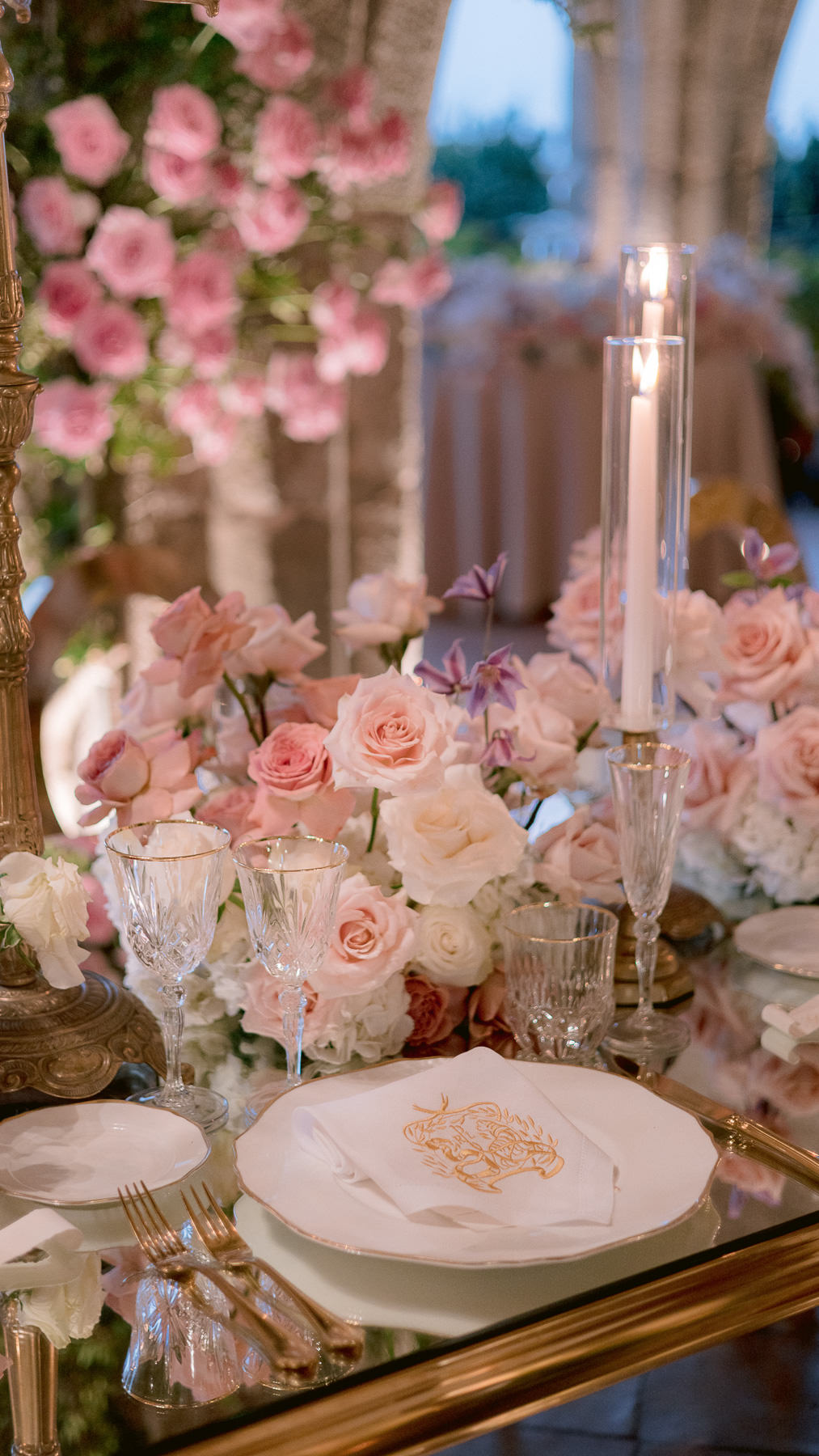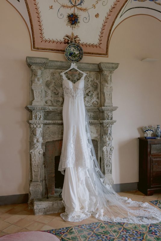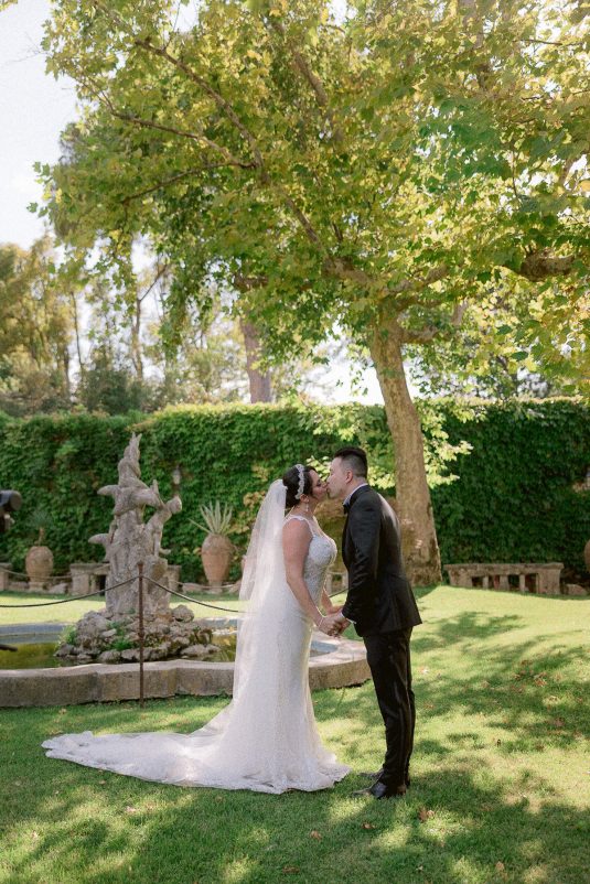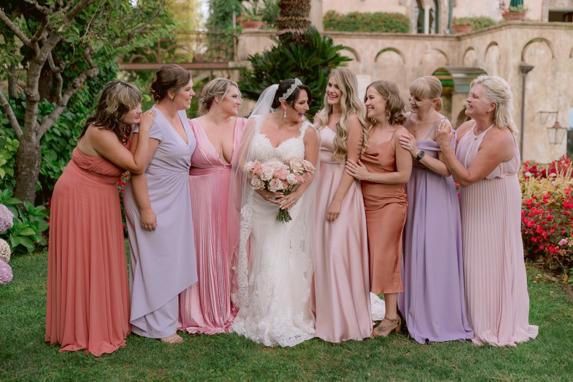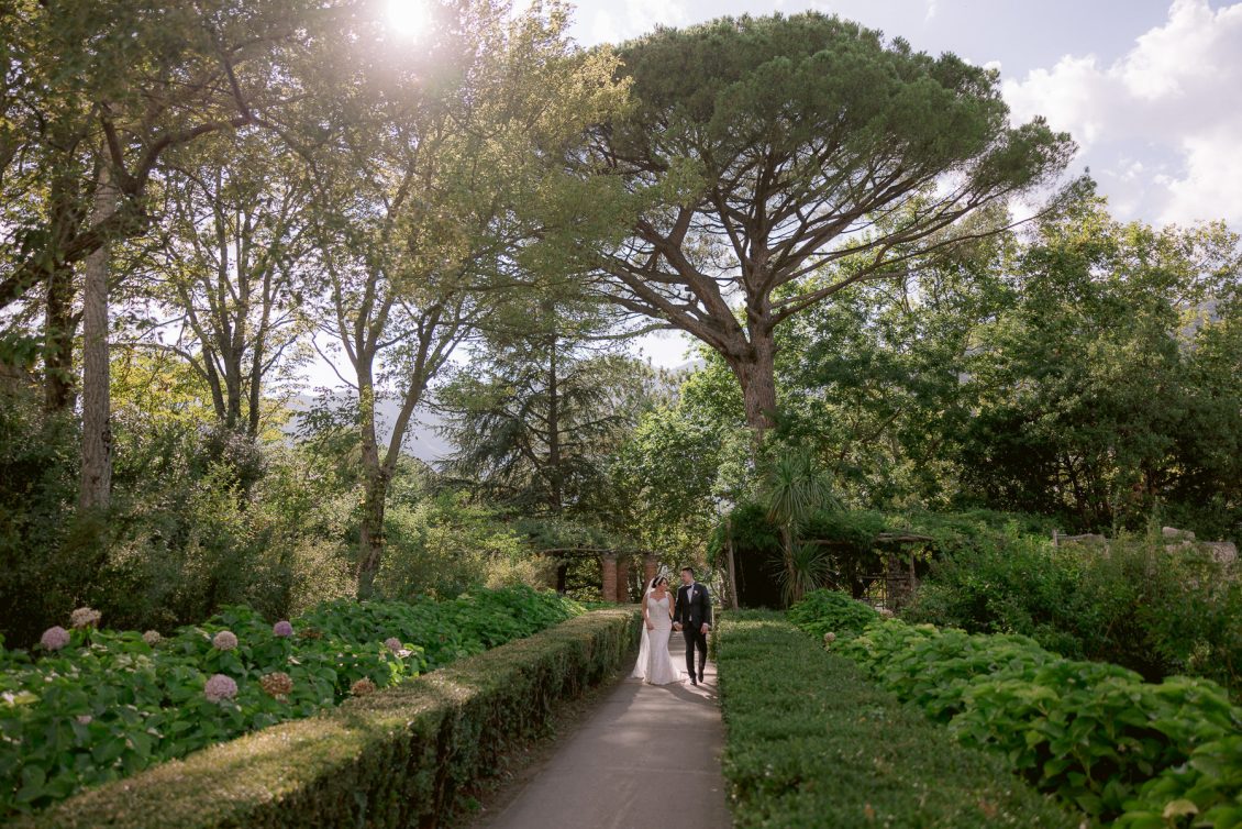 Together with 22 of their loved ones, bride and groom Lyndsey and Ryan celebrated their wedding with a five-day-long coastal holiday in Italy, selecting the beautiful VILLA CIMBRONE for their wedding day venue. The al fresco ceremony featured an aisle of flower petals leading to a dreamy pink floral arch for the couple’s “I Dos” and was followed by a garden cocktail hour where guests could show off their stylish looks — the dress code was a color palette to match the wedding decor!