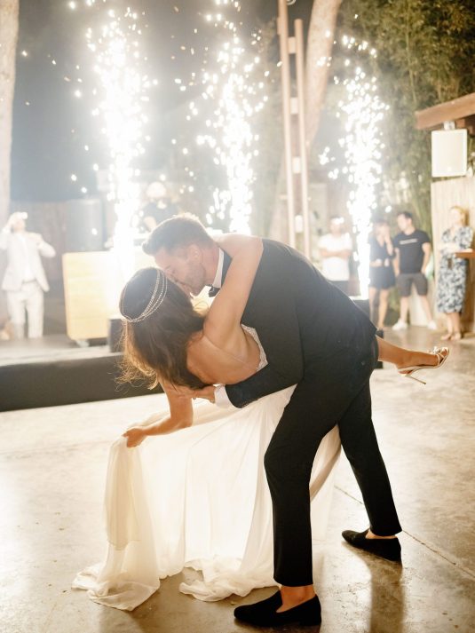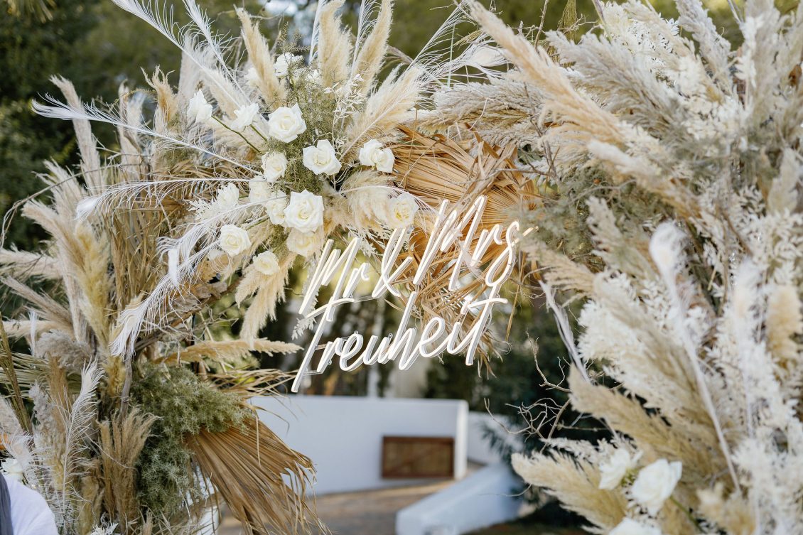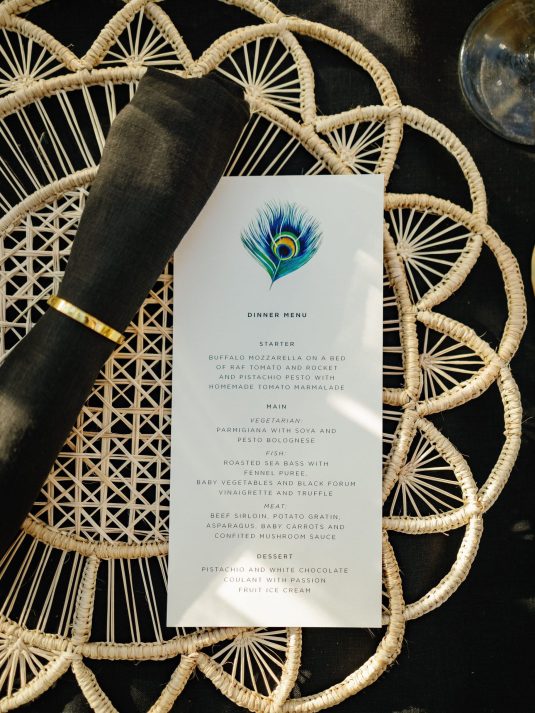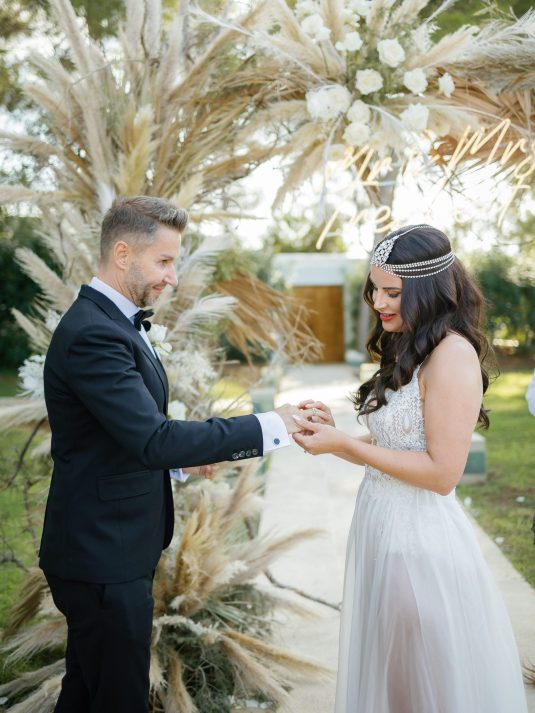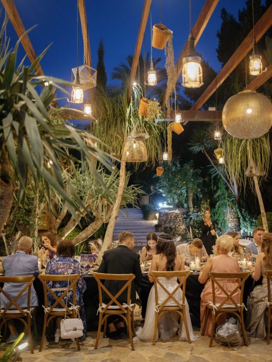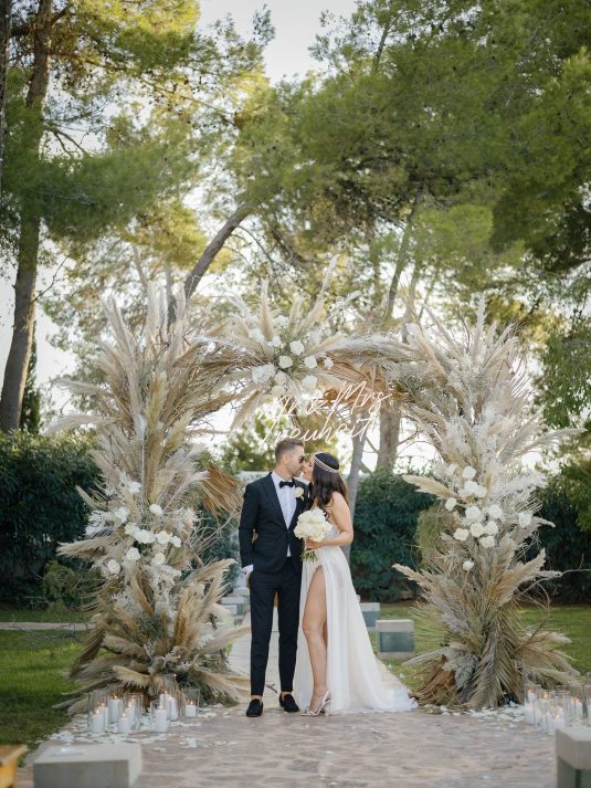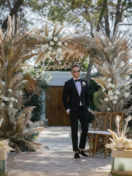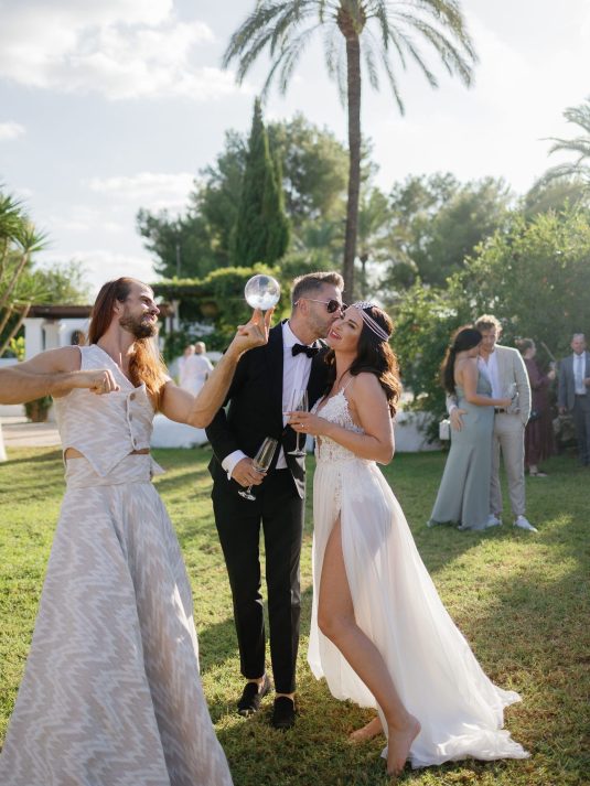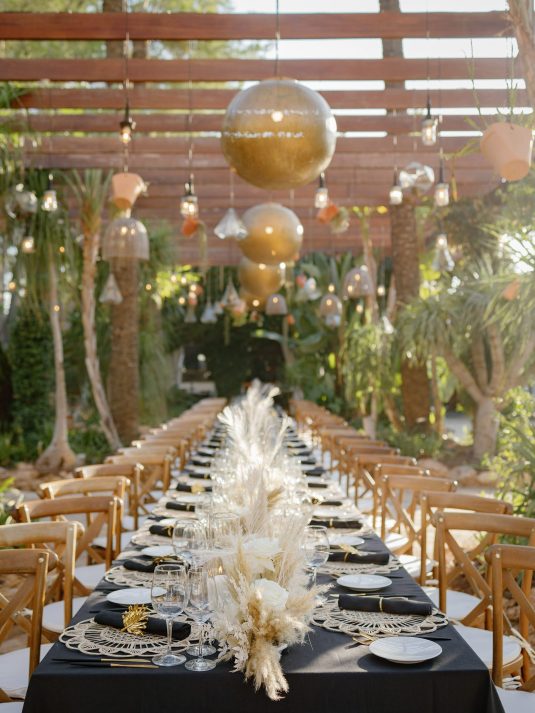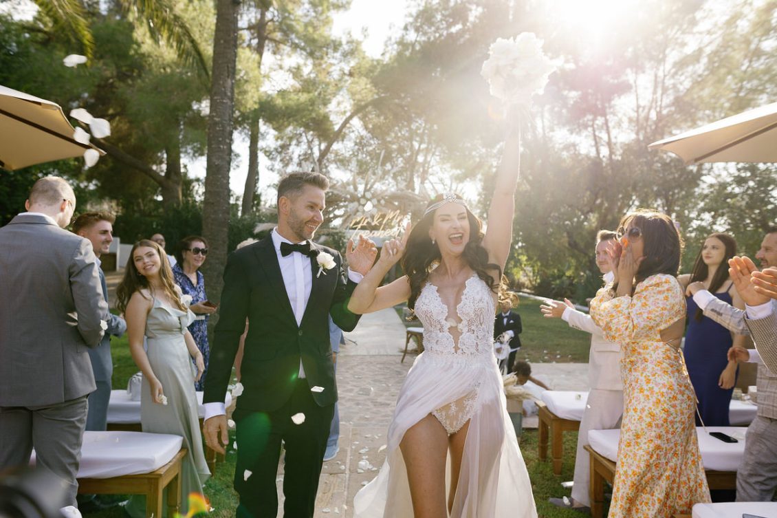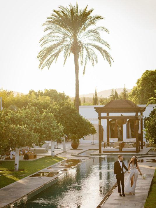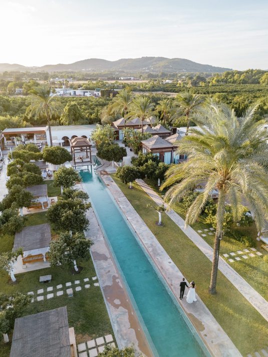 To set the tone for their wedding, Silvia and Thomas chose the dreamy ATZARO AGROTURISMO, a luxury hotel on the island of Ibiza, Spain, as the venue (which also happens to be the home of eight peacocks — yes, pictured below!). The bride spent the morning-of lounging by the pool with her girls before getting ready and stepping into a bespoke wedding dress and a jeweled headpiece from Jennifer Behr. A dinner reception was held following the couple’s “I Dos” beneath a pampas grass floral arch, and instead of a wedding cake, guests toasted to love and life with a shot of tequila!