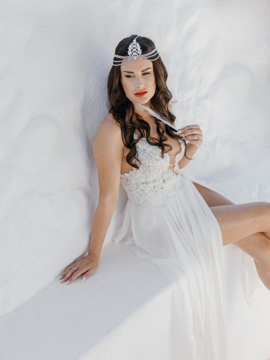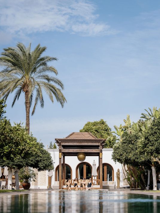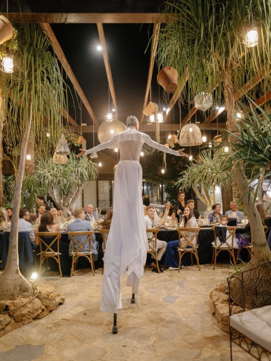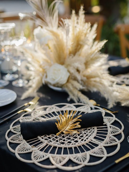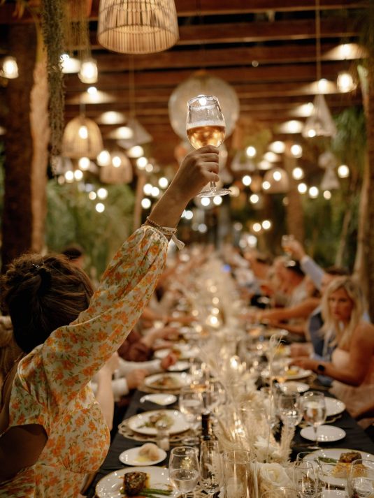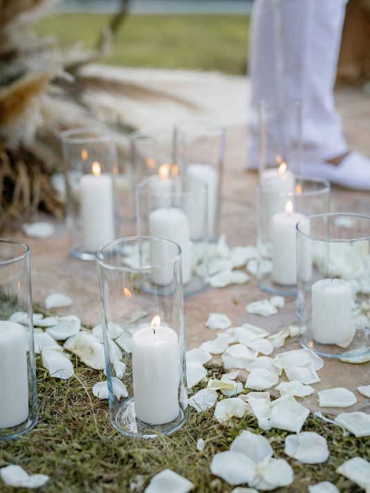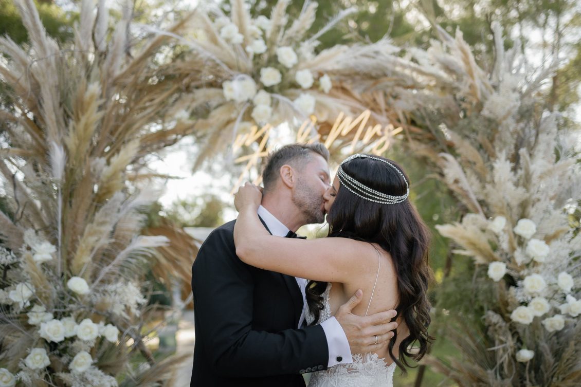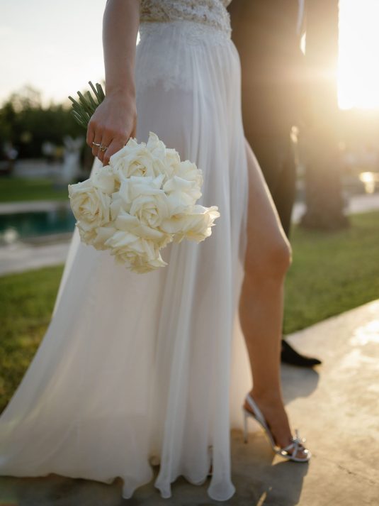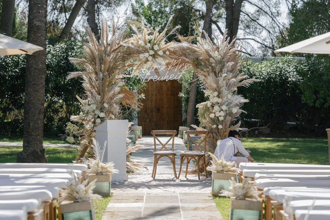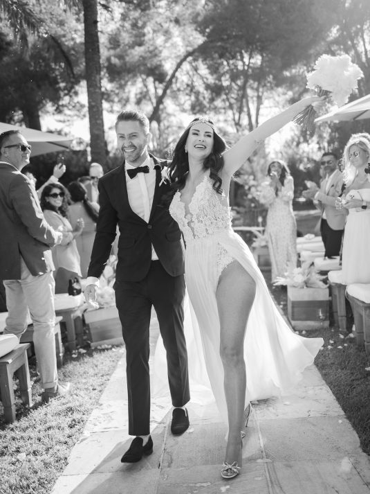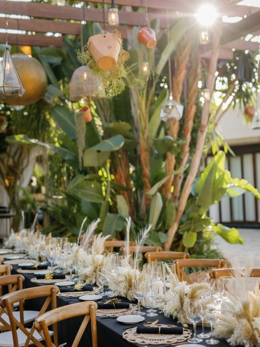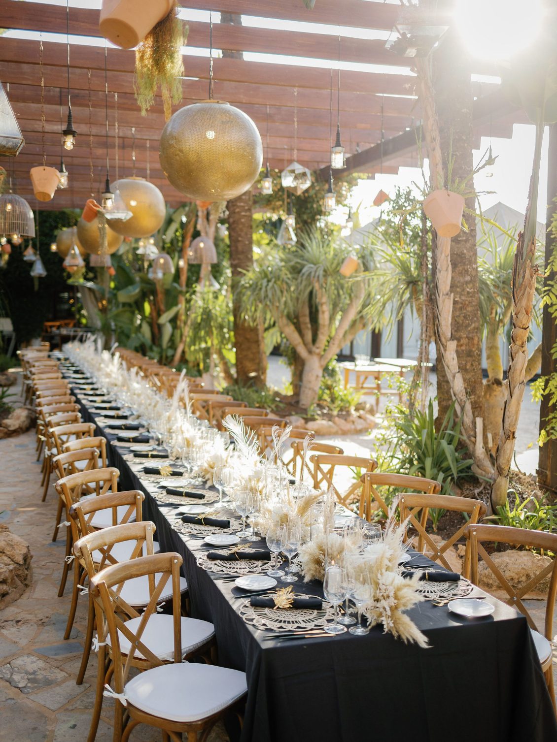 To set the tone for their wedding, Silvia and Thomas chose the dreamy ATZARO AGROTURISMO, a luxury hotel on the island of Ibiza, Spain, as the venue (which also happens to be the home of eight peacocks — yes, pictured below!). The bride spent the morning-of lounging by the pool with her girls before getting ready and stepping into a bespoke wedding dress and a jeweled headpiece from Jennifer Behr. A dinner reception was held following the couple’s “I Dos” beneath a pampas grass floral arch, and instead of a wedding cake, guests toasted to love and life with a shot of tequila!
