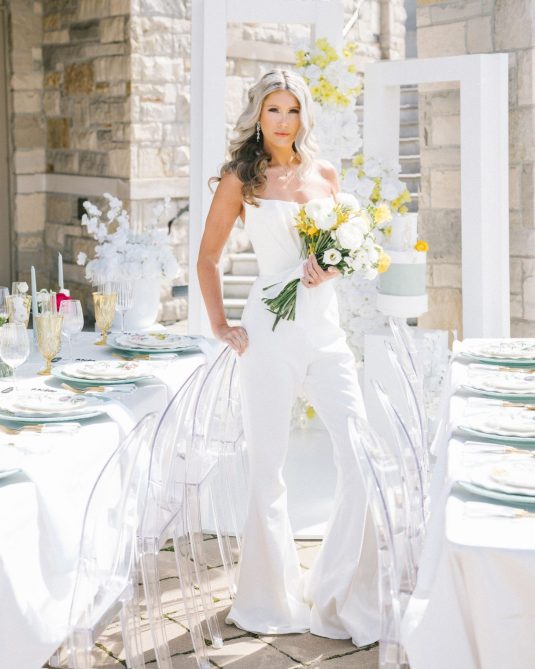 , one of Toronto, Canada’s best-known custom gown ateliers. How fun is that custom bridal pantsuit? LOVE!