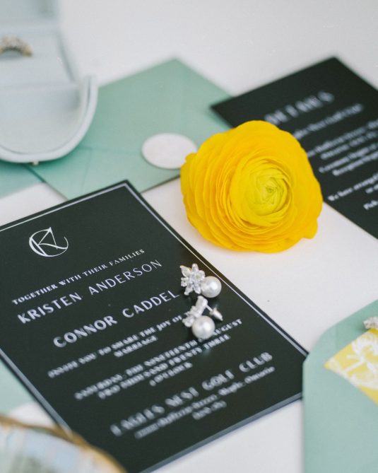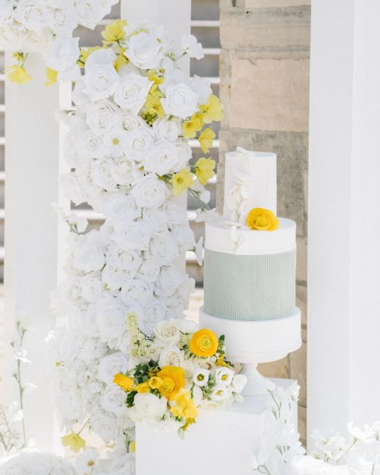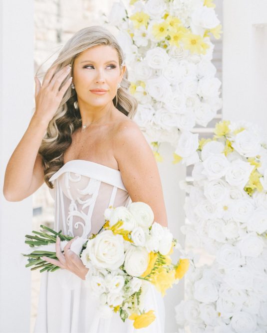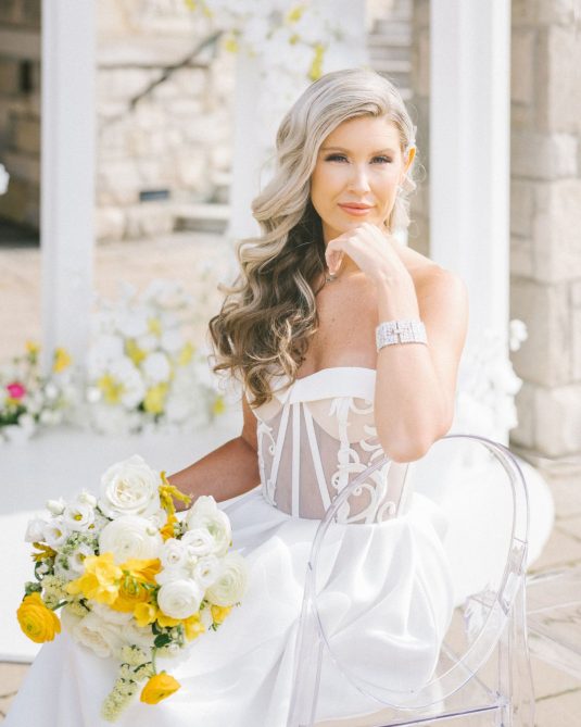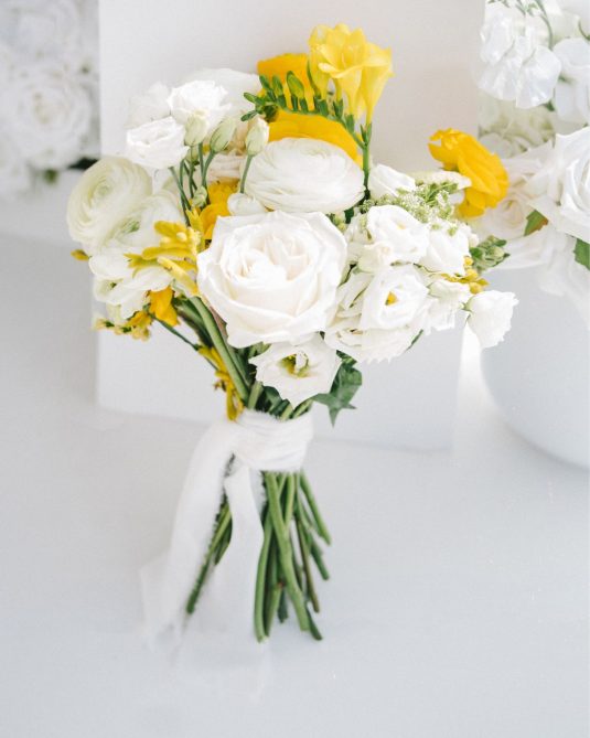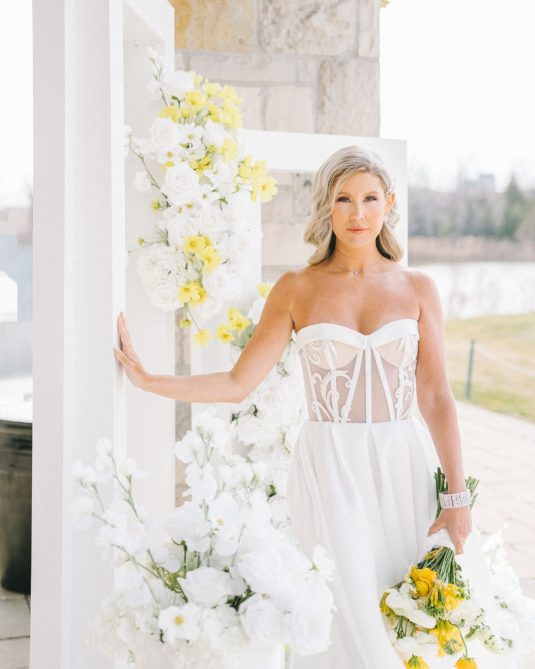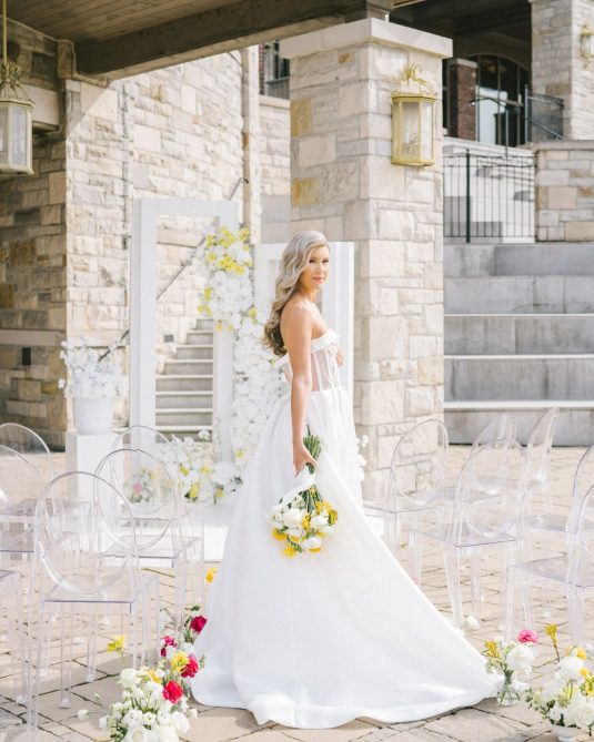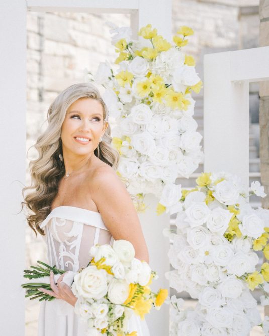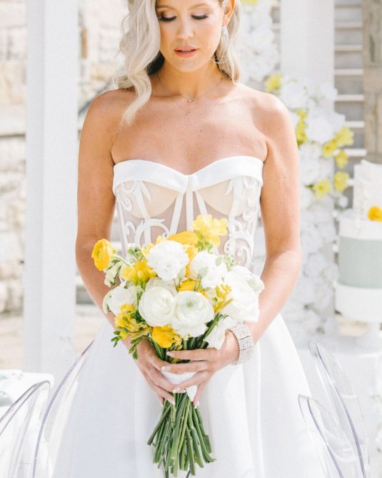 introduces a pop of yellow, a fun complement to the custom bridal fashion designs created by