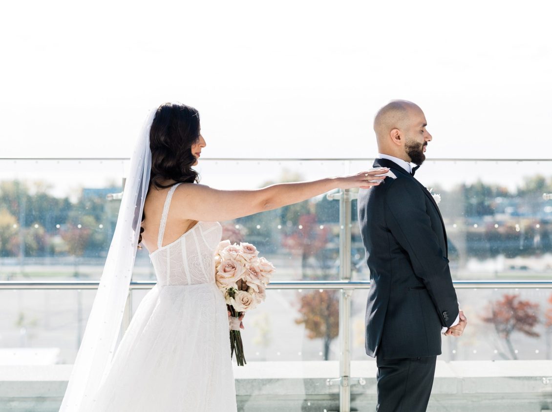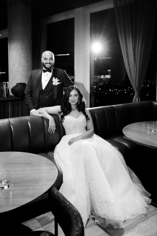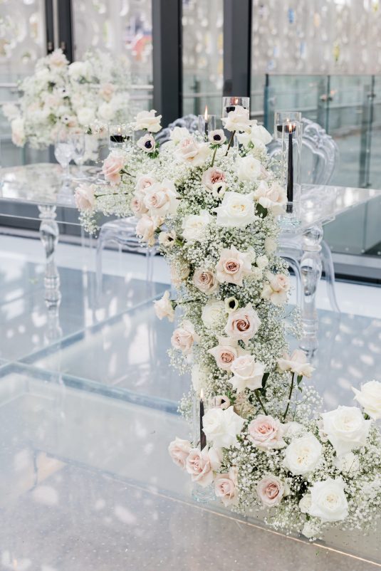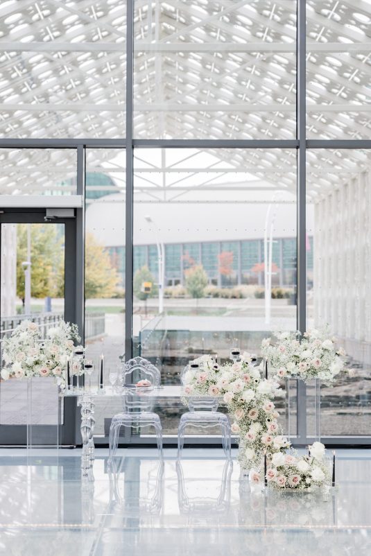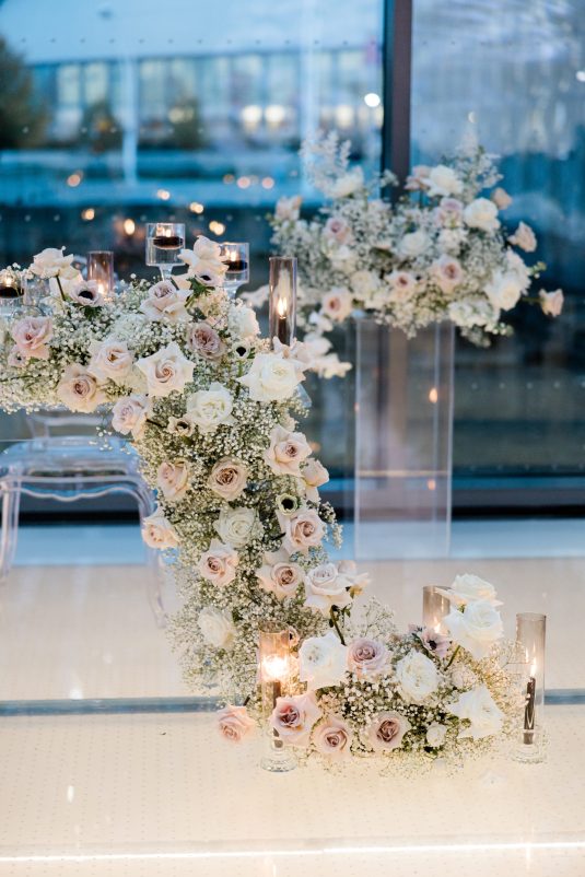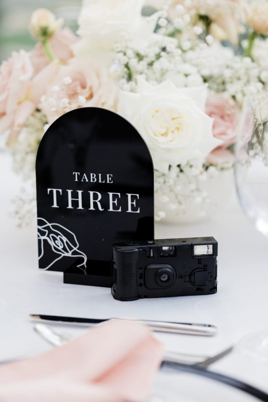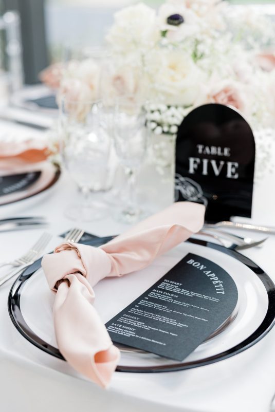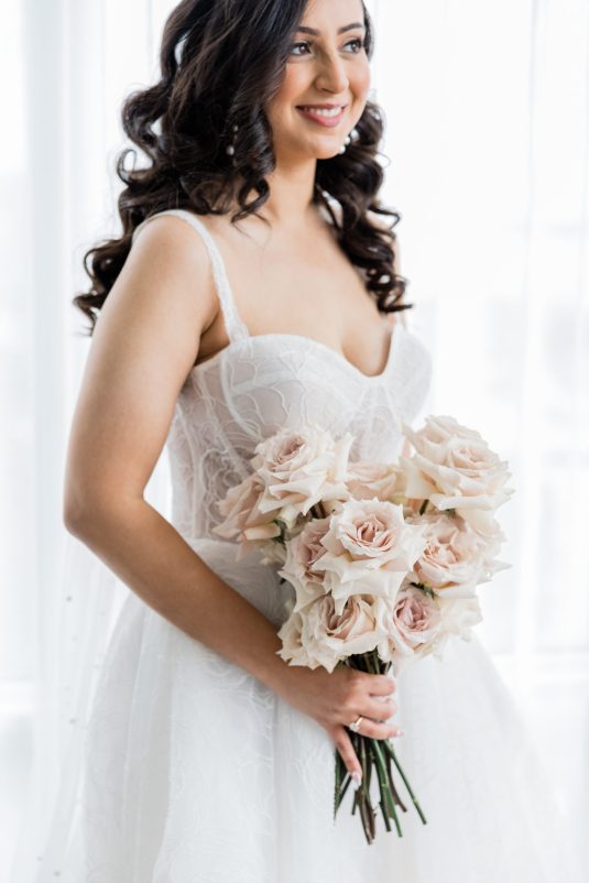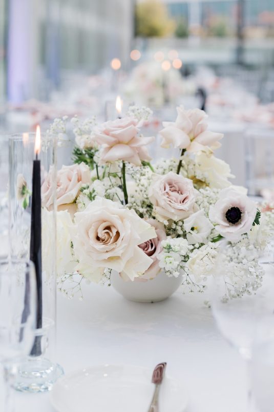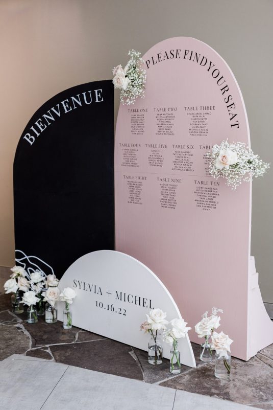 Bride Sylvia, owner and lead planner of Le Petit House , planned her own wedding in Toronto, Canada. Following a beautiful and meaningful ceremony, the wedding moved to Hotel X Toronto for a stunning, intimate reception decorated with delicate quicksand roses and black accents. Each table setting was set with a “Hello” place card, and the stationery featured a floral motif to match the Bride’s wedding dress. The reception also had an audio guest book, and a late-night shawarma station to celebrate the couple’s cultural heritage.