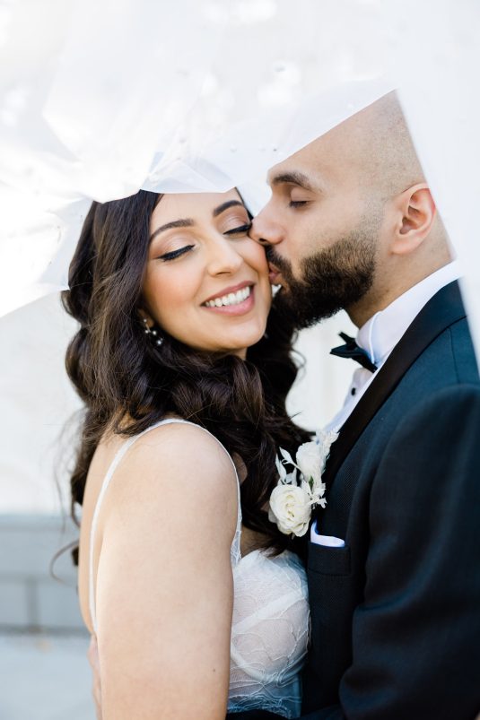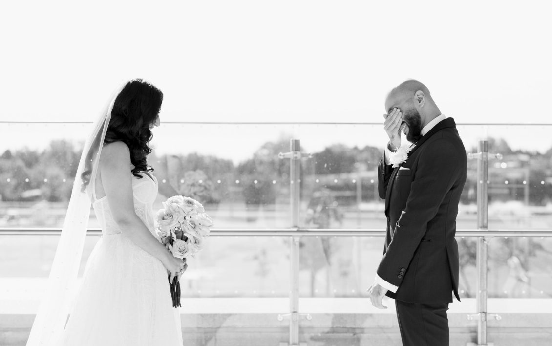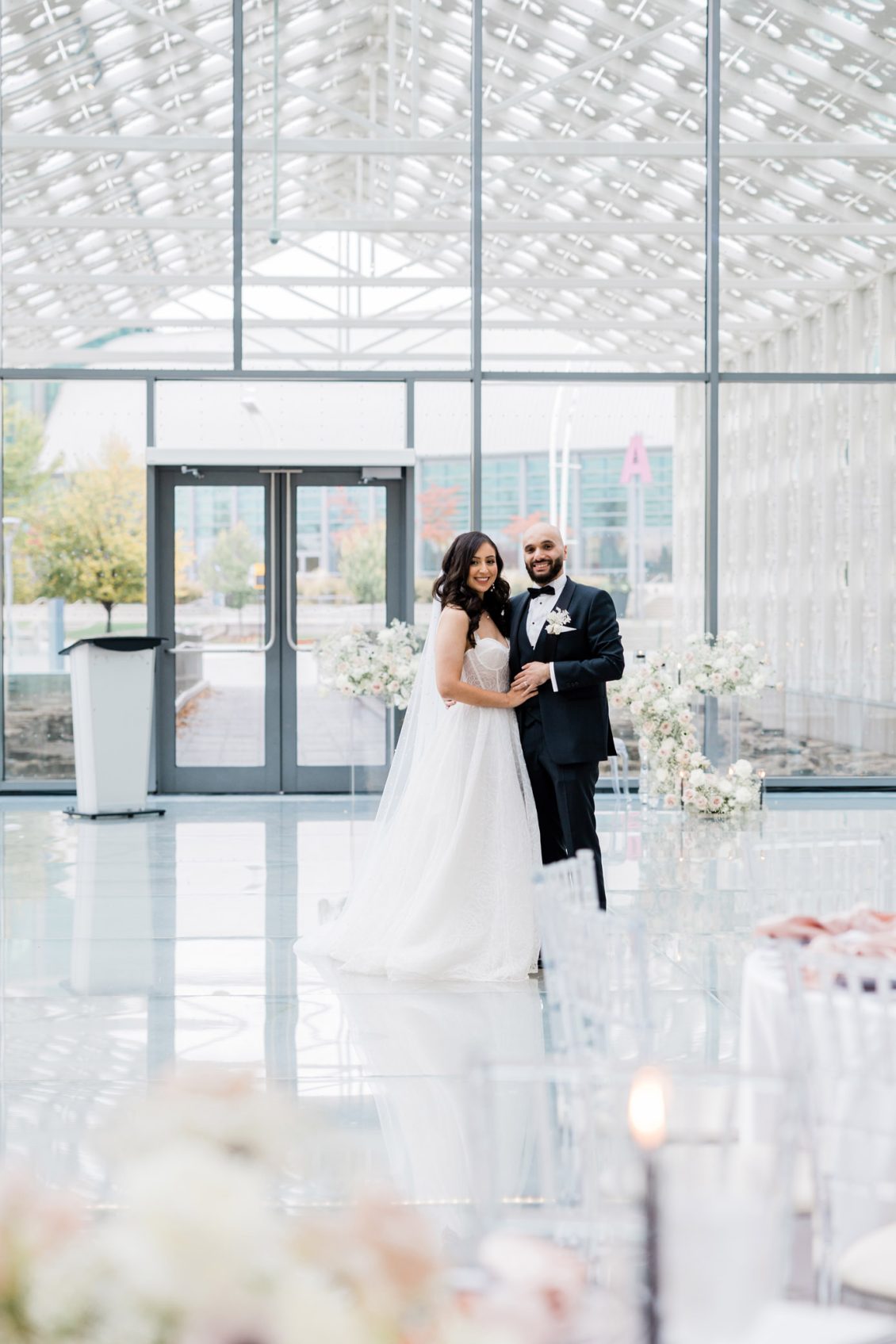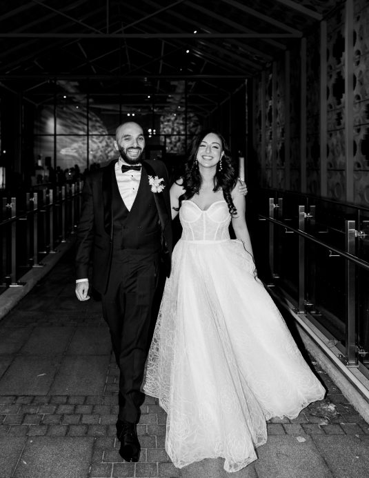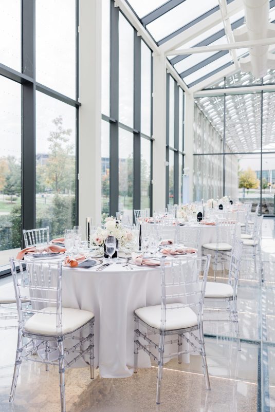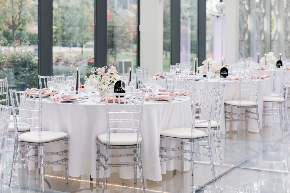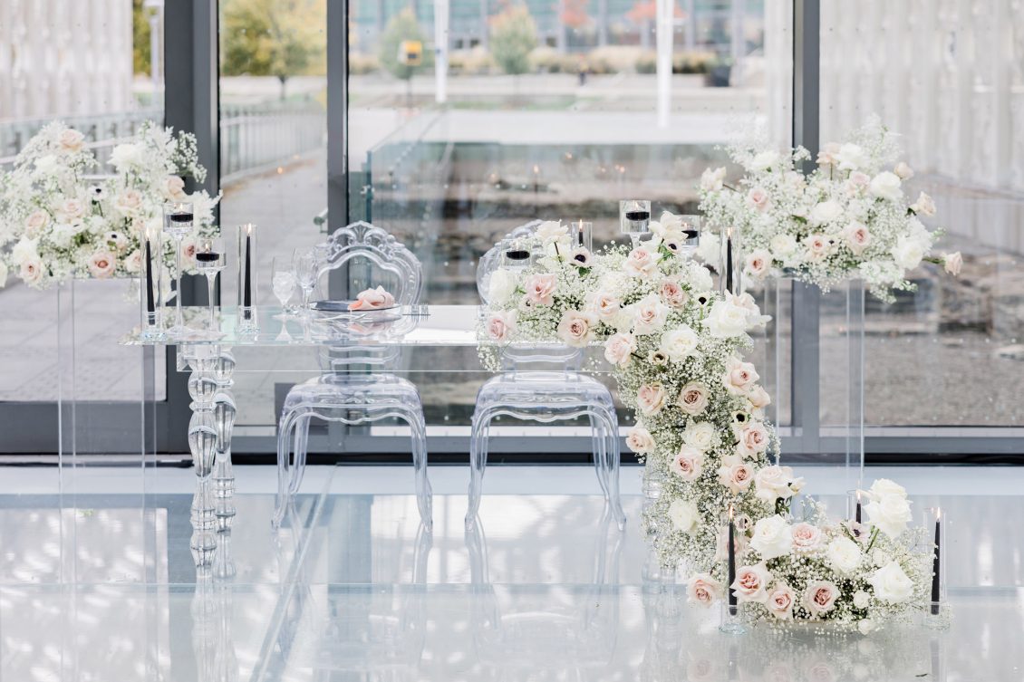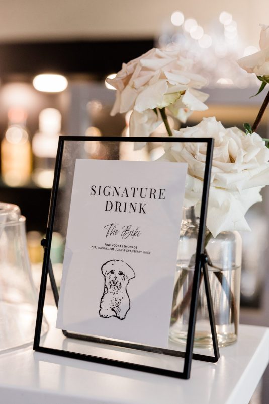 Bride Sylvia, owner and lead planner of Le Petit House , planned her own wedding in Toronto, Canada. Following a beautiful and meaningful ceremony, the wedding moved to Hotel X Toronto for a stunning, intimate reception decorated with delicate quicksand roses and black accents. Each table setting was set with a “Hello” place card, and the stationery featured a floral motif to match the Bride’s wedding dress. The reception also had an audio guest book, and a late-night shawarma station to celebrate the couple’s cultural heritage.