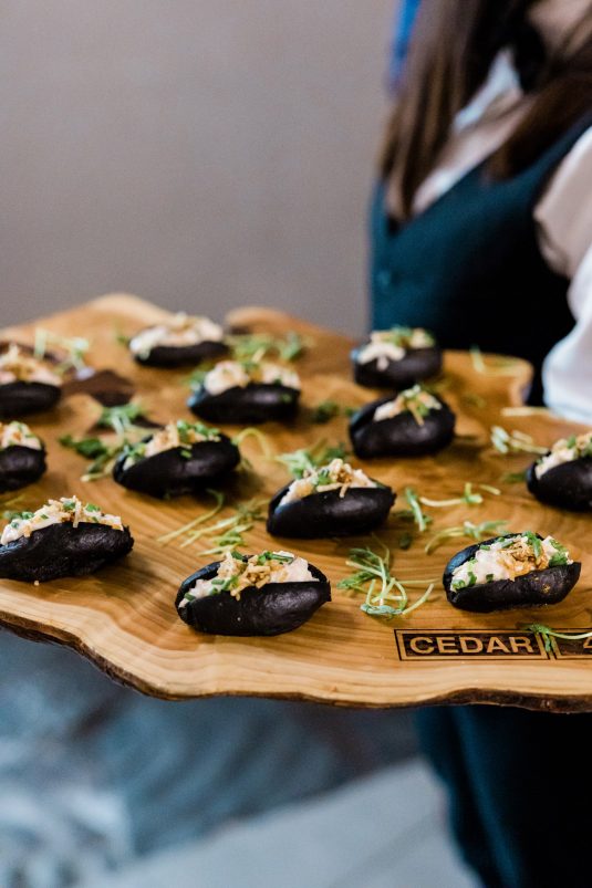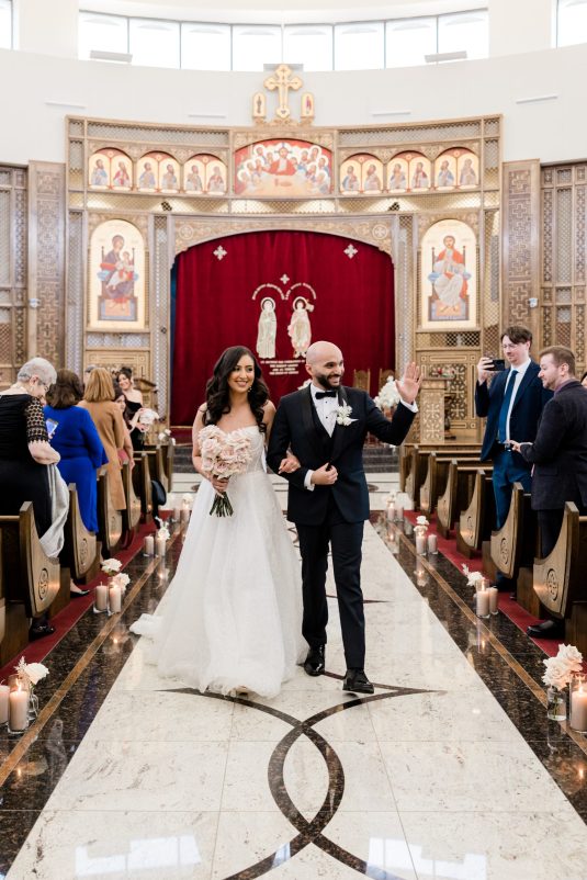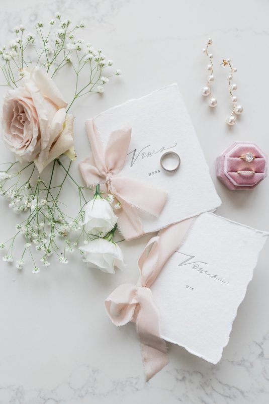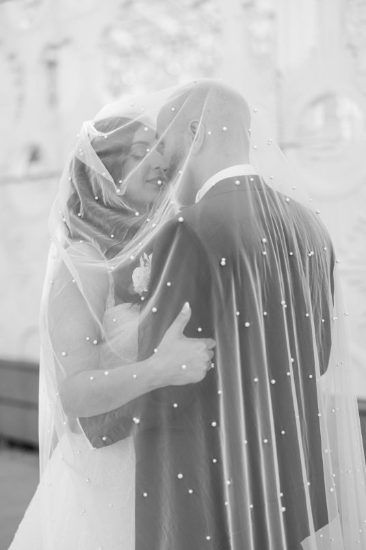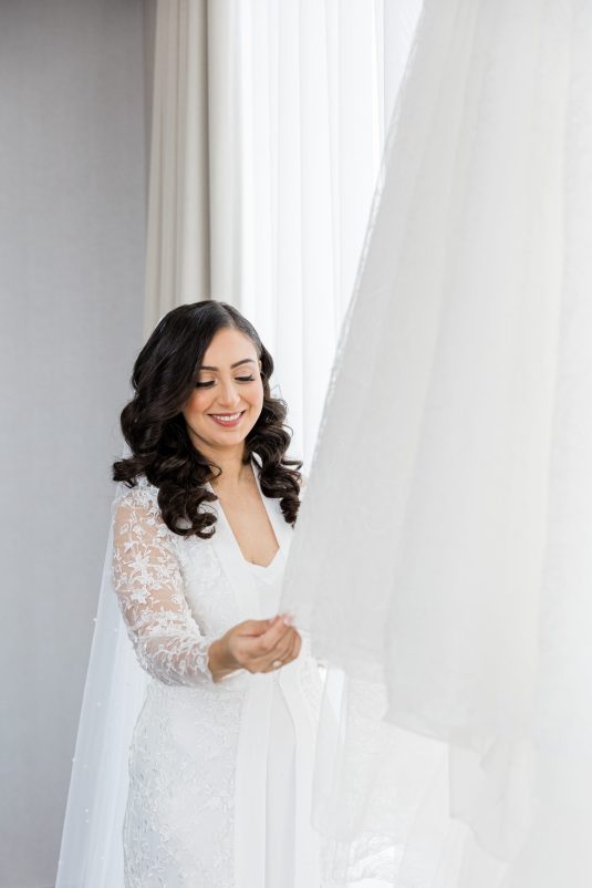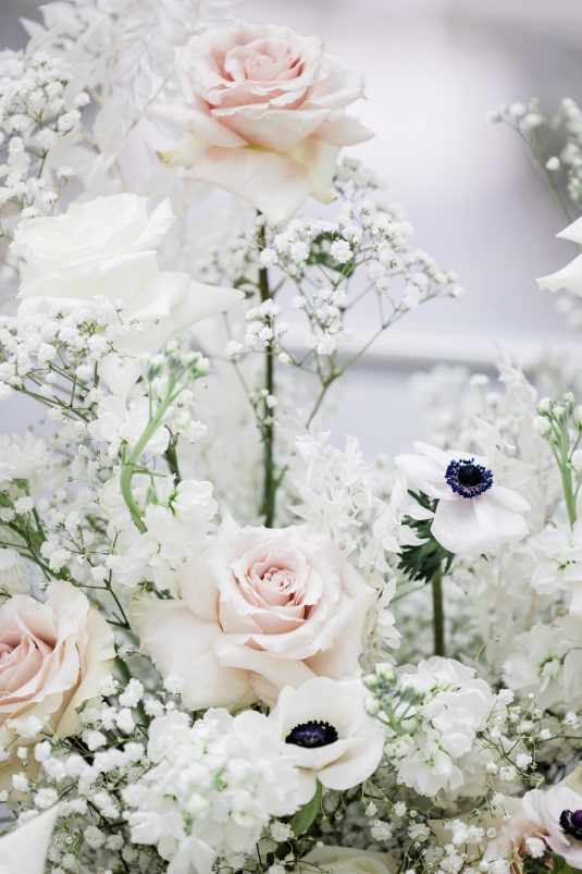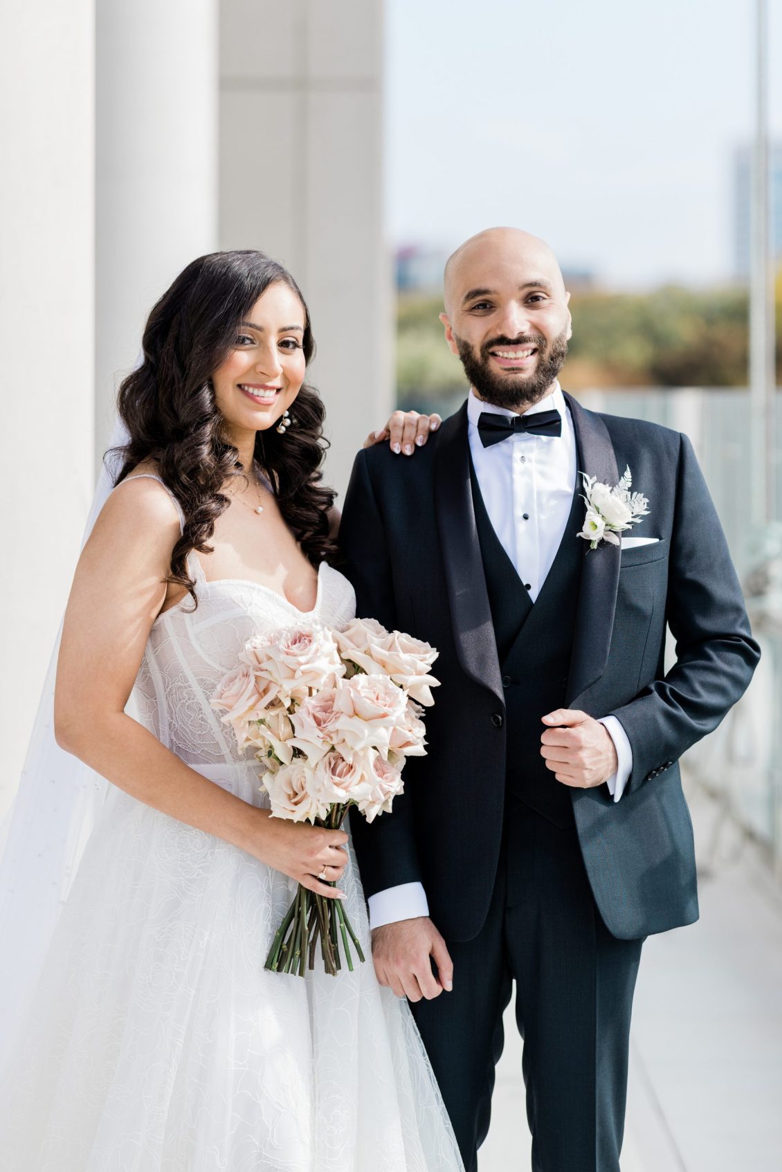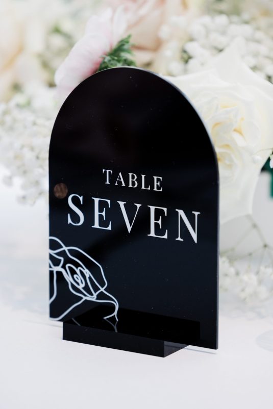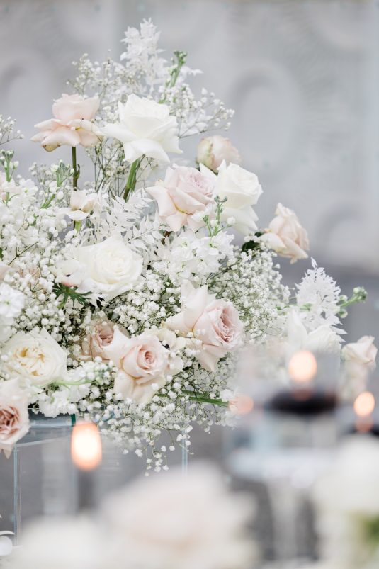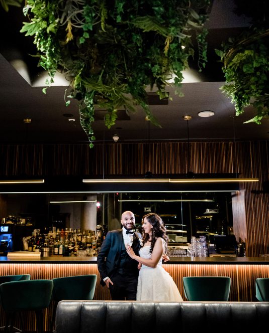 Bride Sylvia, owner and lead planner of Le Petit House , planned her own wedding in Toronto, Canada. Following a beautiful and meaningful ceremony, the wedding moved to Hotel X Toronto for a stunning, intimate reception decorated with delicate quicksand roses and black accents. Each table setting was set with a “Hello” place card, and the stationery featured a floral motif to match the Bride’s wedding dress. The reception also had an audio guest book, and a late-night shawarma station to celebrate the couple’s cultural heritage.