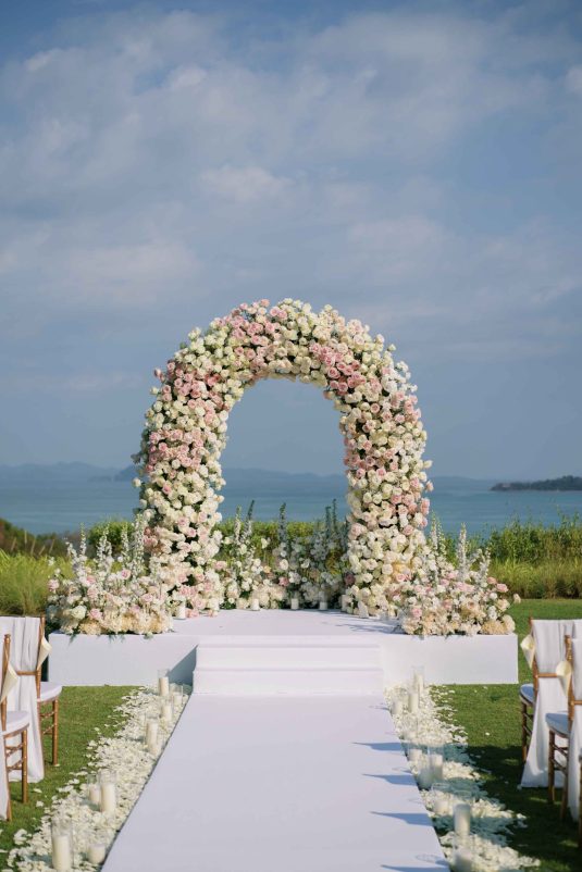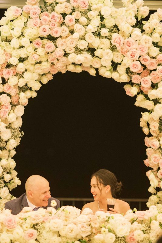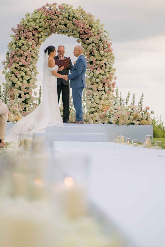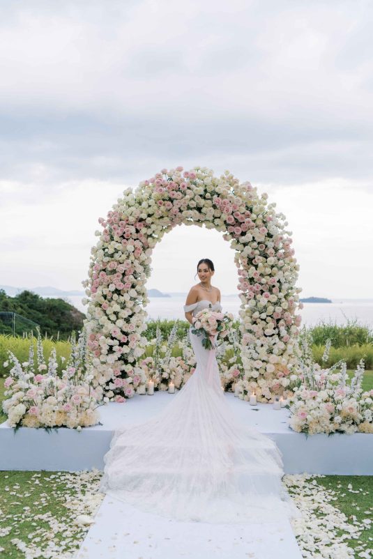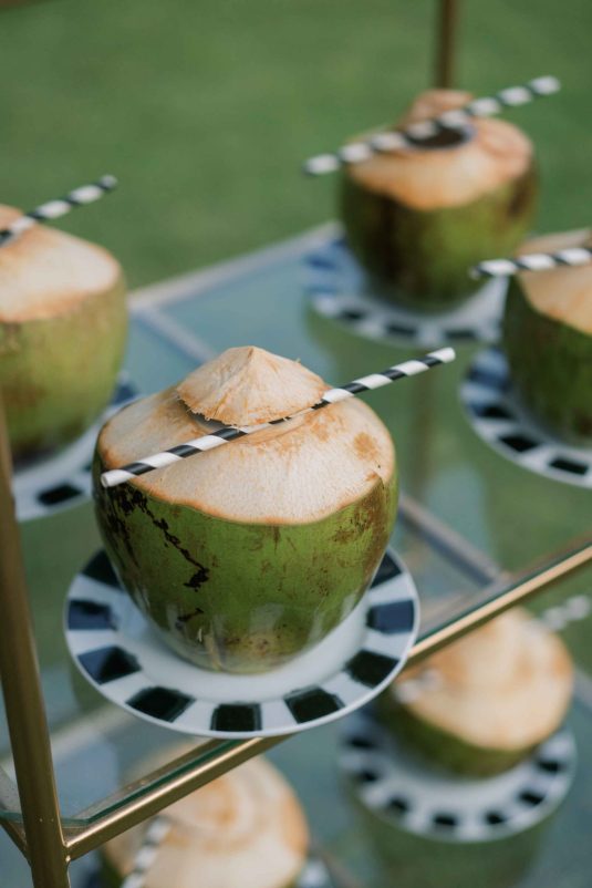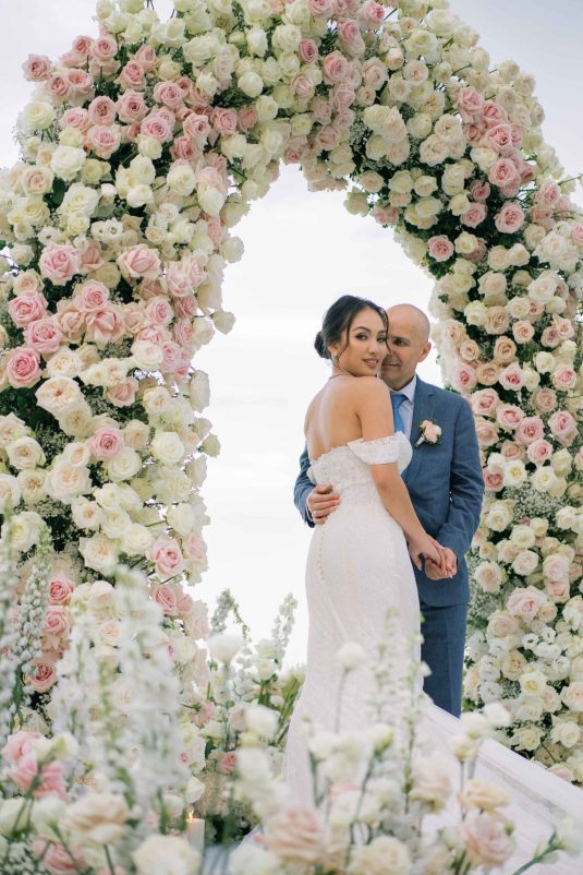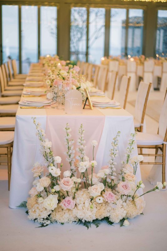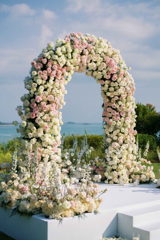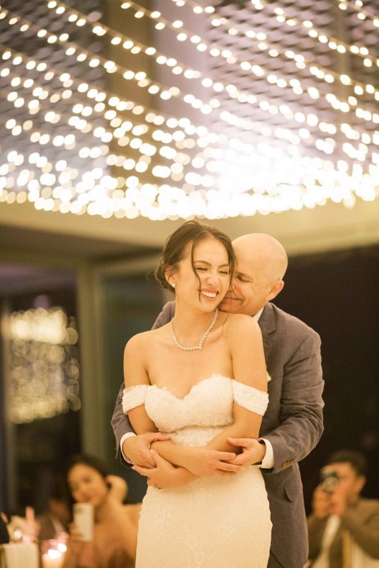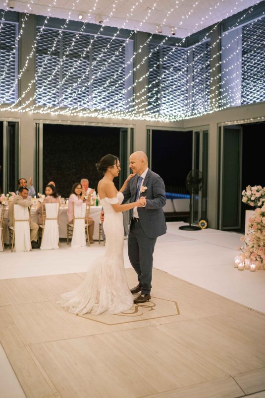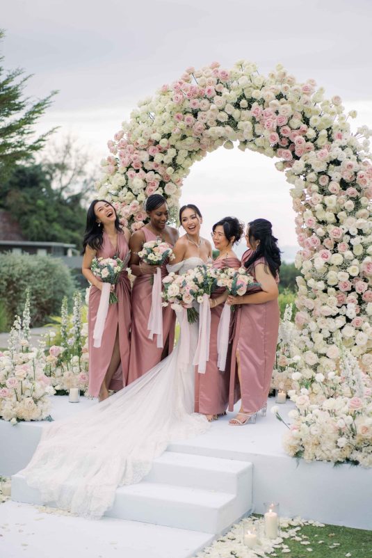 Bring on the romance! Pammy and Steven’s scenic cliffside wedding ceremony featured an oversized floral arch full of pastel pink and white roses, complimented by the bridesmaids’ blush-hued gowns. As an added touch, coconut drinks were offered as refreshments. The romance continued with the indoor reception, which was illuminated by a canopy of fairy lights resembling the twinkling of stars in a clear night’s sky.