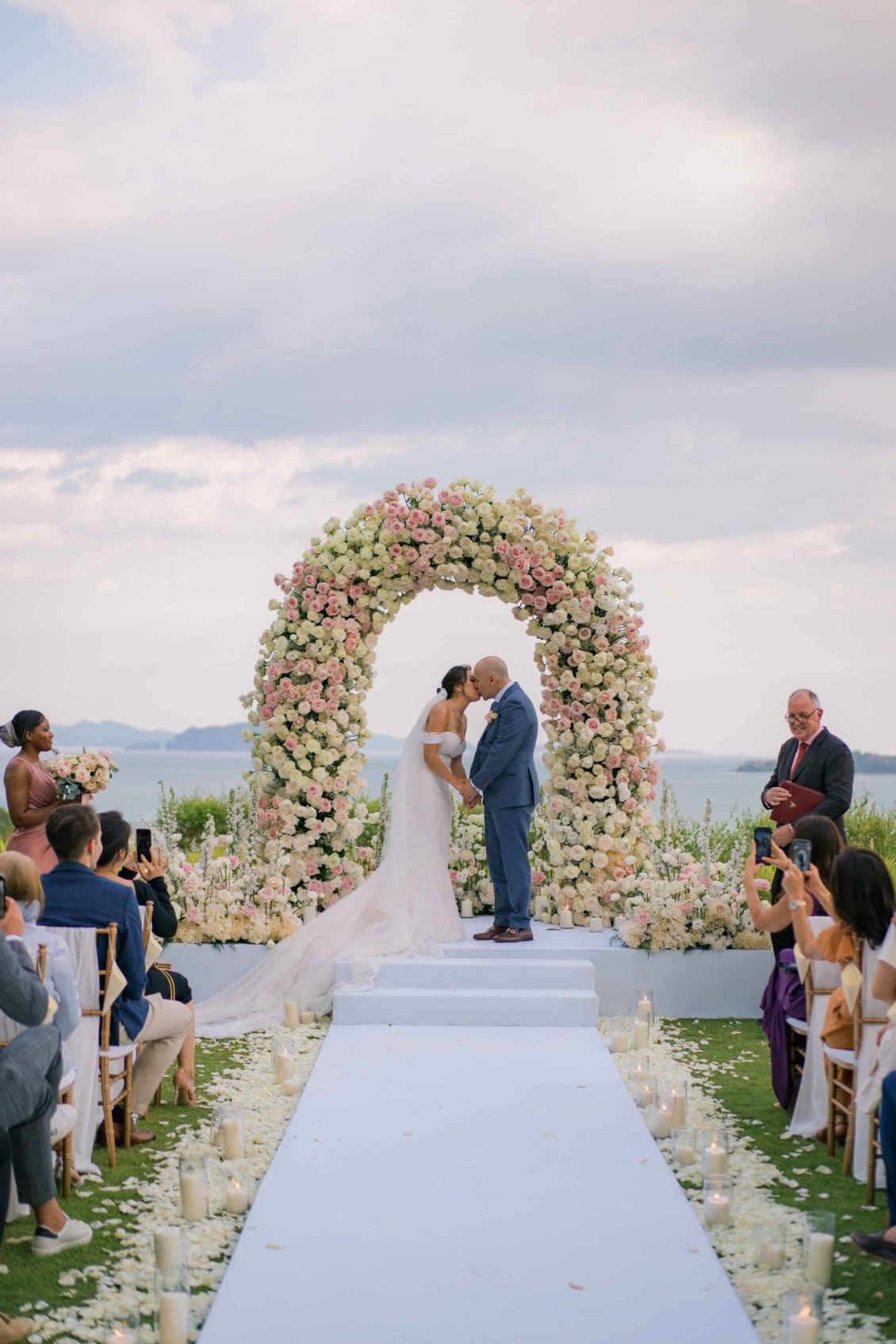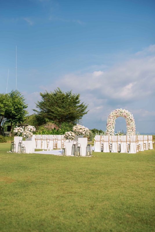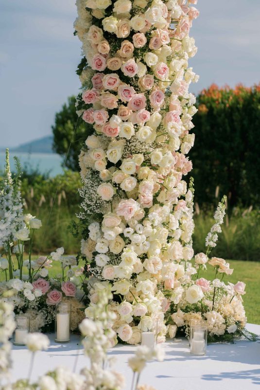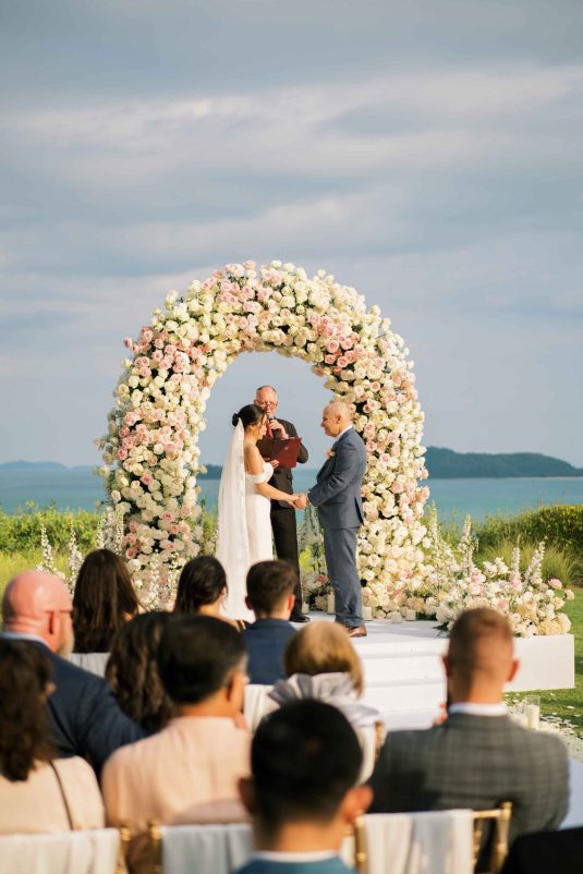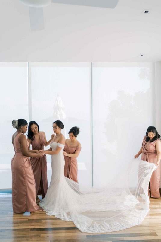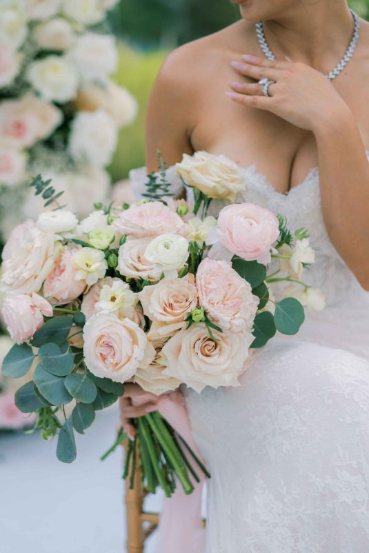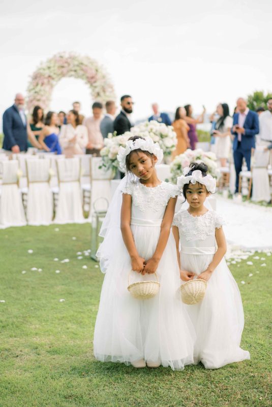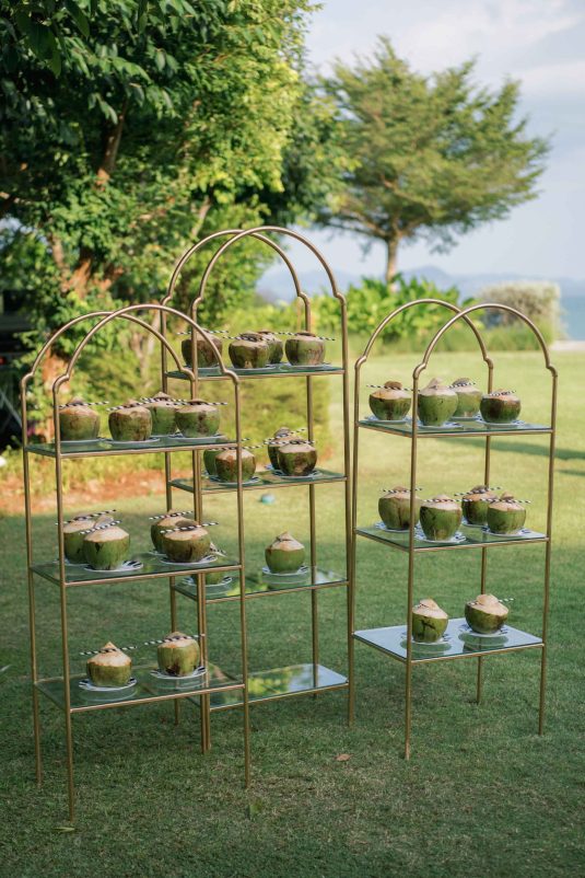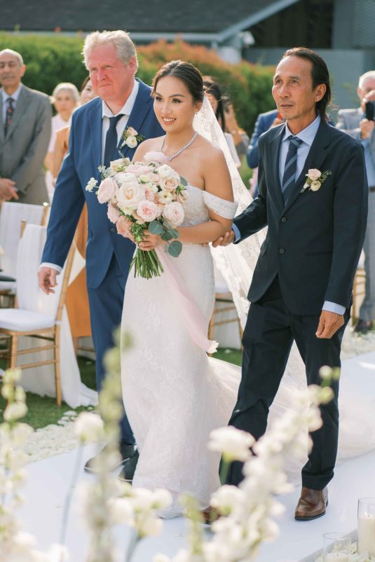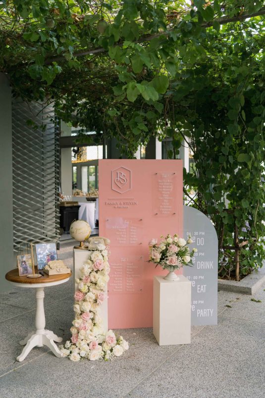 Bring on the romance! Pammy and Steven’s scenic cliffside wedding ceremony featured an oversized floral arch full of pastel pink and white roses, complimented by the bridesmaids’ blush-hued gowns. As an added touch, coconut drinks were offered as refreshments. The romance continued with the indoor reception, which was illuminated by a canopy of fairy lights resembling the twinkling of stars in a clear night’s sky.