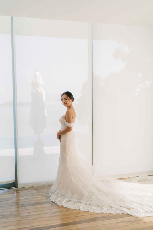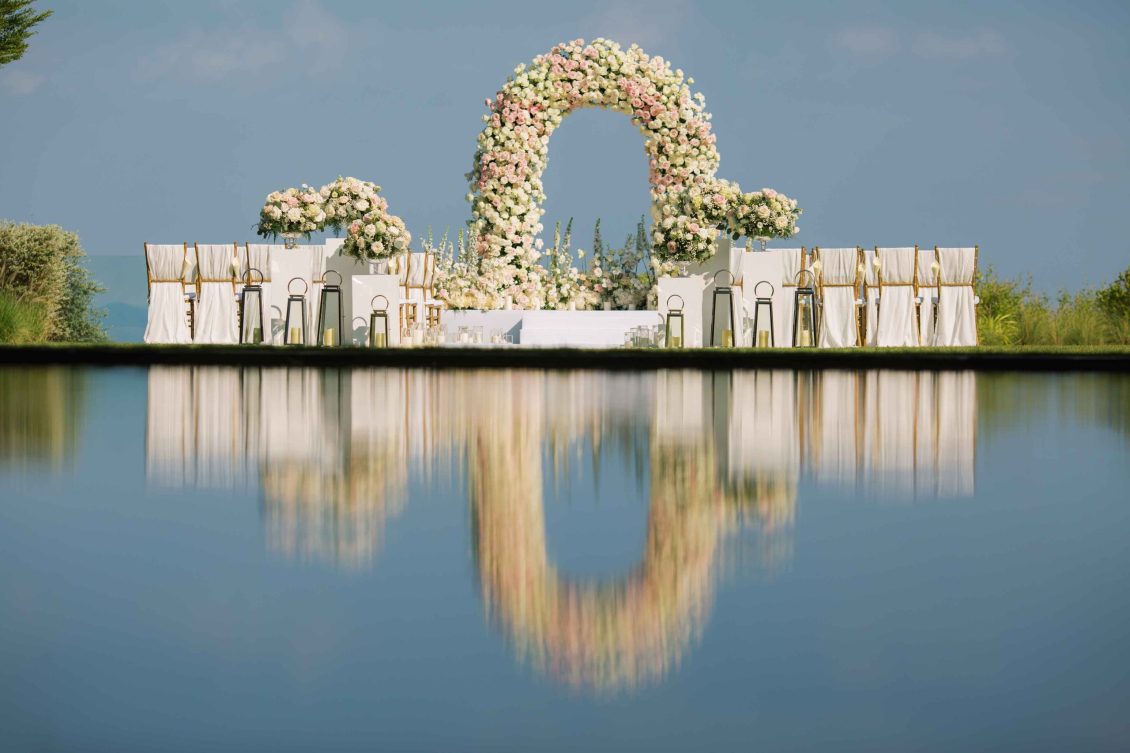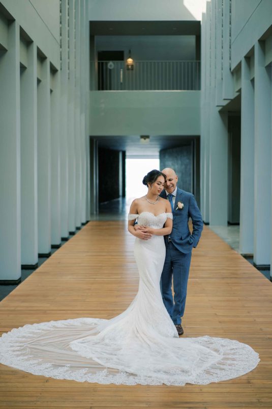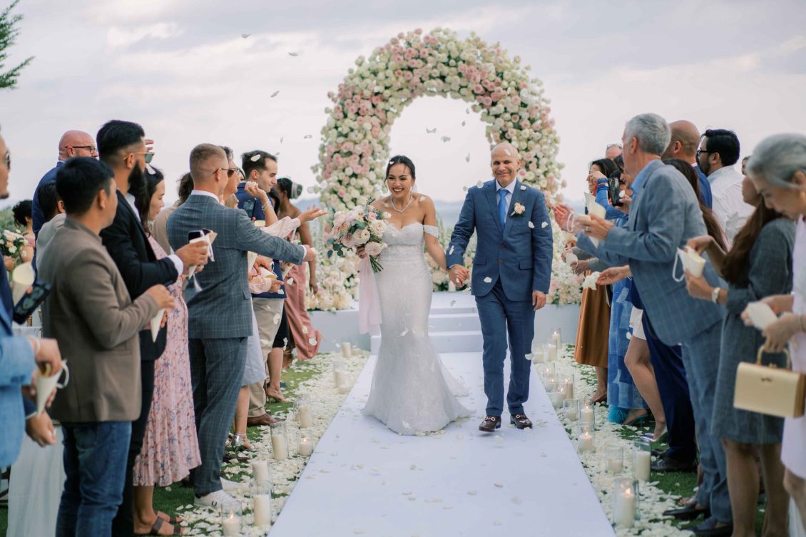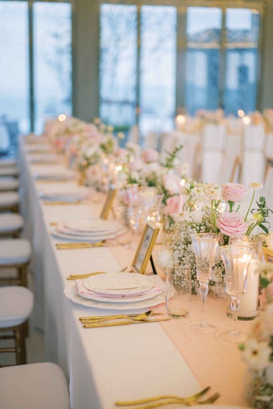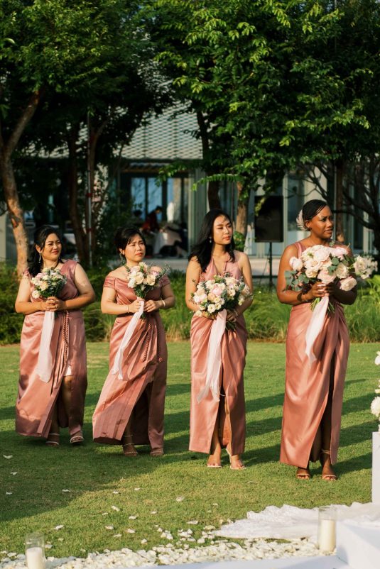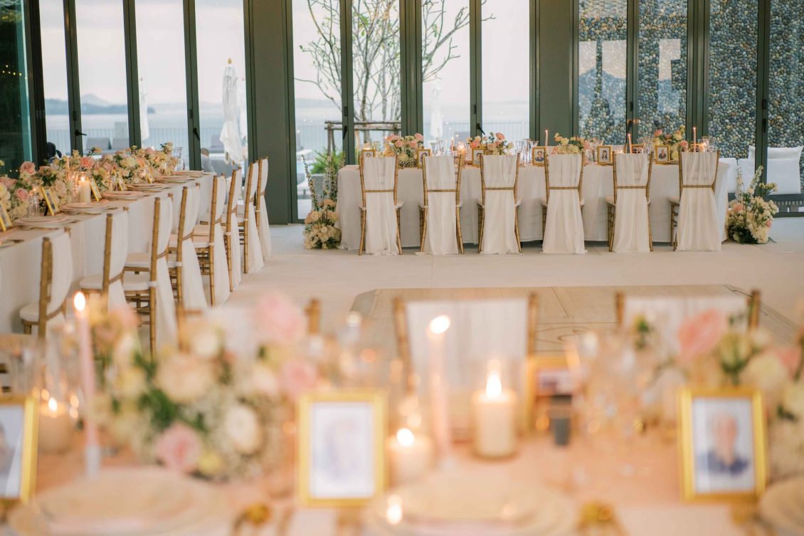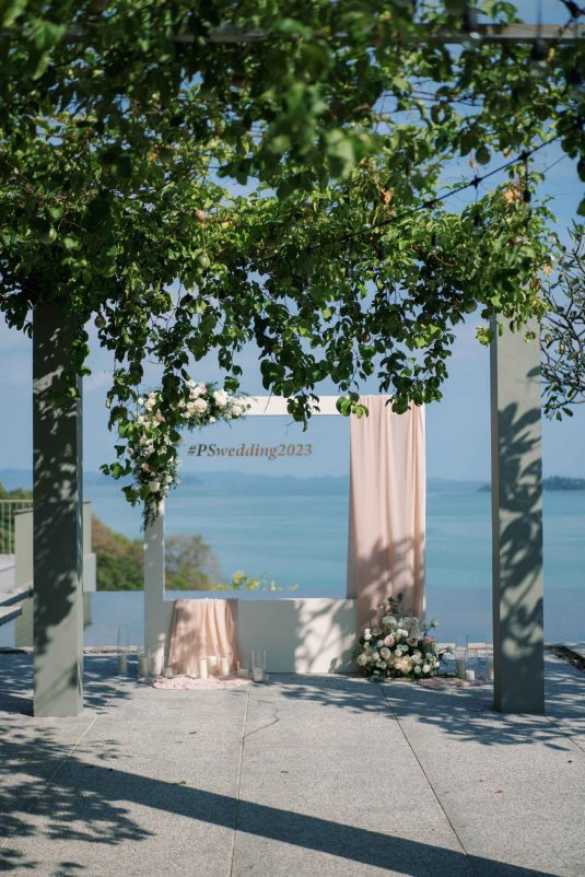 Bring on the romance! Pammy and Steven’s scenic cliffside wedding ceremony featured an oversized floral arch full of pastel pink and white roses, complimented by the bridesmaids’ blush-hued gowns. As an added touch, coconut drinks were offered as refreshments. The romance continued with the indoor reception, which was illuminated by a canopy of fairy lights resembling the twinkling of stars in a clear night’s sky.