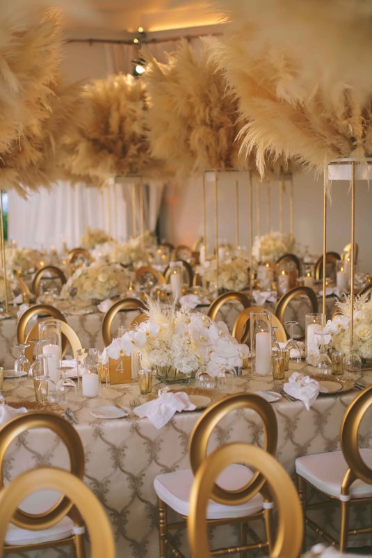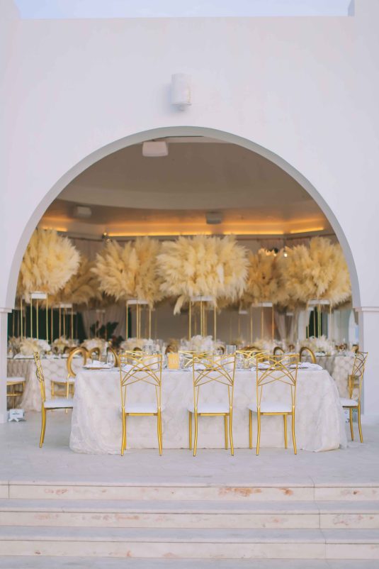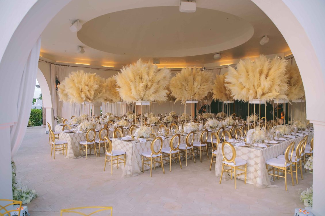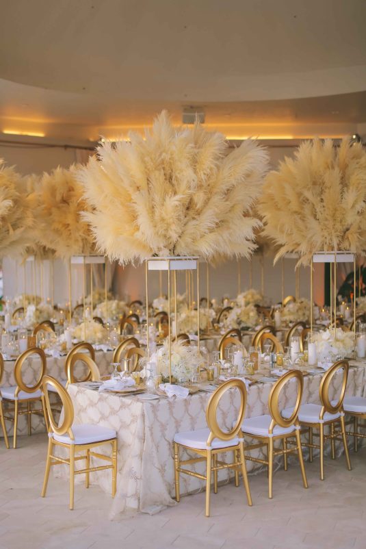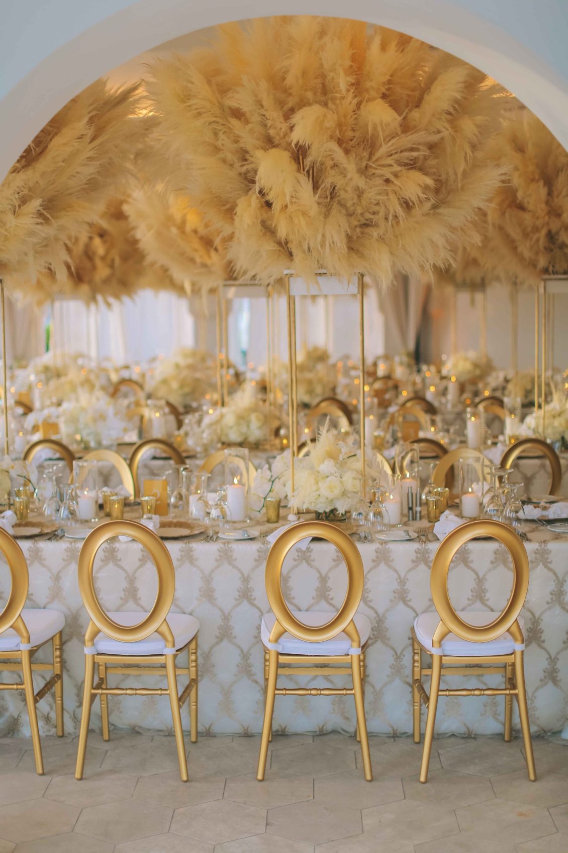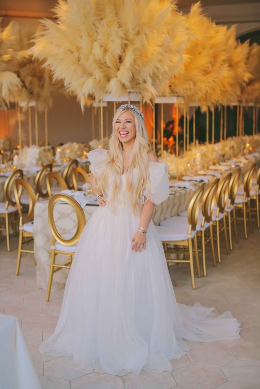 Bride Tegan Kline, named Forbes’ 30 Under 30 – Finance, 2022, wore a Danielle Frankel wedding dress to marry her sweetheart on the beach at Cap Juluca, A Belmond Hotel in Anguilla — part of a four-day wedding weekend! The ceremony was decorated with an acrylic floral arch and chairs for an unobstructed view of the waters, and the reception space was turned into a gold and pampas grass fantasy!