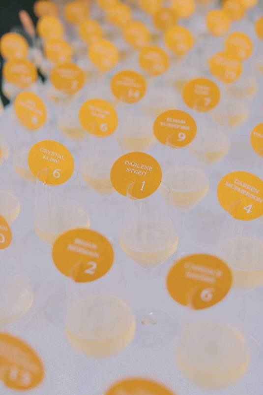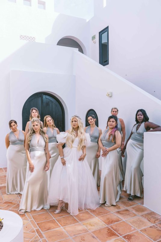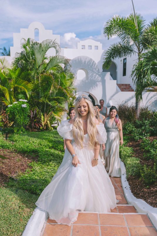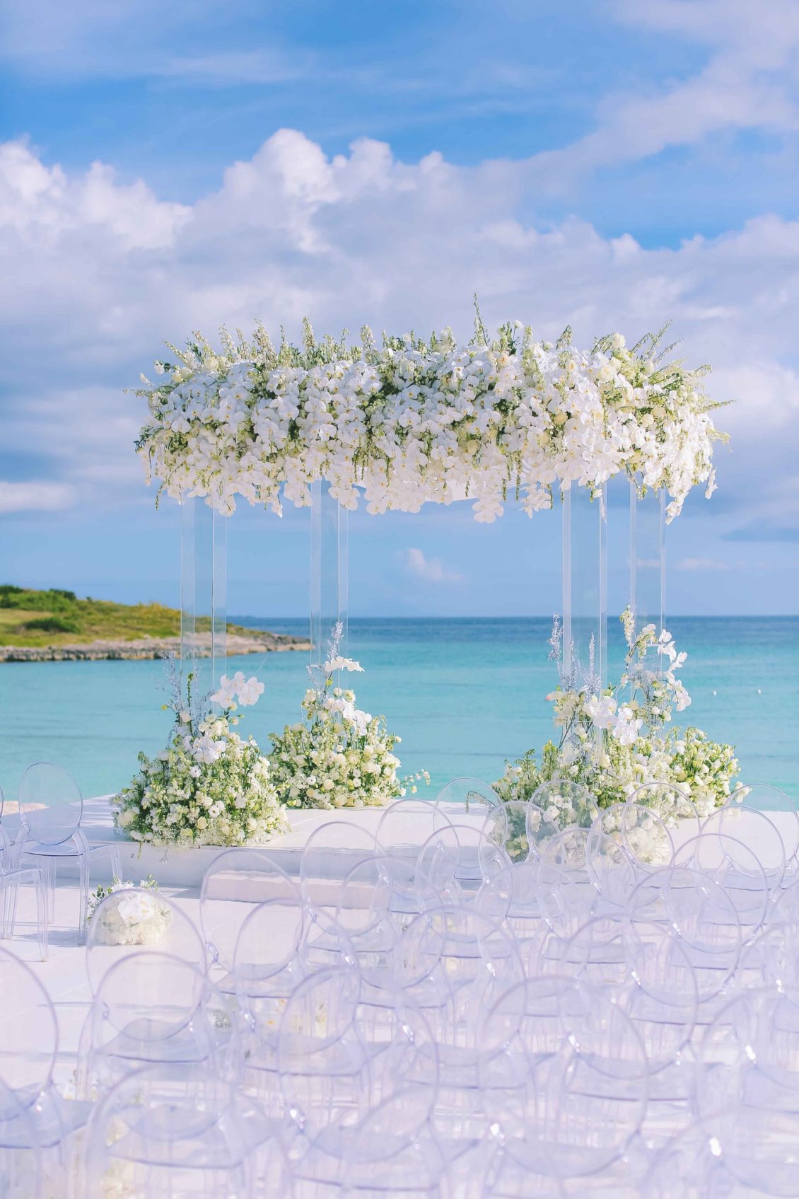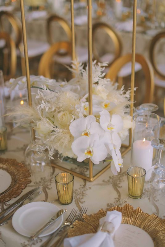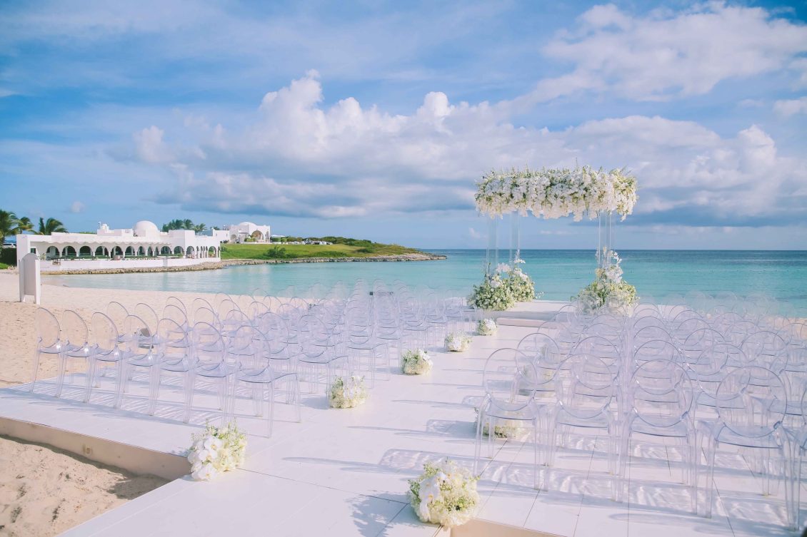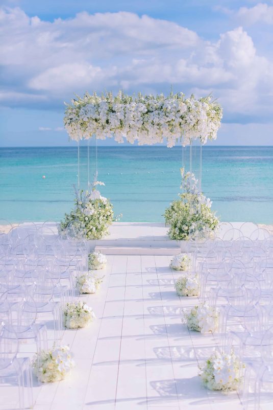 Bride Tegan Kline, named Forbes’ 30 Under 30 – Finance, 2022, wore a Danielle Frankel wedding dress to marry her sweetheart on the beach at Cap Juluca, A Belmond Hotel in Anguilla — part of a four-day wedding weekend! The ceremony was decorated with an acrylic floral arch and chairs for an unobstructed view of the waters, and the reception space was turned into a gold and pampas grass fantasy!