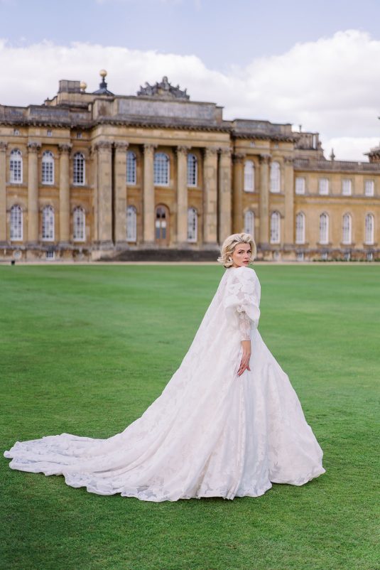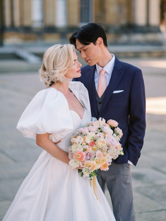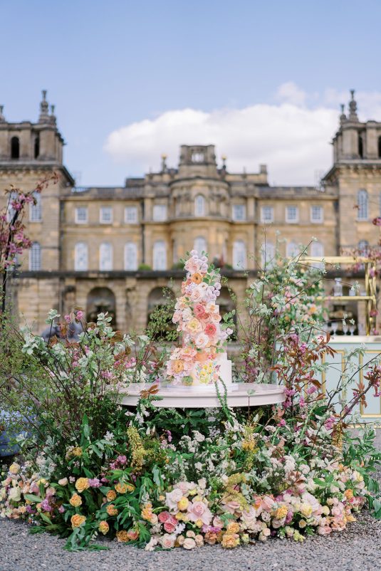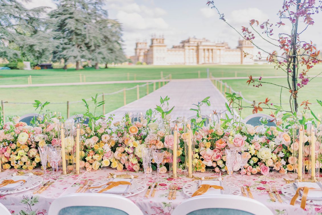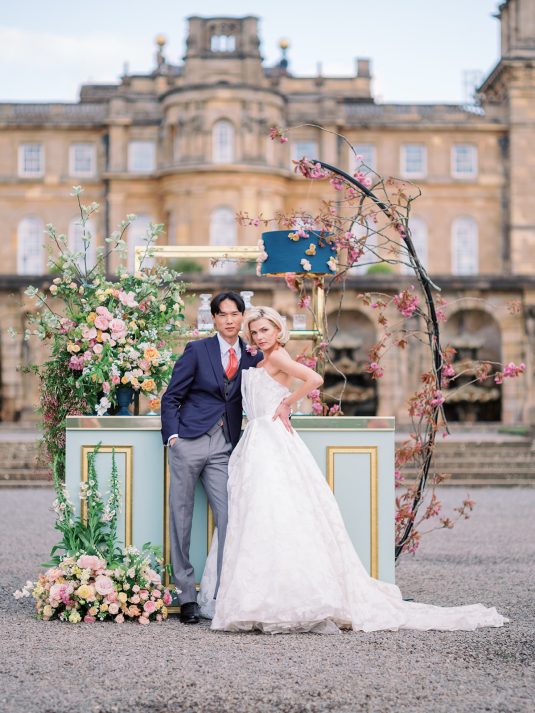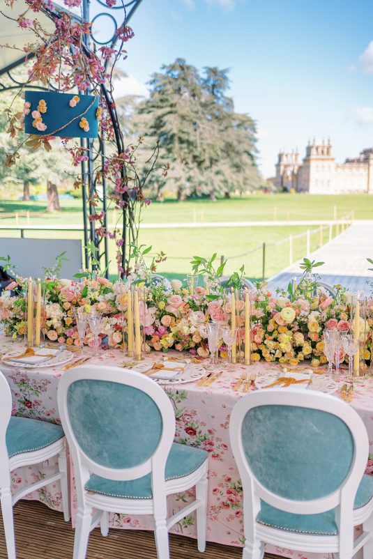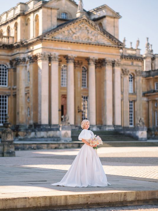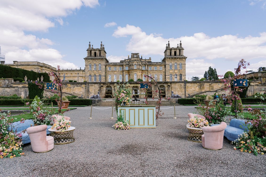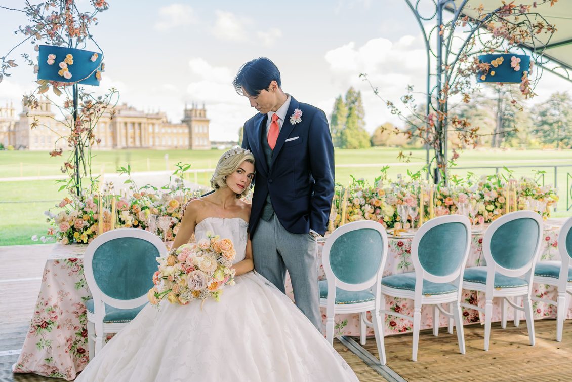 Inspired by the coronation of King Charles III, this styled shoot is nothing short of regal luxury infused with a breath of pastel modernity! Photographed at Blenheim Palace in Woodstock, England, you might recognize this monumental “country house” from Netflix’s binge-worthy Queen Charlotte: A Bridgerton Story! In addition to its current tv-fame, this palace has a notable history as it’s also the birthplace of Sir Winston Churchill. A masterpiece of English Baroque architecture built between 1705 and 1722, Blenheim Palace was designed by renowned architect Sir John Vanbrugh with its world-famous (and exquisite!) formal garden first designed by Capability Brown, one of the most prolific landscape designers of all time.