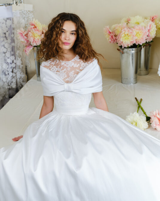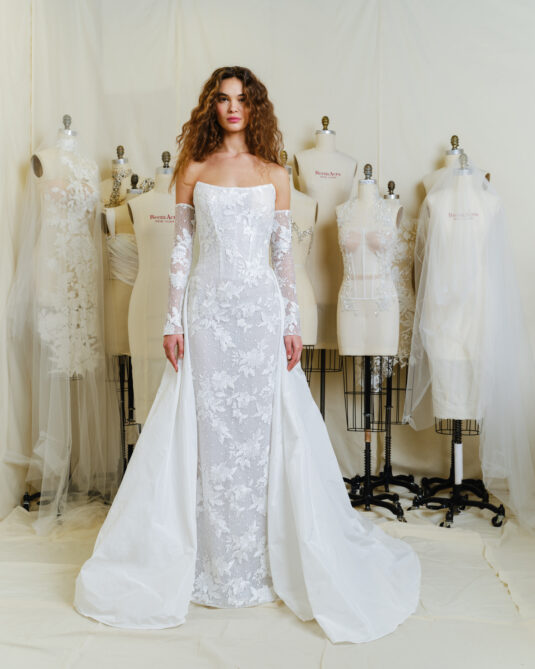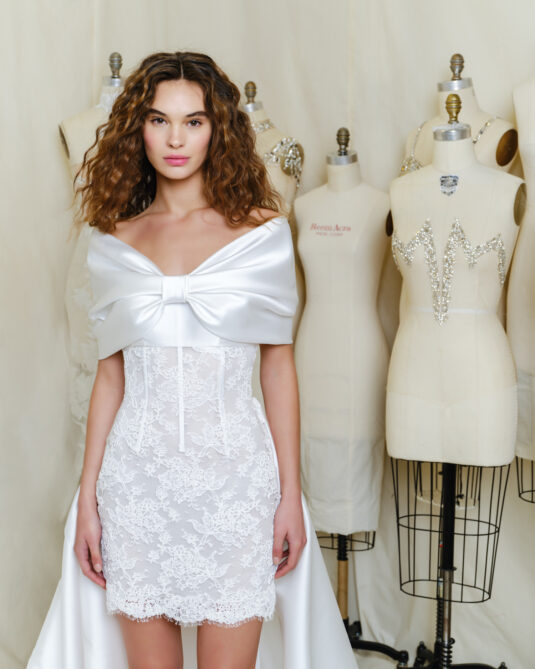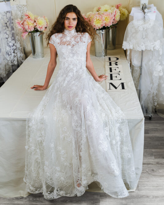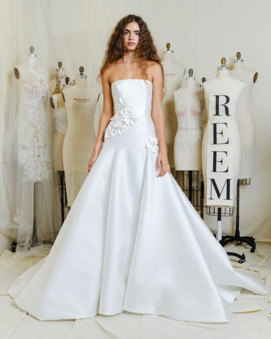 The Reem Acra Fall collection presents a diverse range of accessories, allowing the bride to honor her distinct fashion sense. Encompassed within the collection are elongated A-line profiles, ball gowns, short dresses, trains, jackets, removable hoodies, boleros, gloves, and belts, catering to every bridal desire. The 3D handcrafted flowers are reminiscent of those gracing the designer’s first bridal gown.