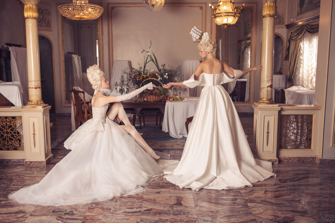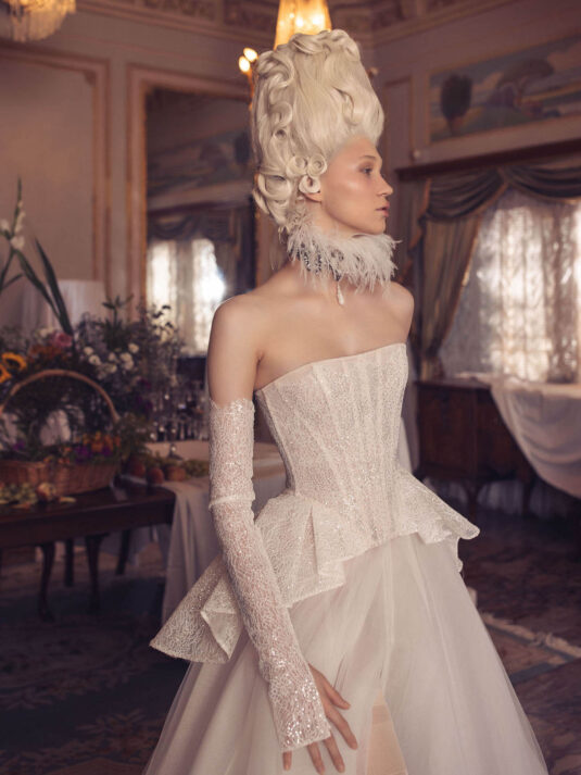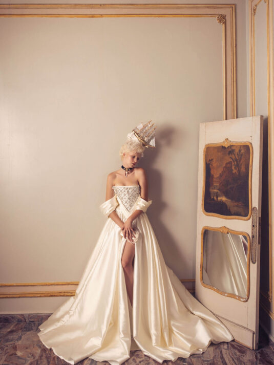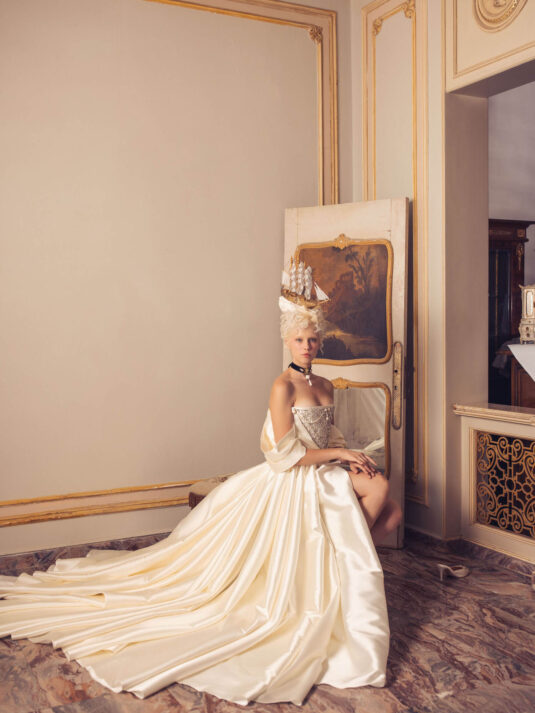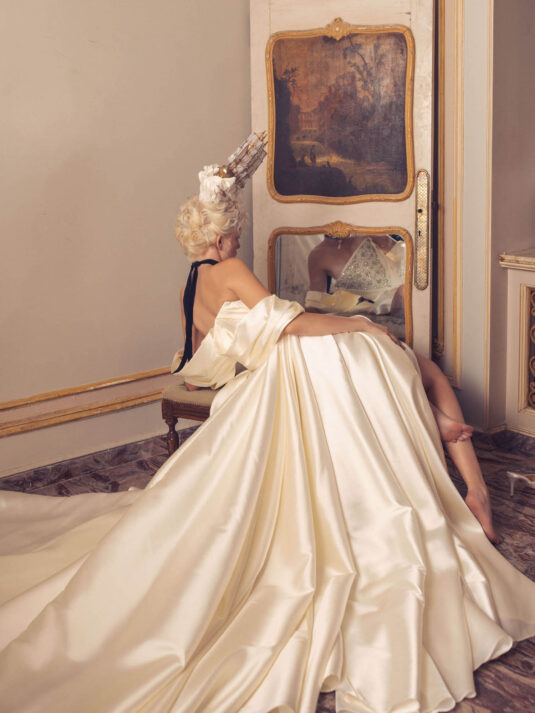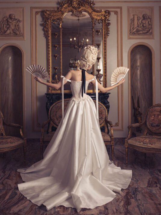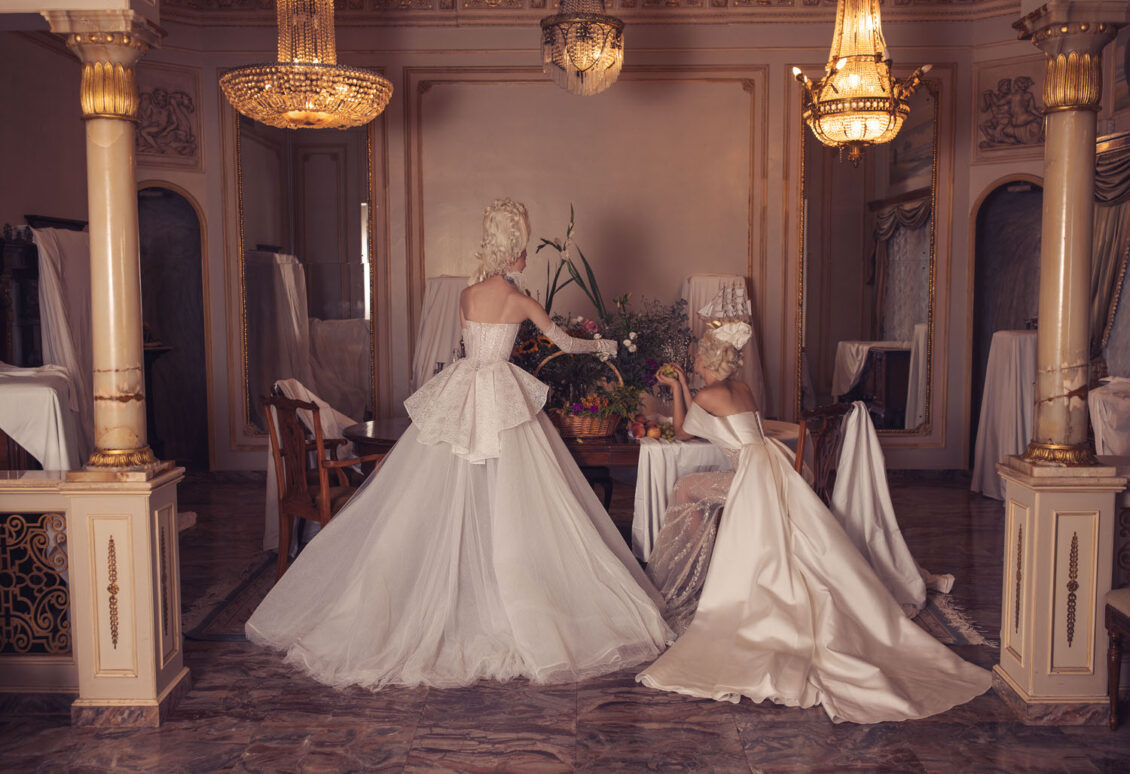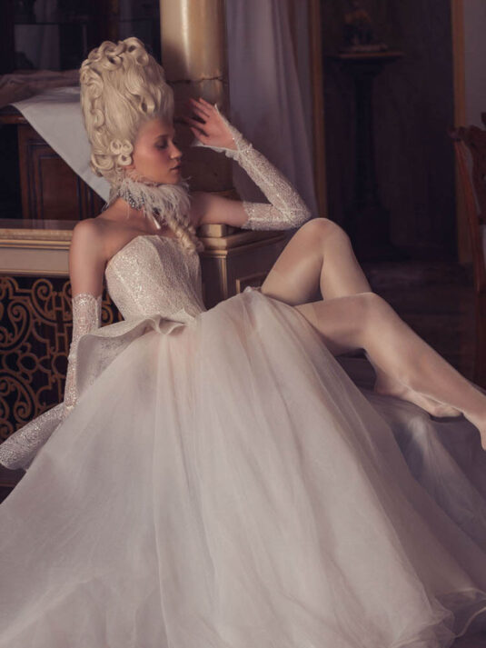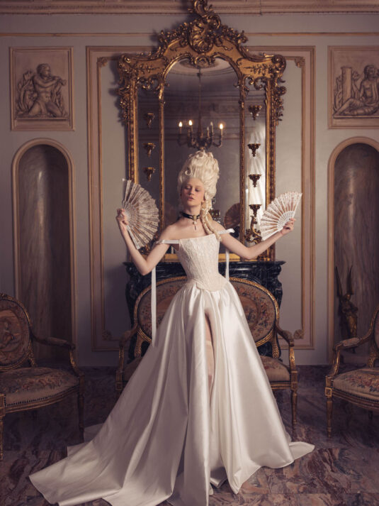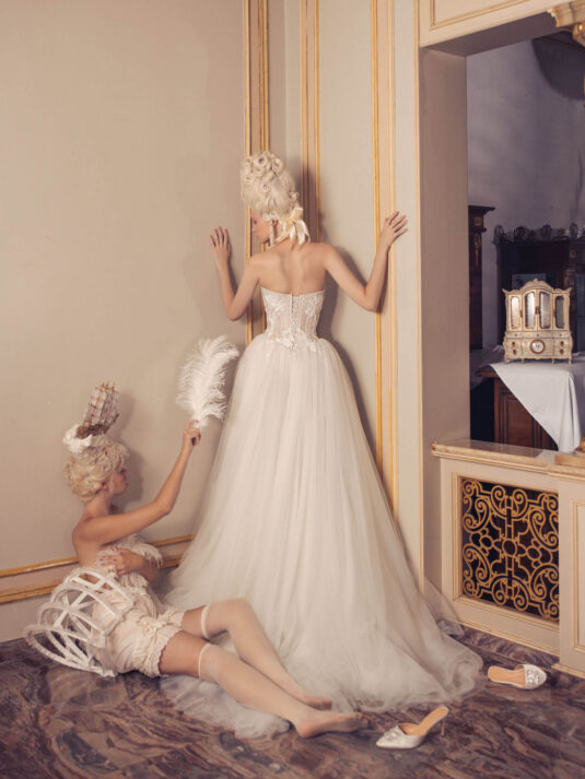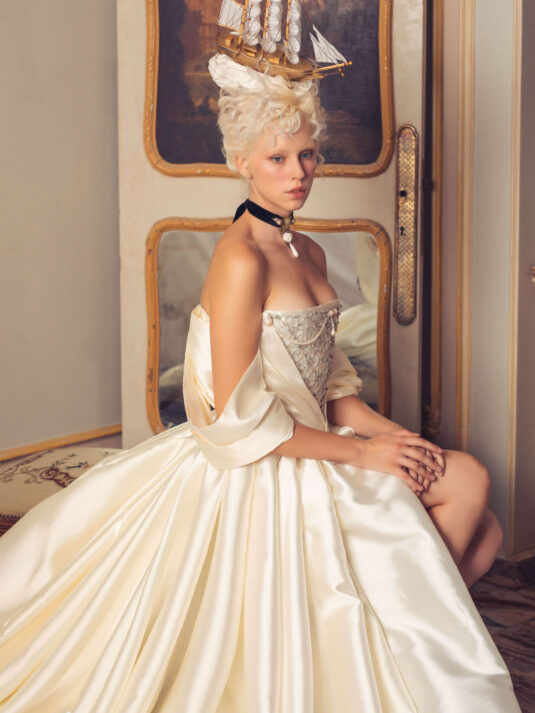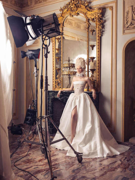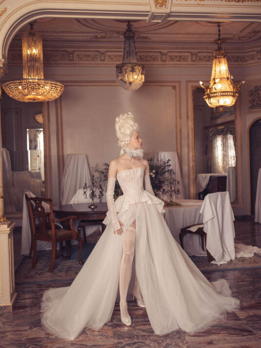 “Your Majesty” delves into the iconic undergarment ensemble of Marie Antoinette, reimagining luxurious corsets, chemises, panniers, bloomers, and petticoats into a stunning collection of 13 bridal gowns. More than ever, this collection celebrates the philosophy of ‘more is more,’ embracing avant-garde designs and an extravagance that encapsulates the true essence of royalty. The campaign portrays an exaggerated scene where the Queen and her entourage prepare for a lavish event, setting the stage for the opulence that awaits.