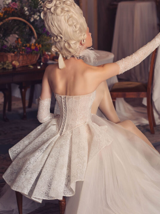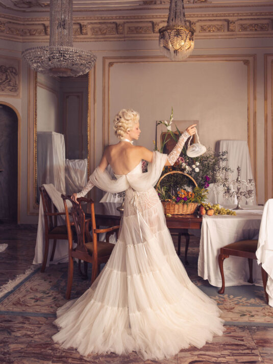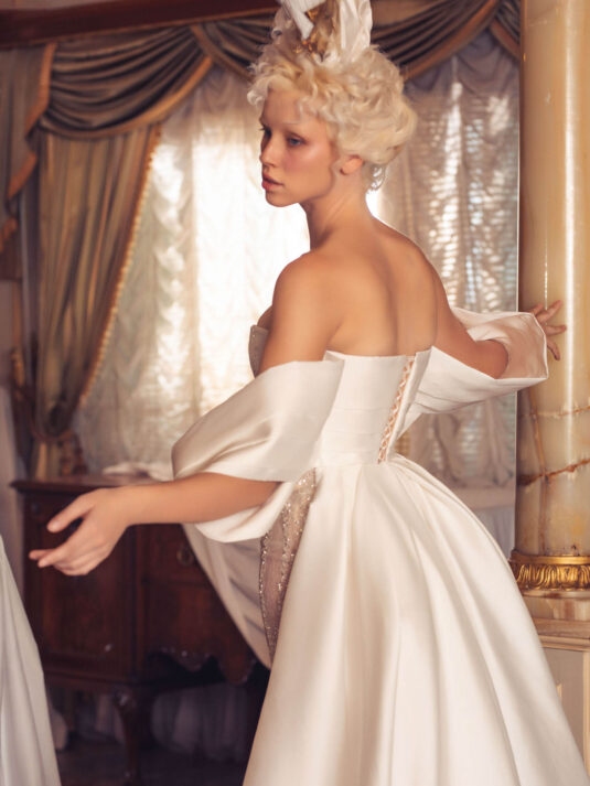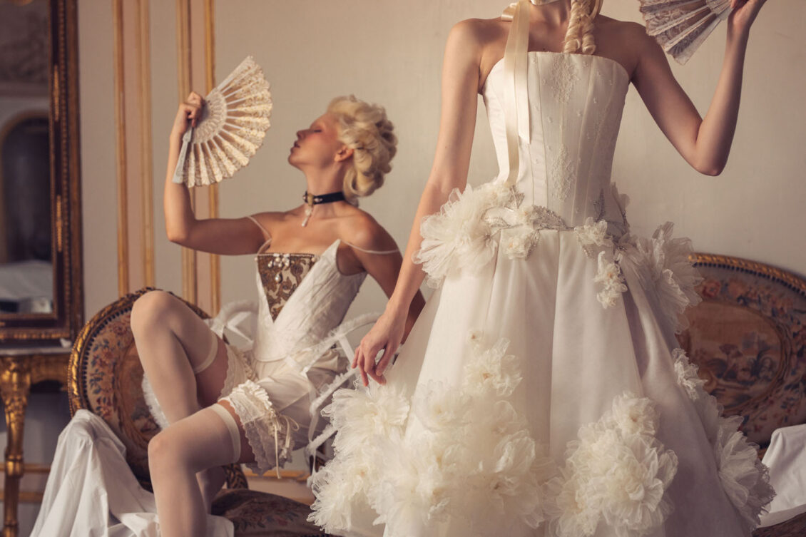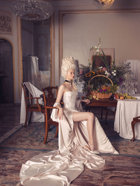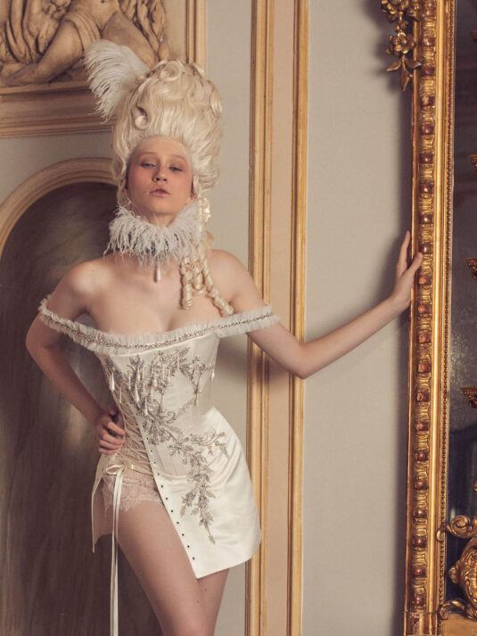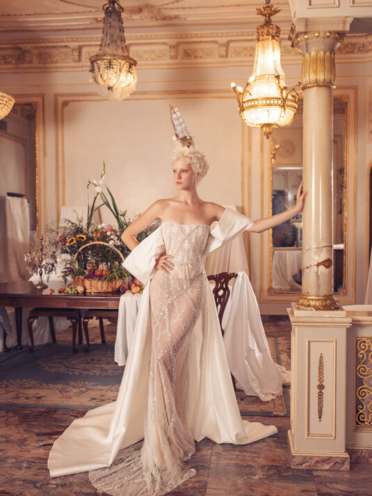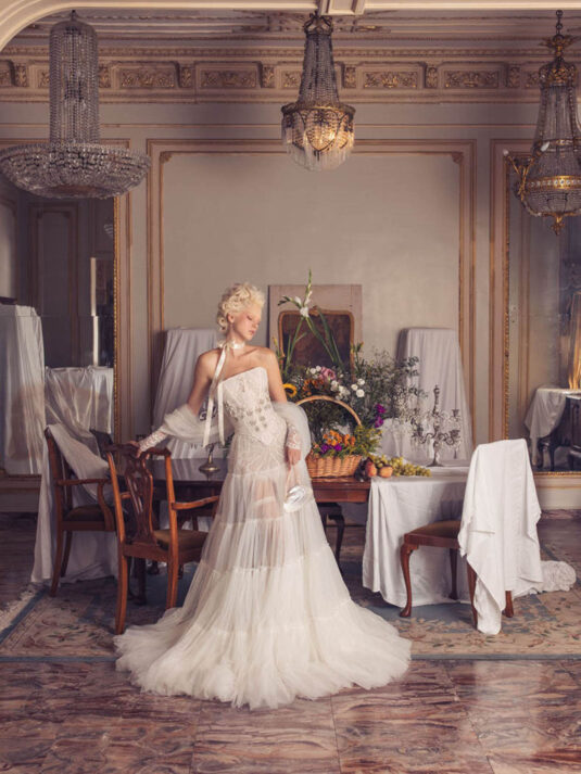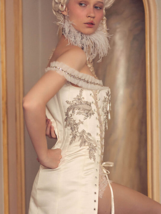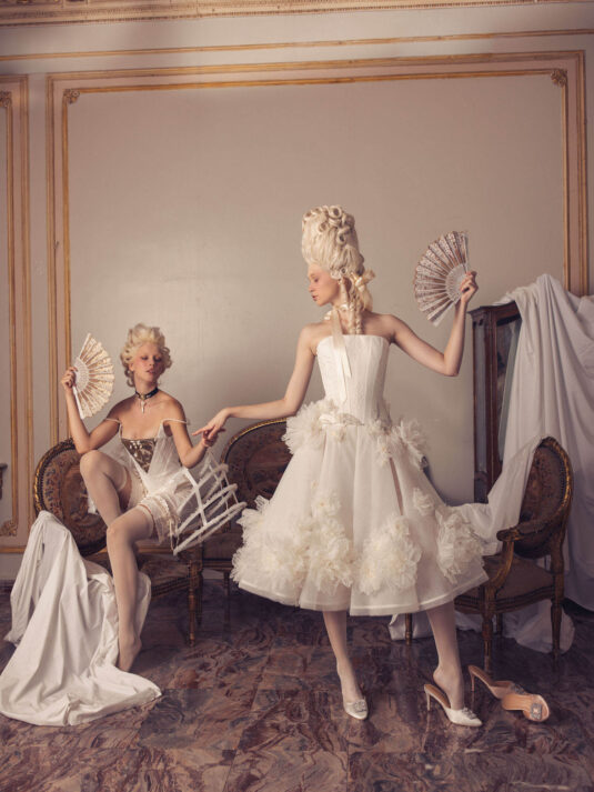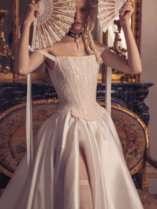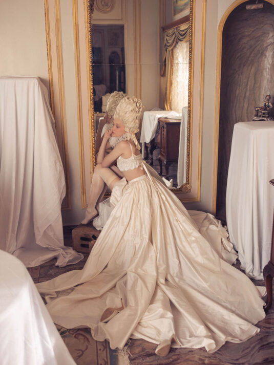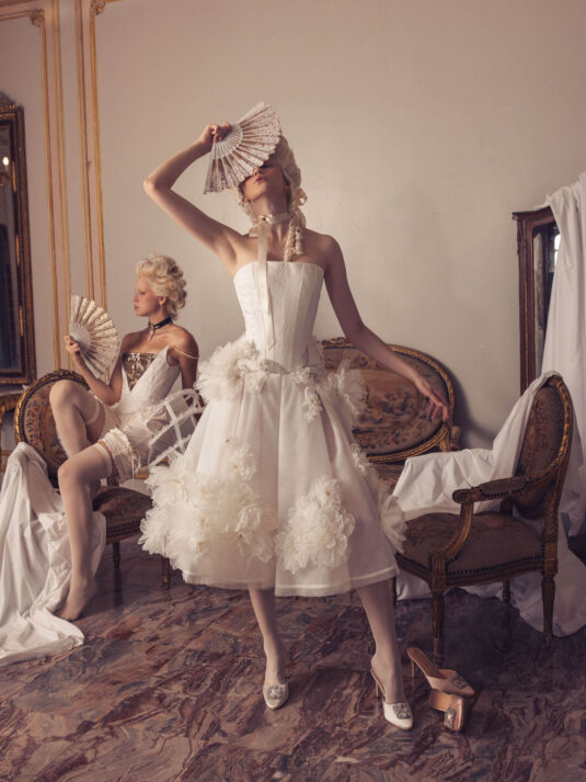 “Your Majesty” delves into the iconic undergarment ensemble of Marie Antoinette, reimagining luxurious corsets, chemises, panniers, bloomers, and petticoats into a stunning collection of 13 bridal gowns. More than ever, this collection celebrates the philosophy of ‘more is more,’ embracing avant-garde designs and an extravagance that encapsulates the true essence of royalty. The campaign portrays an exaggerated scene where the Queen and her entourage prepare for a lavish event, setting the stage for the opulence that awaits.